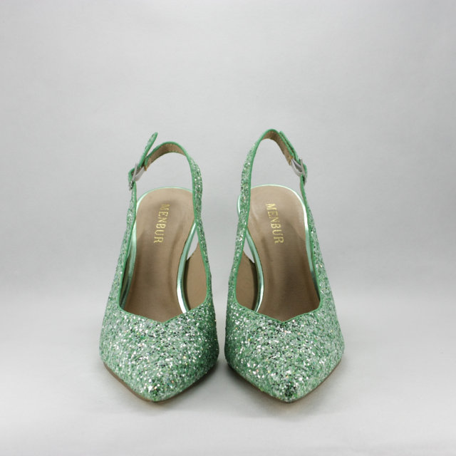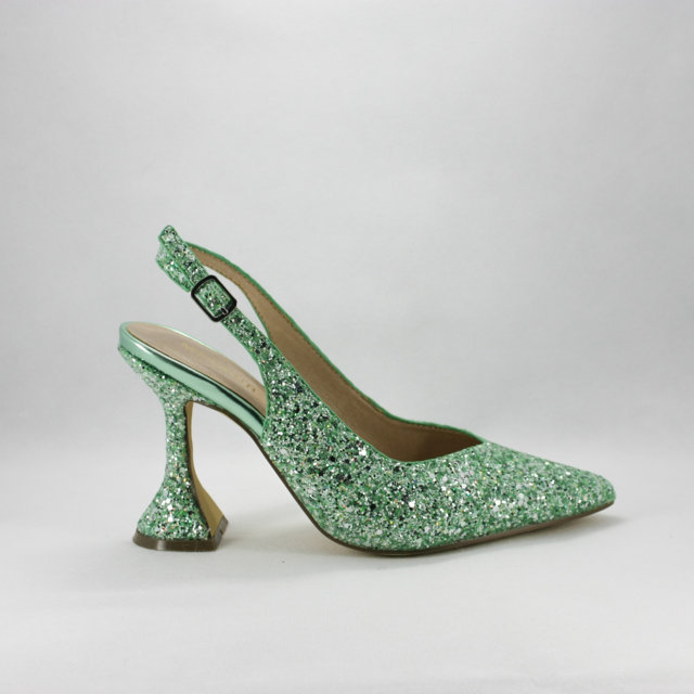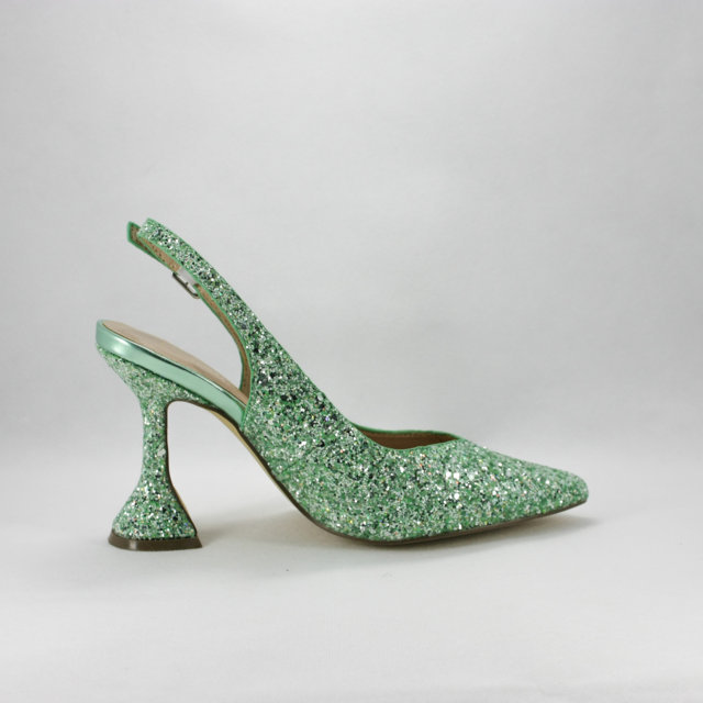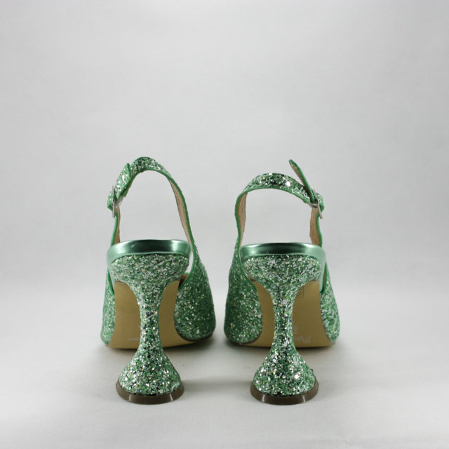 Sandalo cerimonia donna elegante e particolare con tacco a rocchetto realizzato in tessuto glitter verde chiaro luminoso.