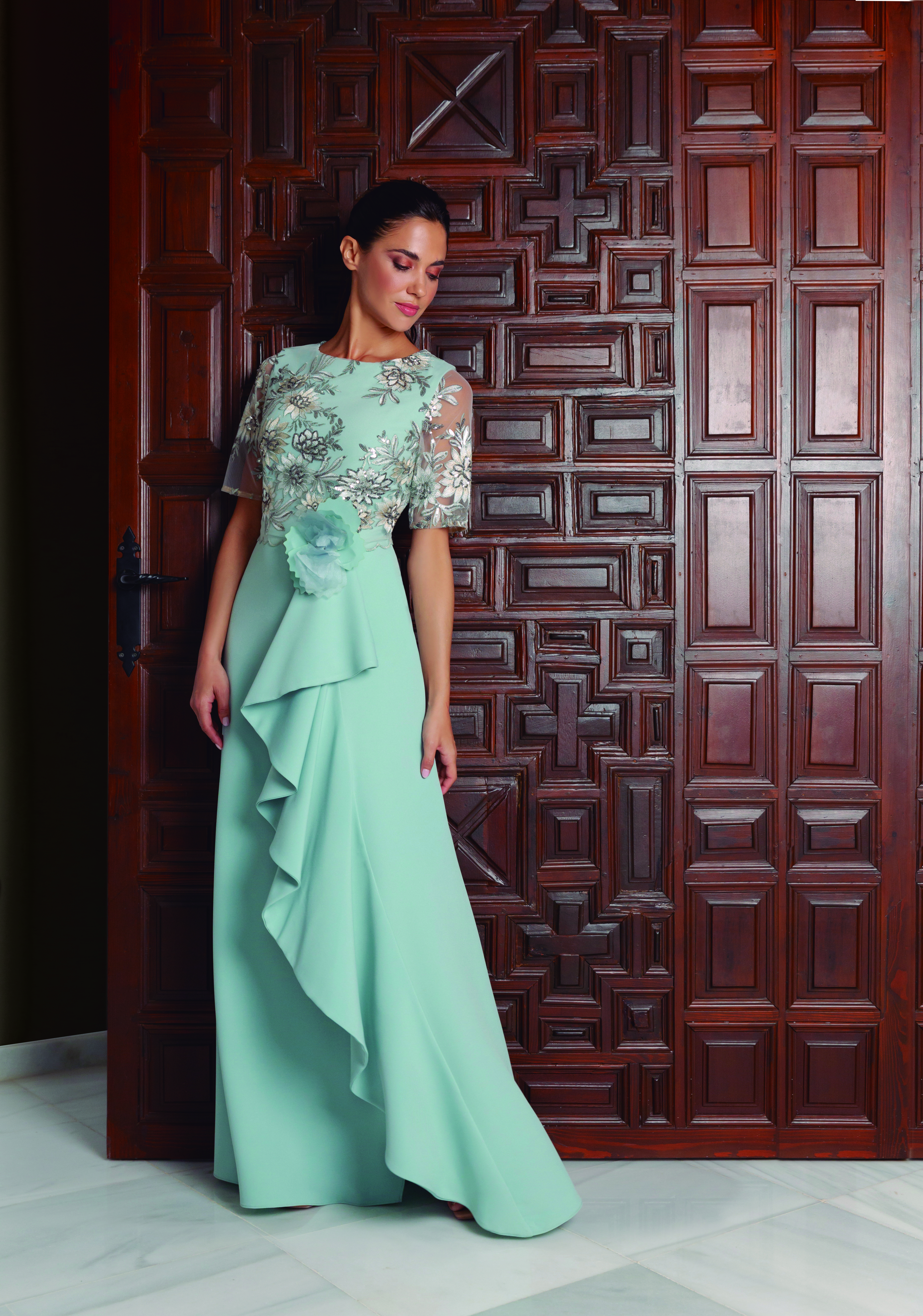 Abito cerimonia donna lungo color verde chiaro con corpetto pizzo ricamato color verde/avorio/beige con maniche, realizzato in tessuto crepe cady, decorato con particolari rouges sulla gonna.