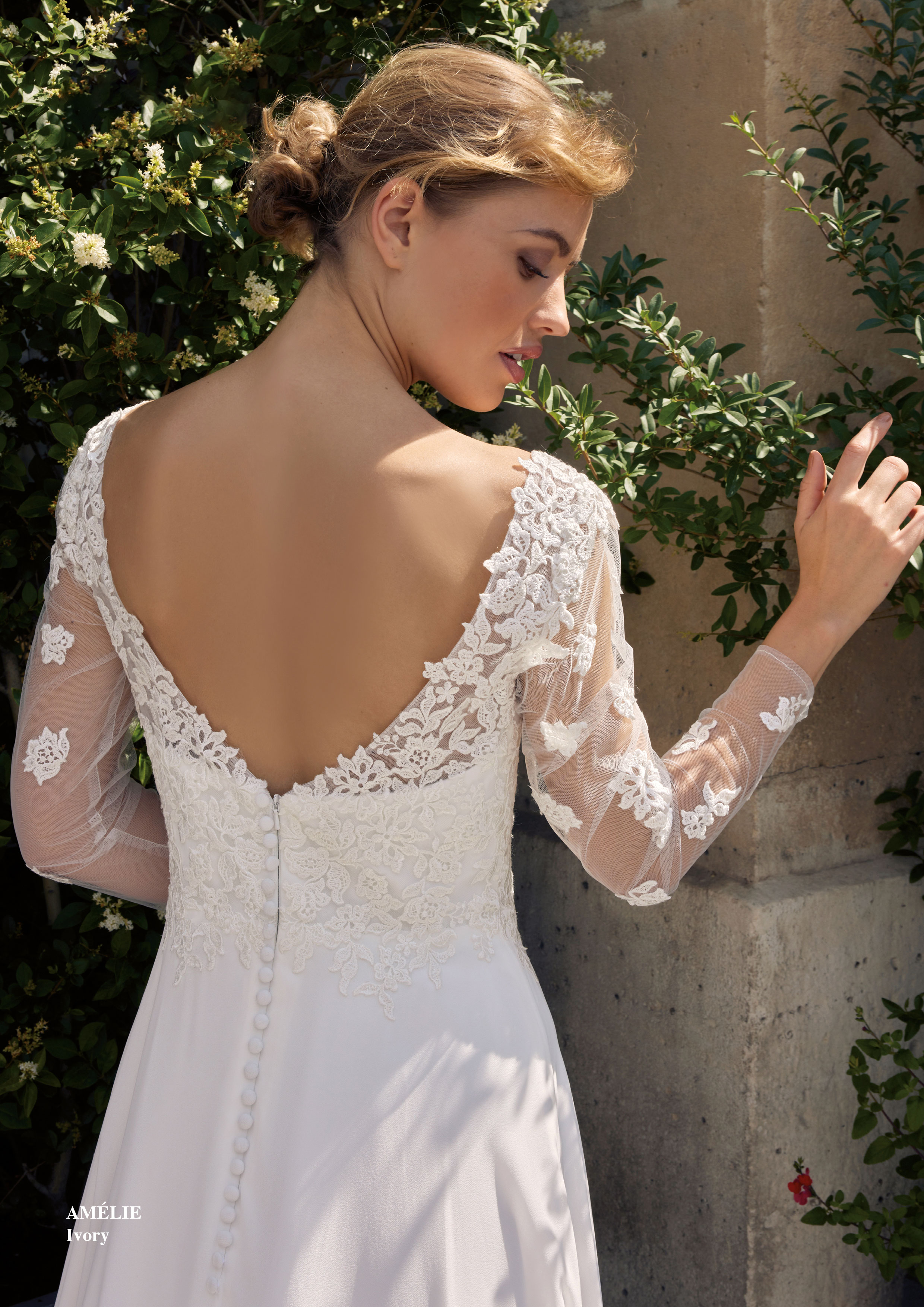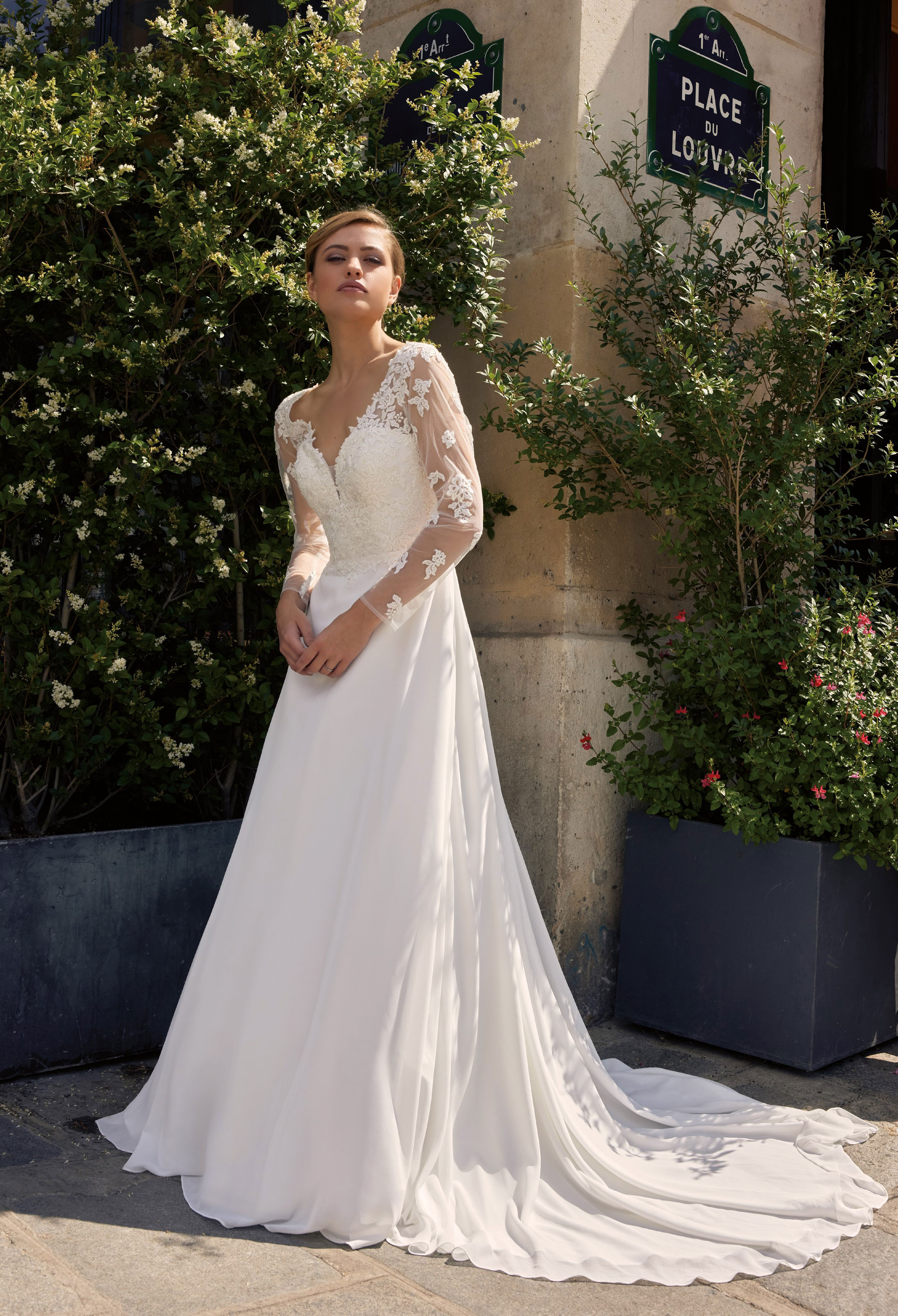 Abito sposa scivolato dalla linea morbida realizzato con corpetto pizzo con maniche lunghe in traparenza e gonna di morbidissimo chiffon.