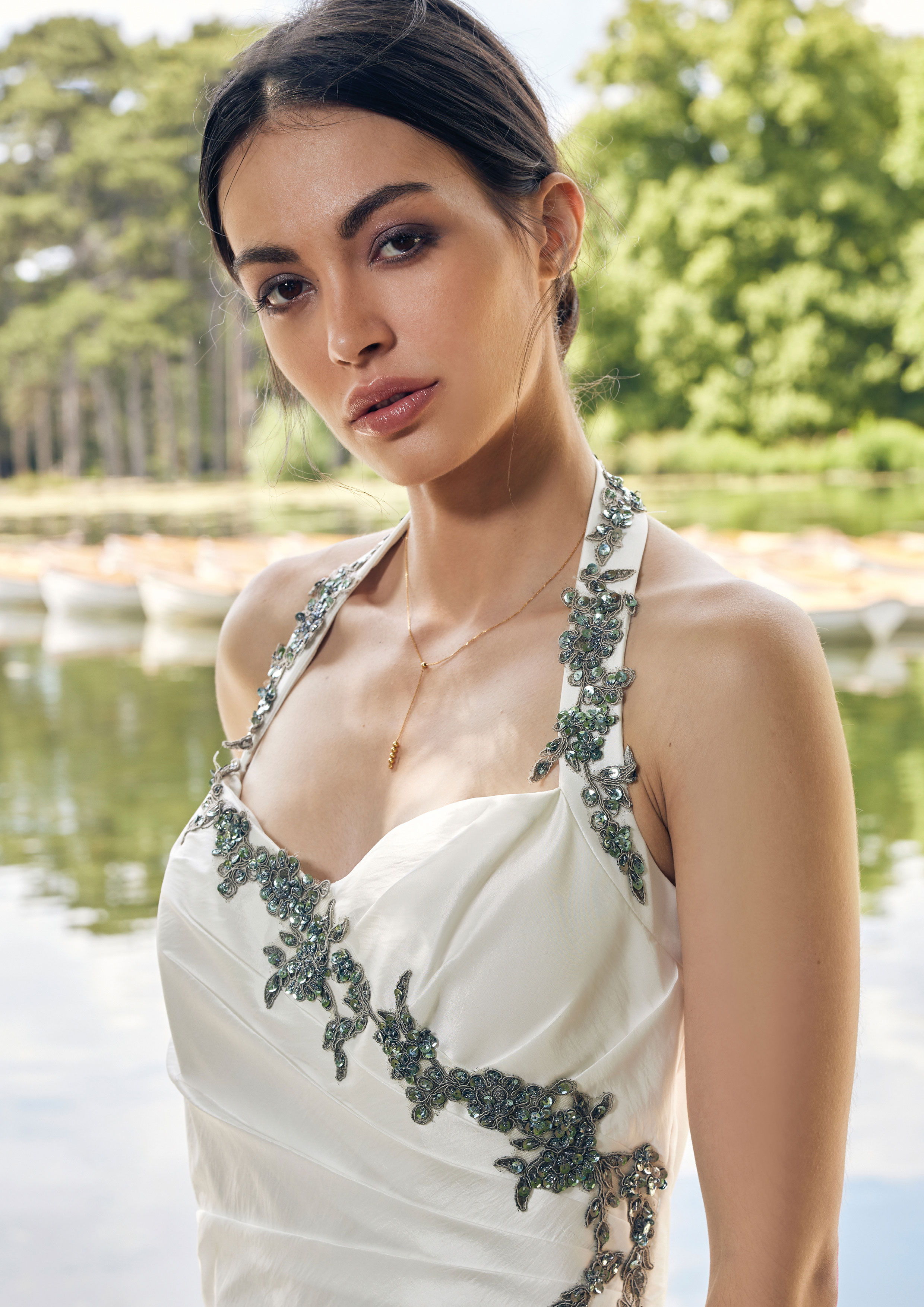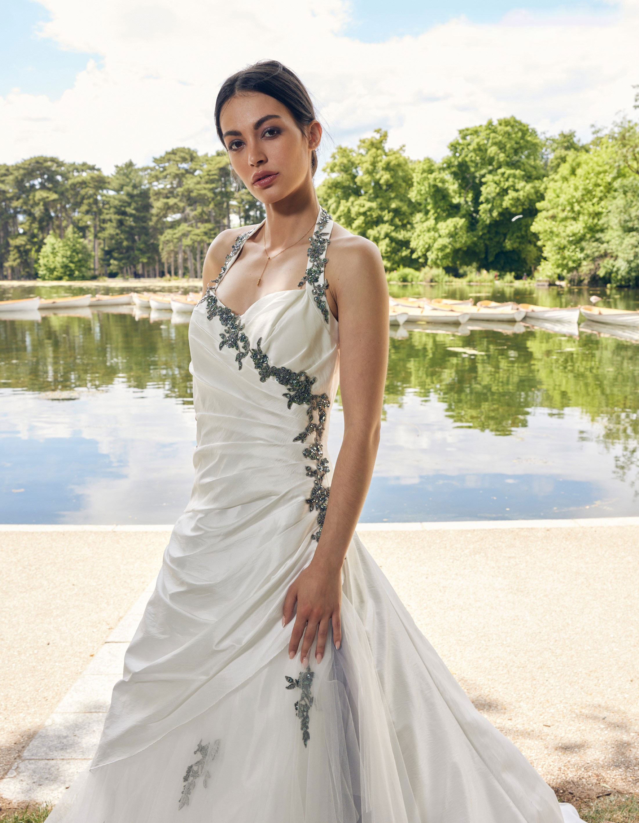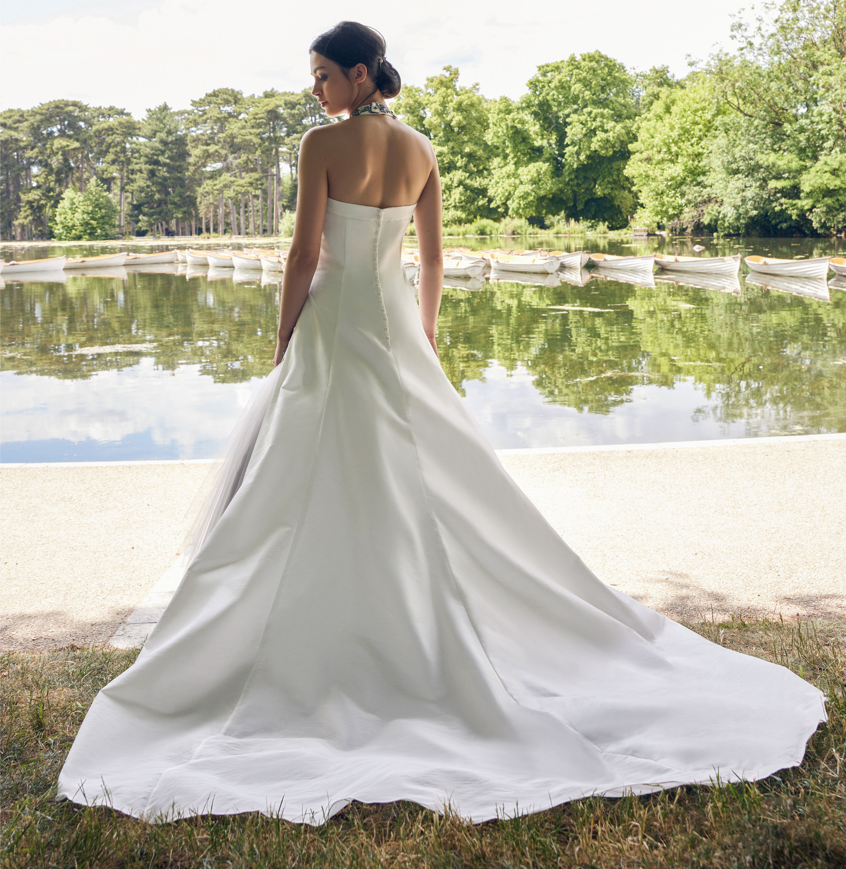 Abito sposa dalla linea a redingote con scollatura a cuore realizzato in tessuto di taffetà, disponibile nella variante avorio tono su tono, personalizzabile con il tuo colore preferito.
