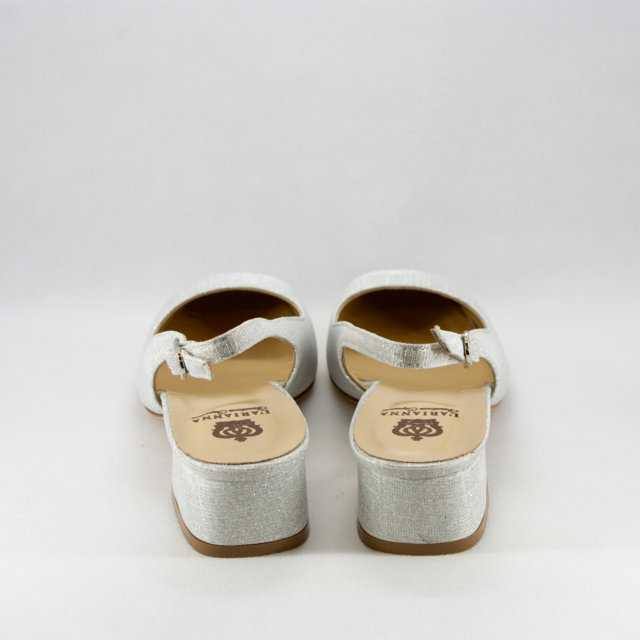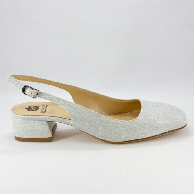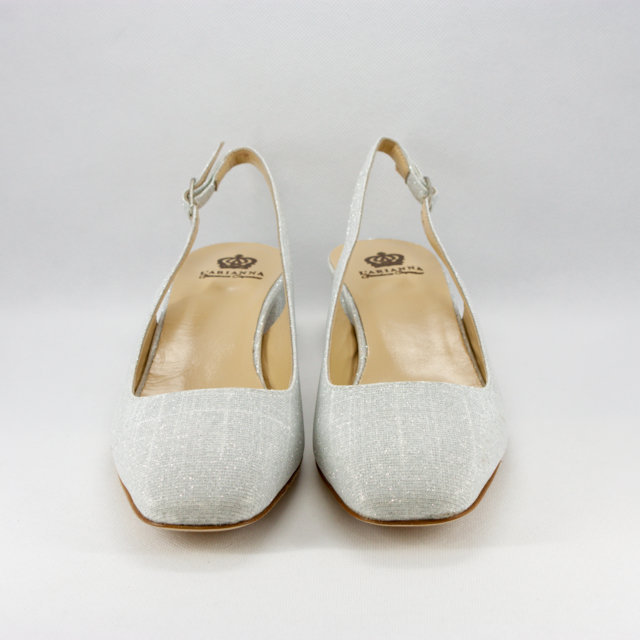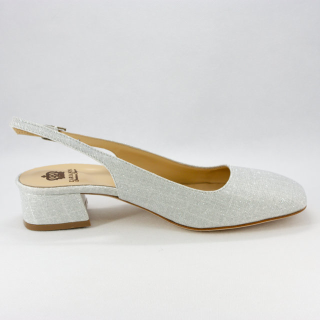 Scarpe cerimonia donna/sposa eleganti realizzate con tacco largo in micro glitter argento e cinghietta regolabile alla caviglia.