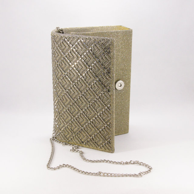 Pochette cerimonia donna realizzata in tessuto microglitter luminoso bronzo, con decoro impreziosito da strass tono su tono e catenella.