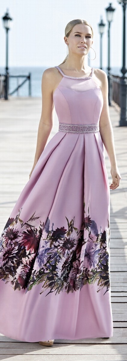 Particolare abito cerimonia donna lungo color rosa antico in fantasia con scollatura in trasparenza e impreziosito in vita da ricamo tono su tono realizzato in tessuto di organza e raso.