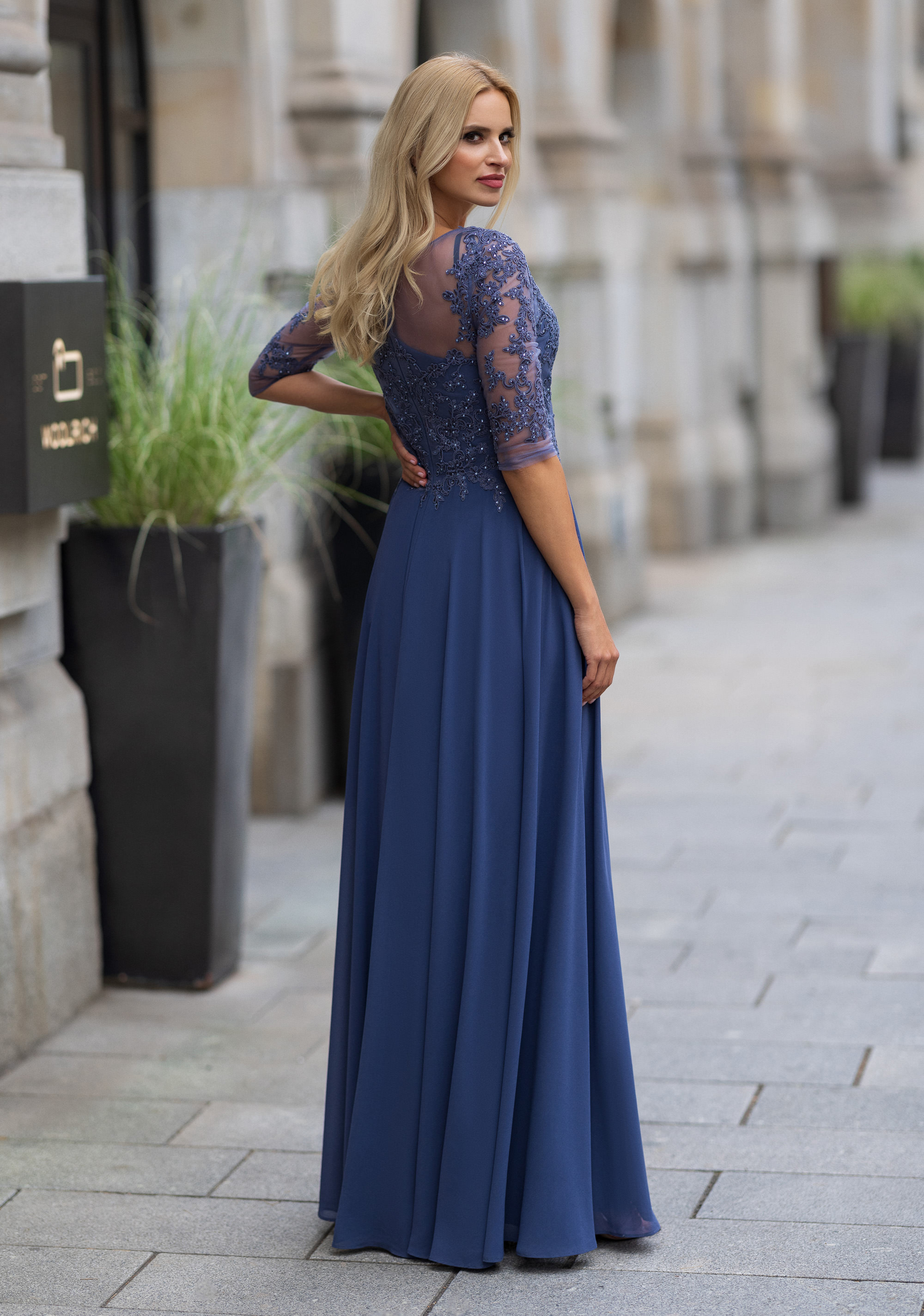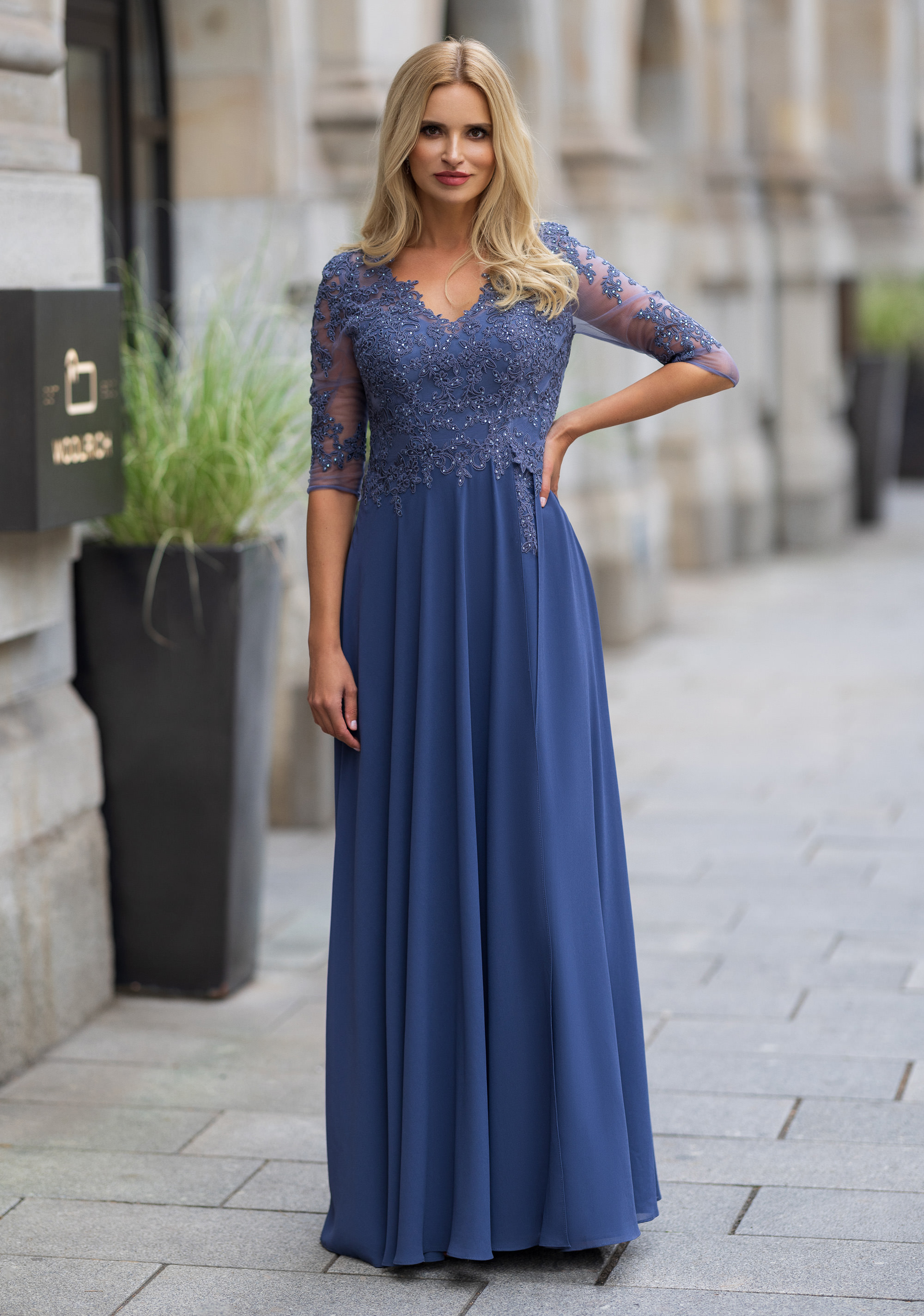 Abito cerimonia donna curvy lungo realizzato in tessuto di chiffon con corpetto pizzo ricamato in trasparenza e manica 3/4 colo blu indigo.