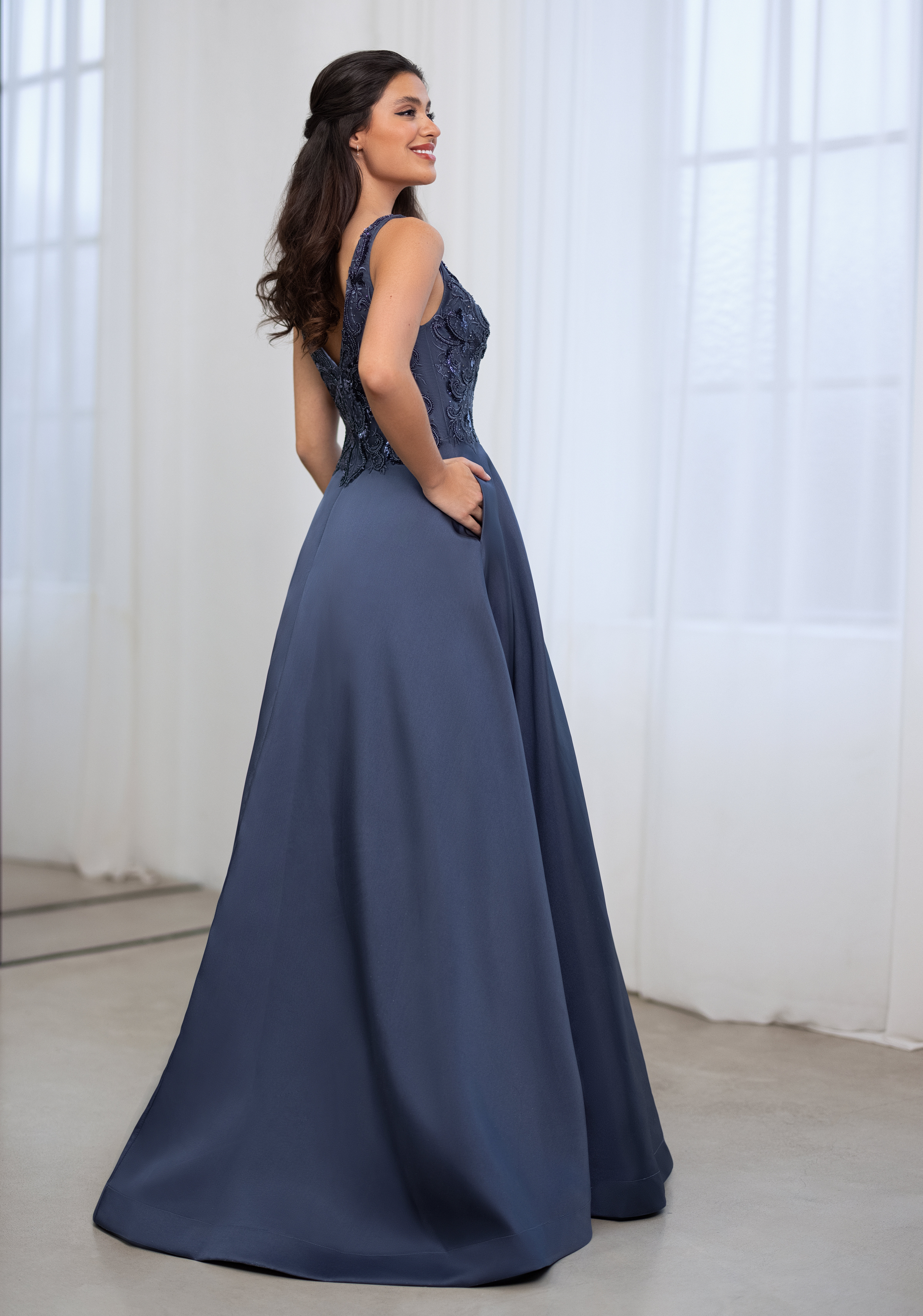 Abito cerimonia donna lungo blu realizzato con corpetto in pizzo ricamato e gonna in tessuto di mikado con leggera coda.