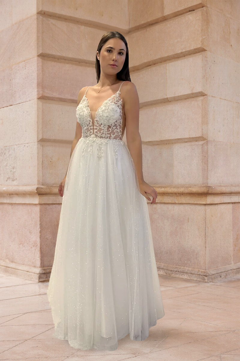 Abito sposa con spallina sottile, corpetto in pizzo ricamato e particolare gonna in tulle glitter luminoso.