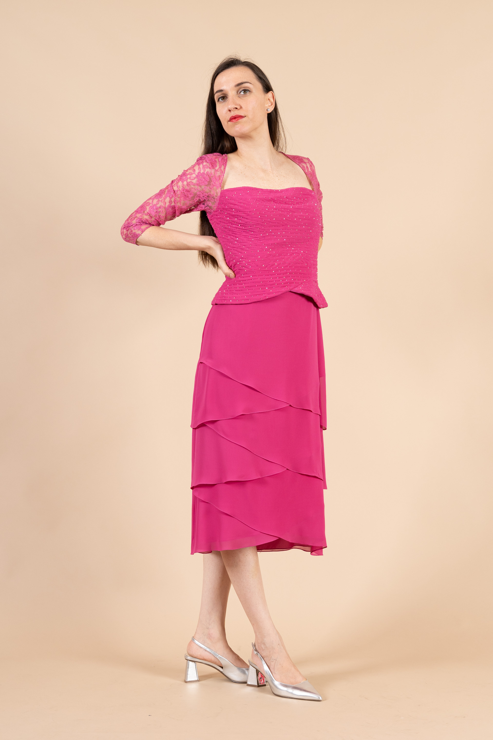 Abito cerimonia donna fuxia realizzato in tessuto chiffon e pizzo realizzato con corpetto drappeggiato, impreziosito da ricamo a perline argento e maniche lunghe in trasparenza di pizzo con gonna a balze.