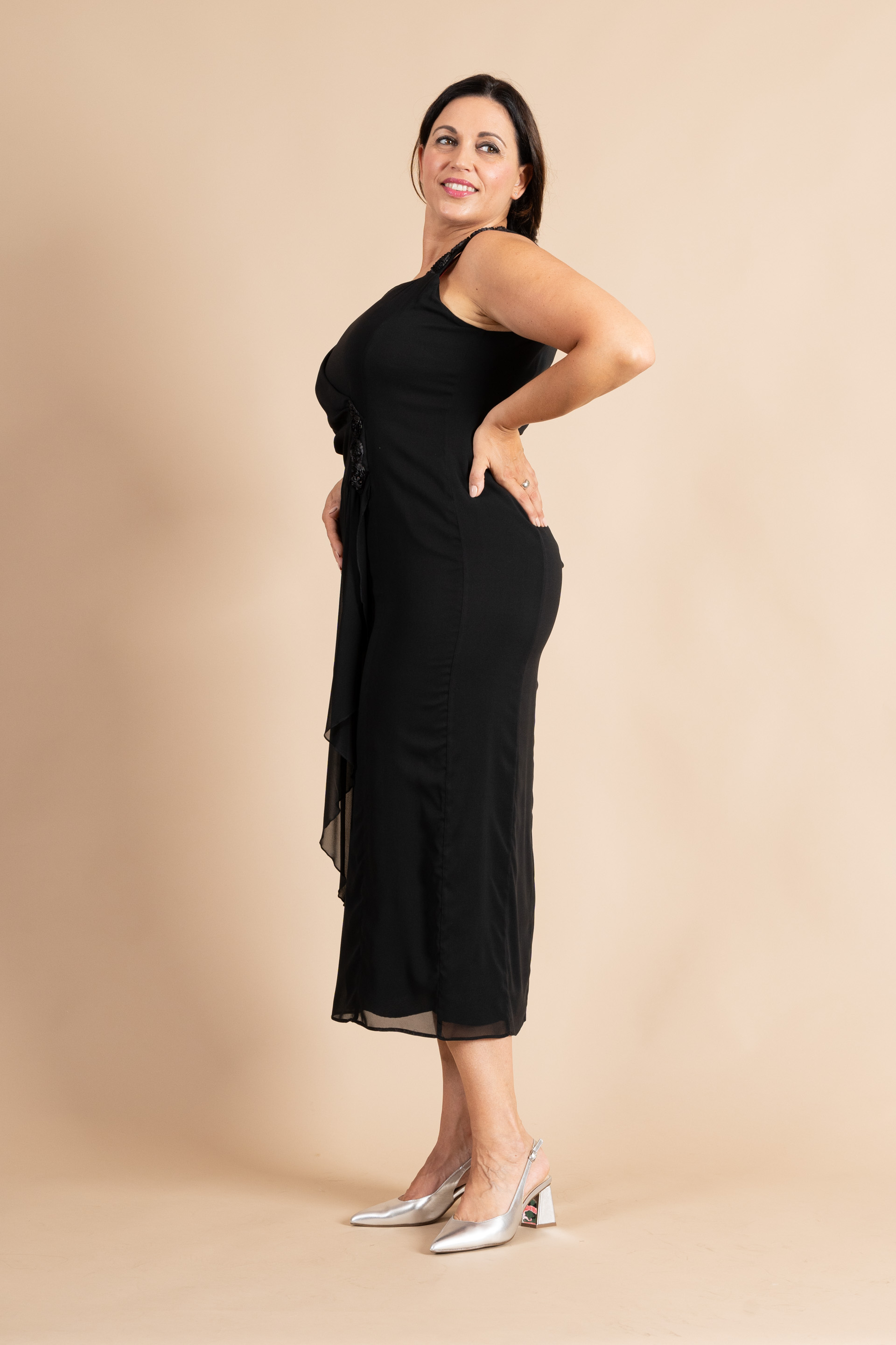 Abito cerimonia donna scivolato realizzato in chiffon di seta nero con spalline impreziosito da ricami floreali applicati sul drappeggio in vita, spalline e sulla stola.