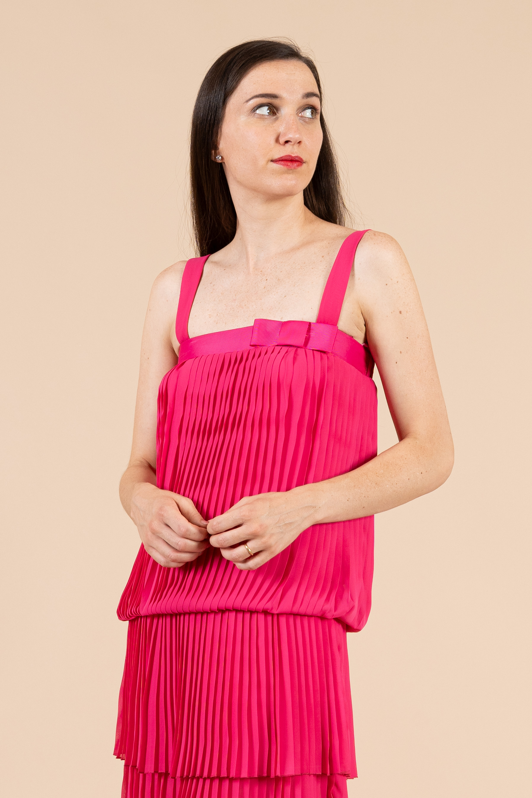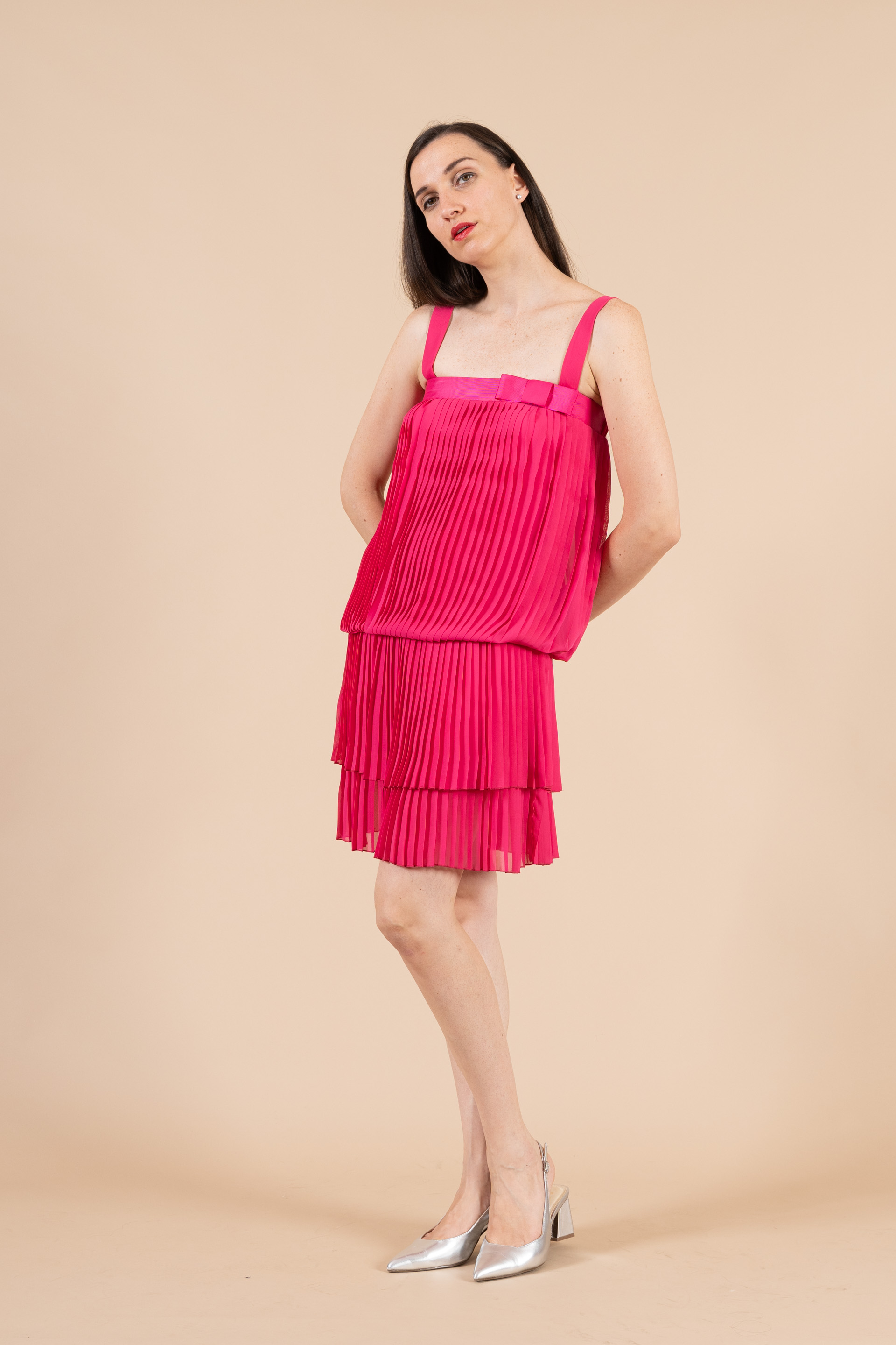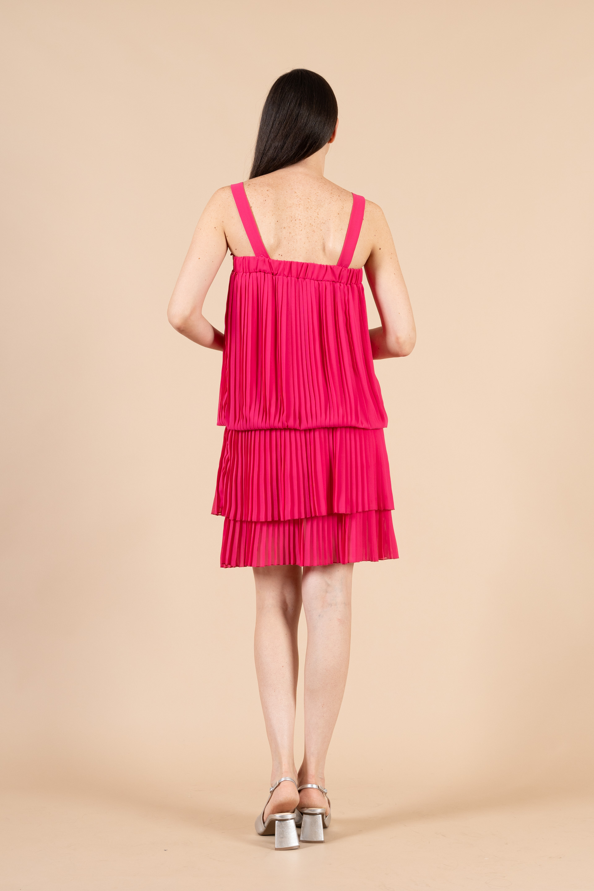 Abito cerimonia ragazza corto con gonna a balze in tessuto voile plissè fuxia con spalline.