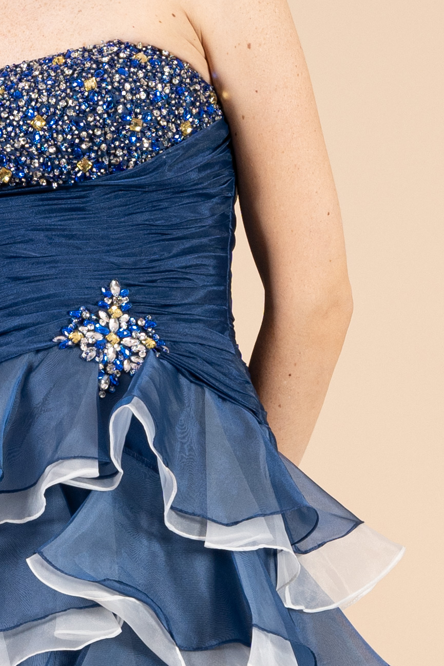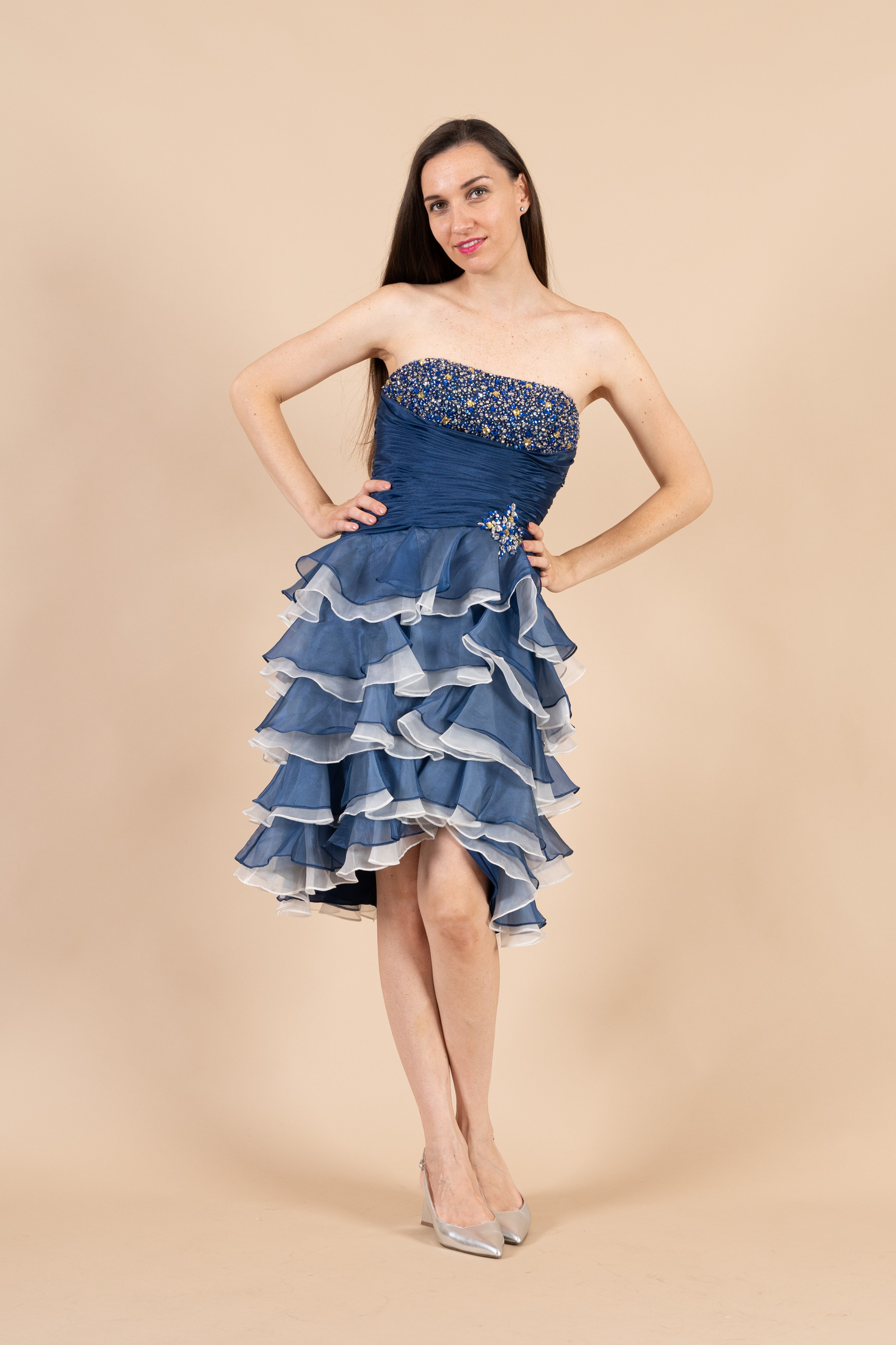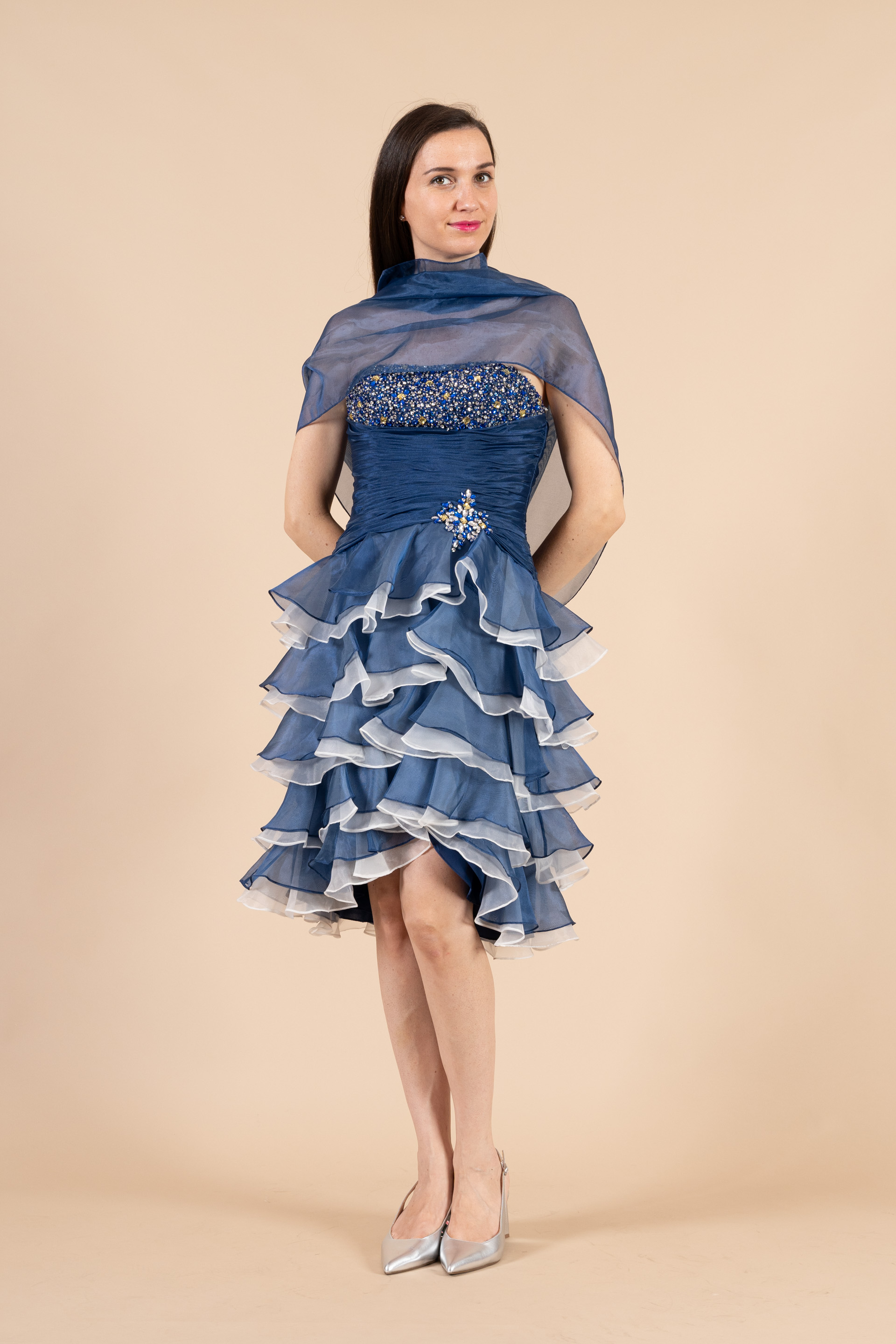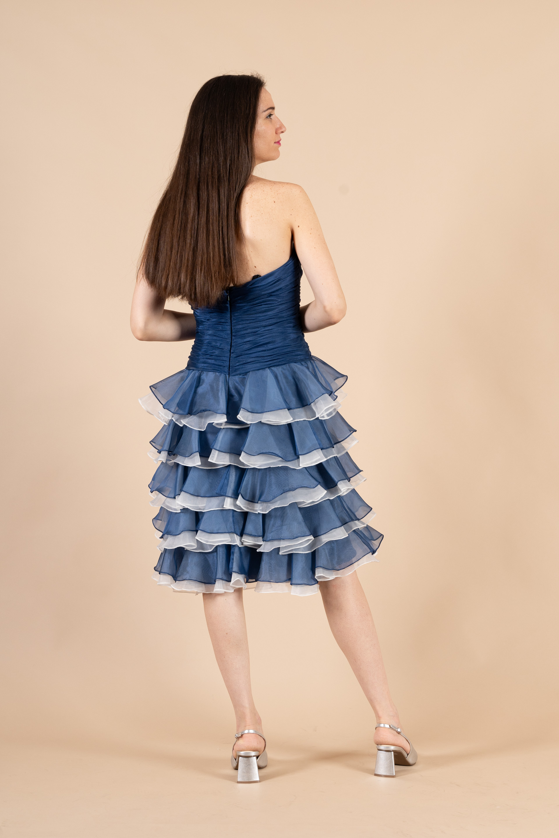 Particolare abito da cerimonia donna corto color blu/avorio realizzato in tessuto di organza con gonna a balze e corpetto drappeggiato e ricamato