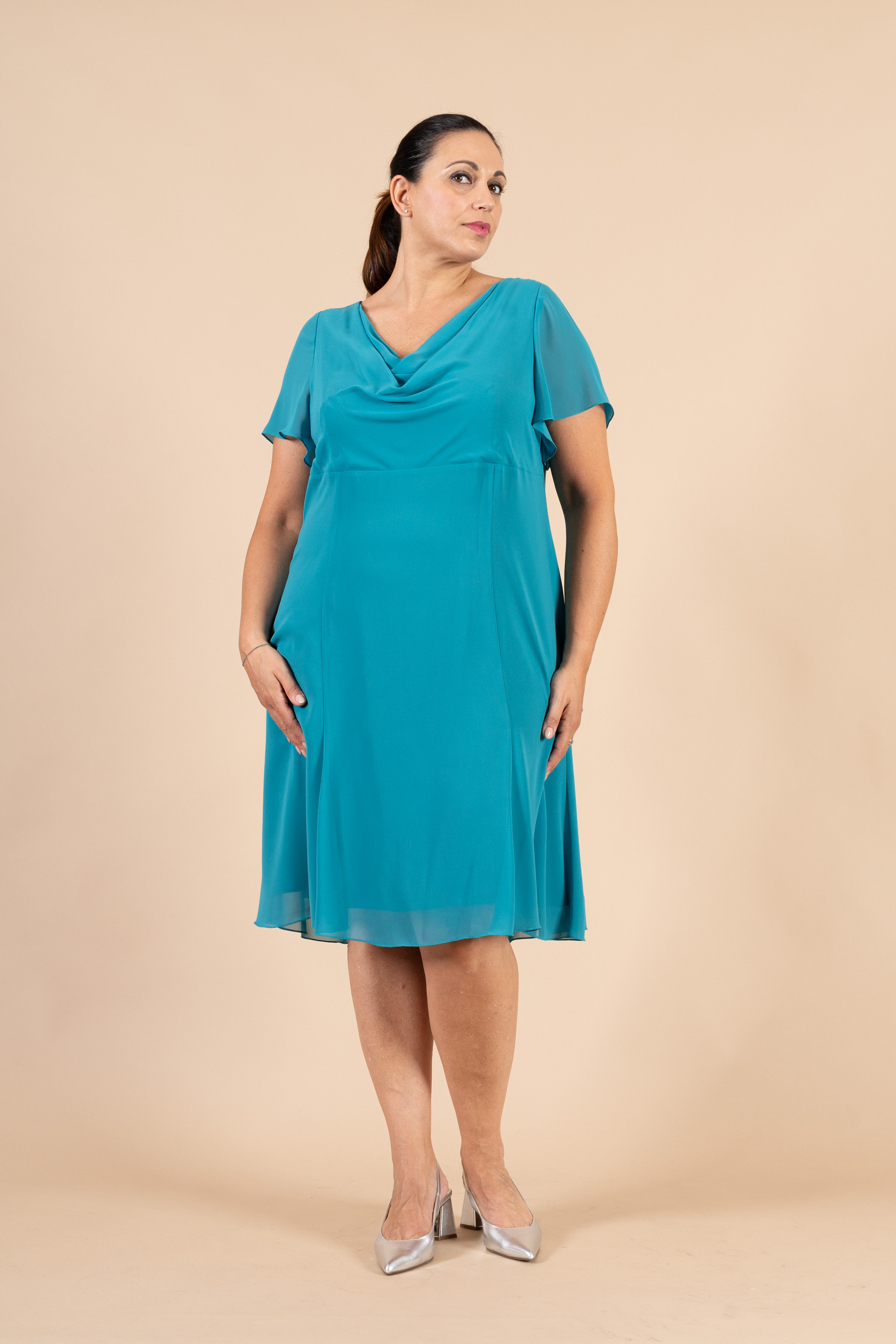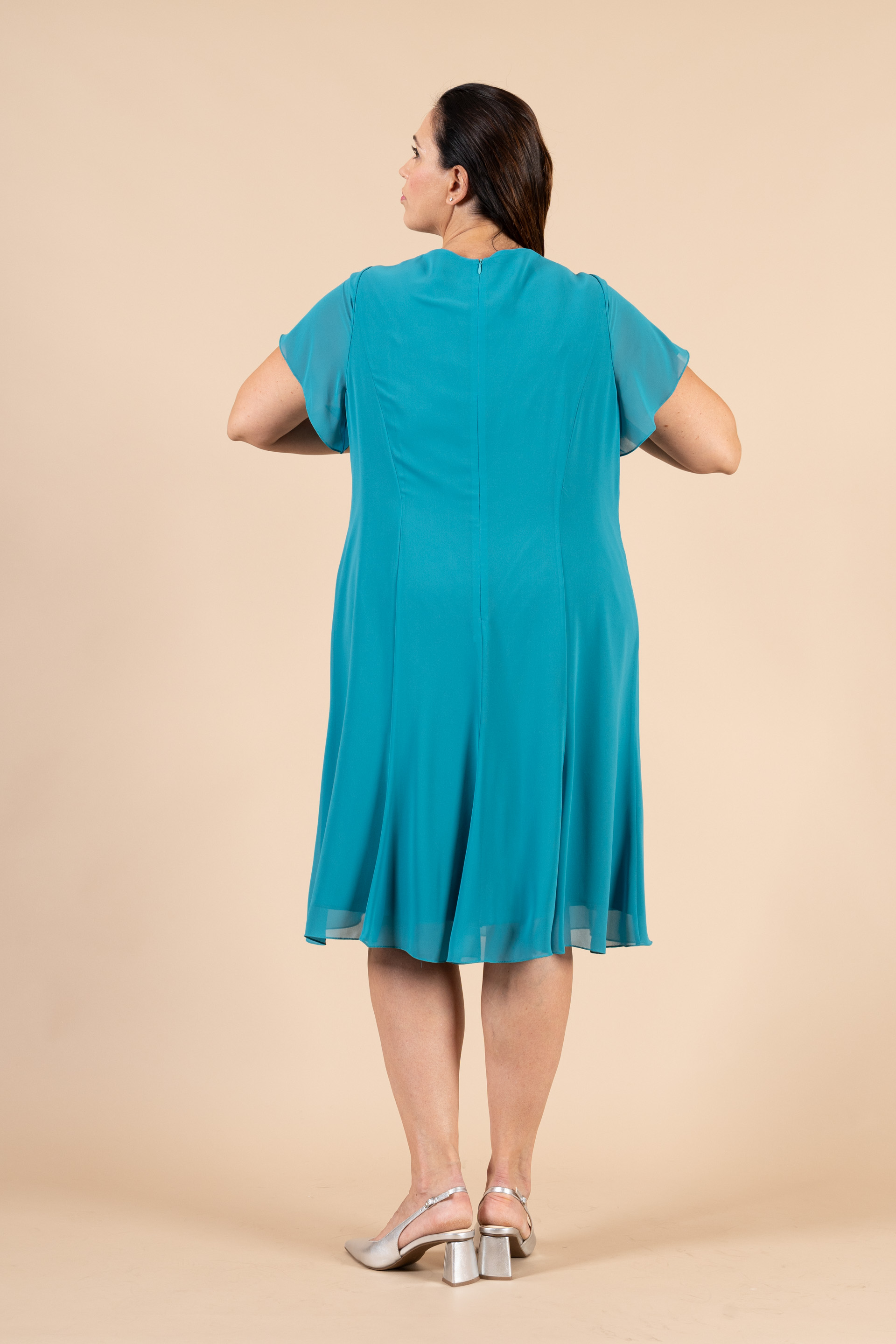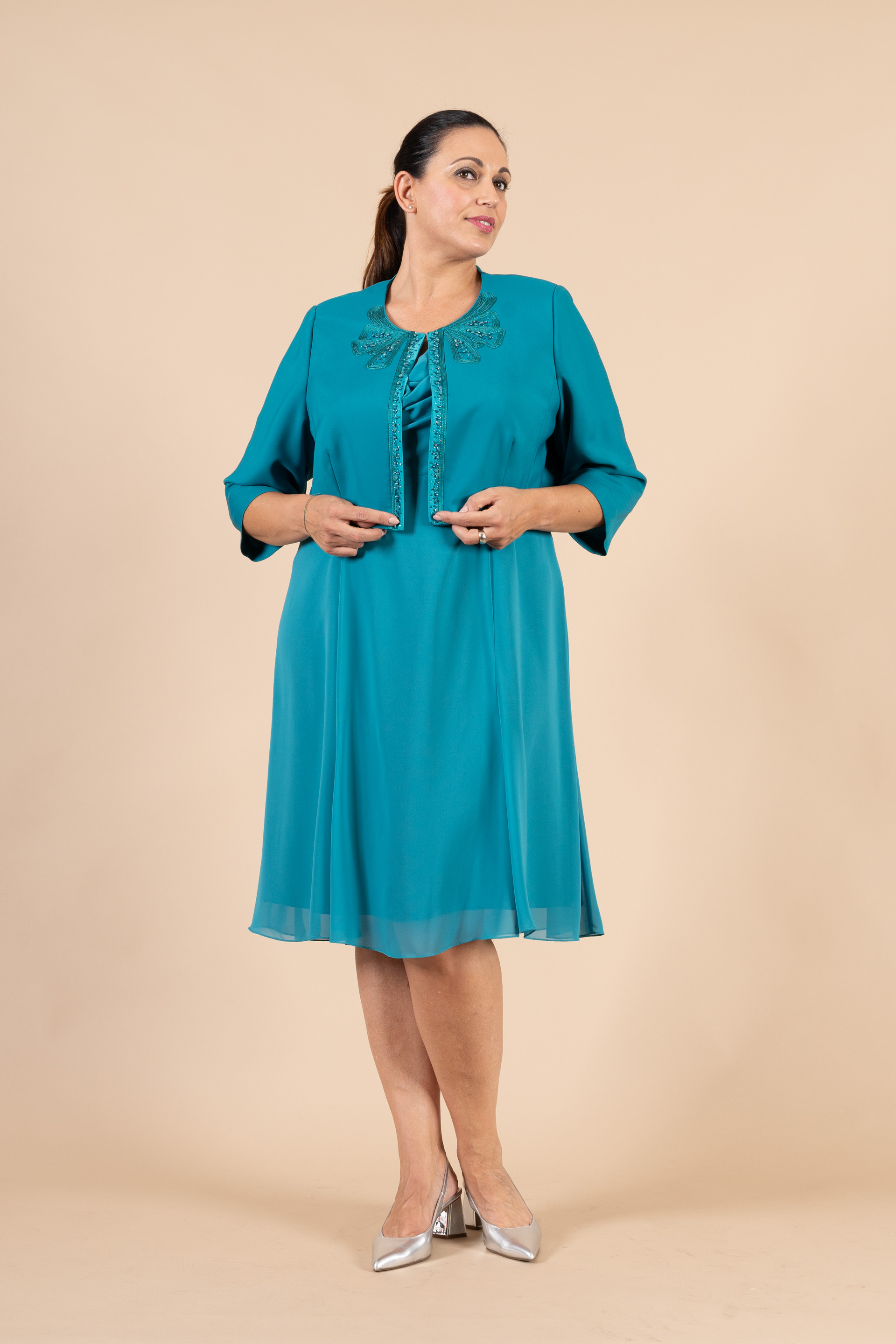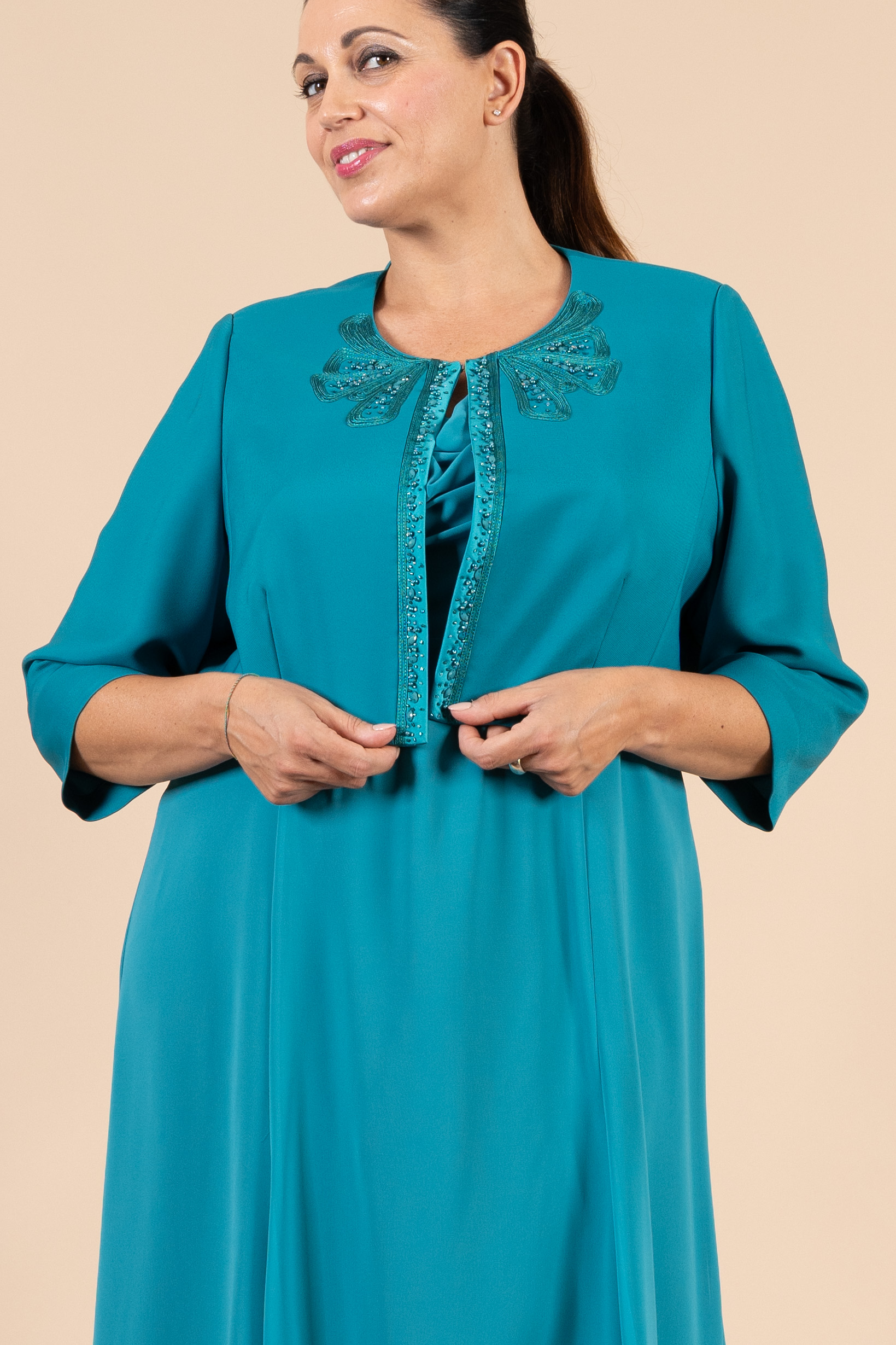 Completo cerimonia donna color verde ottanio, composto da giacca con ricamo realizzata in tessuto cady e abito liscio realizzato in morbito tessuto chiffon.