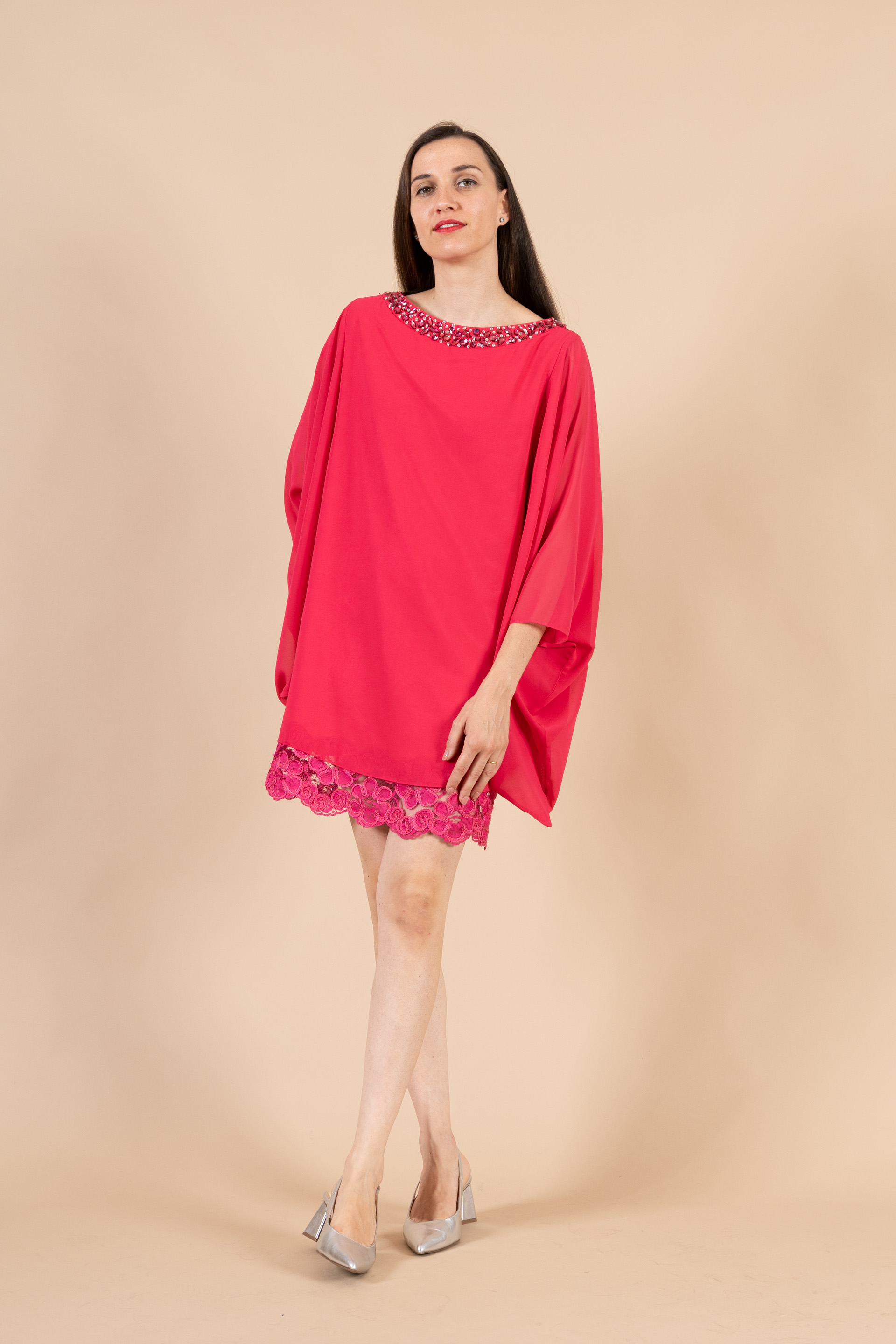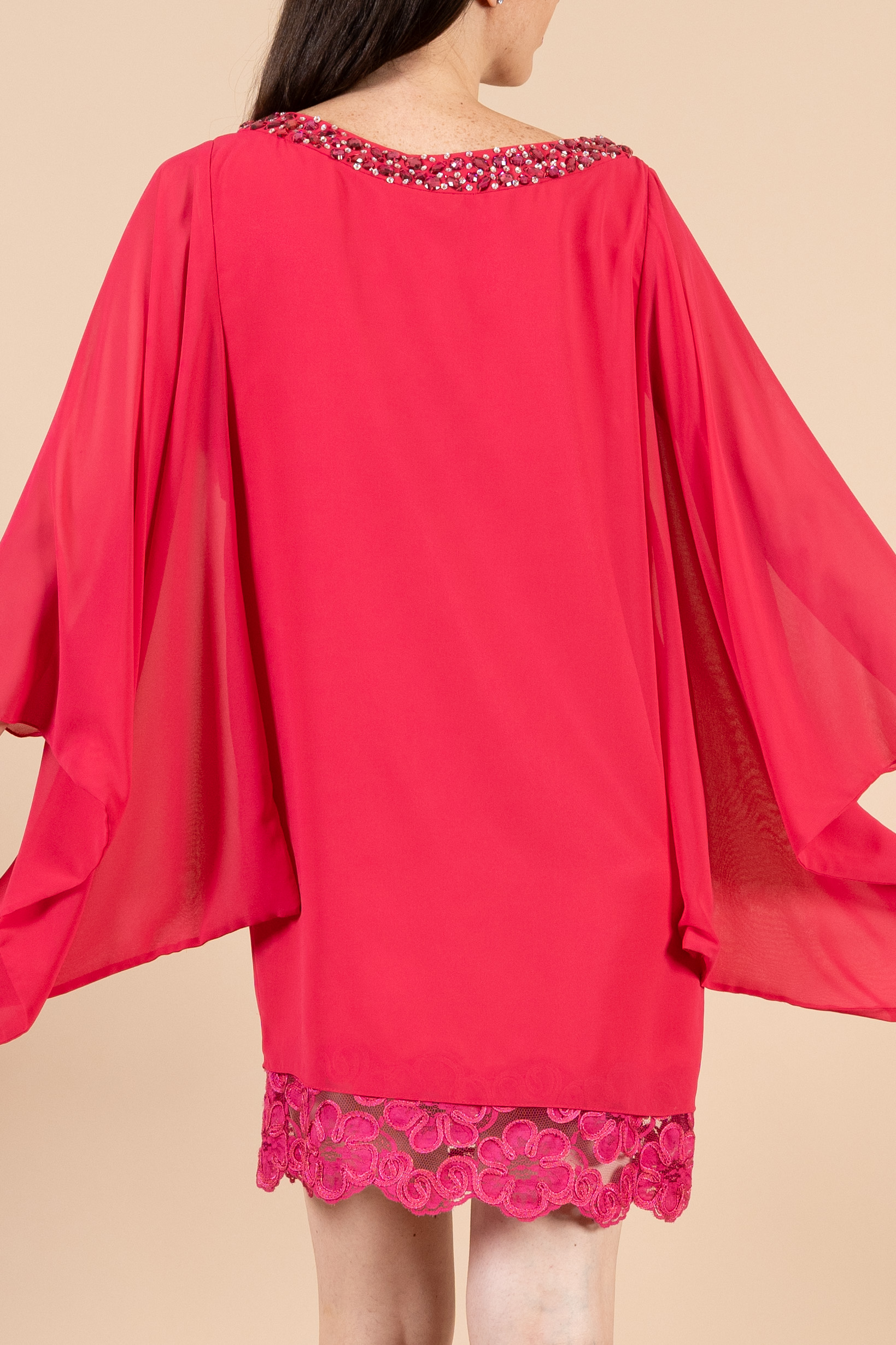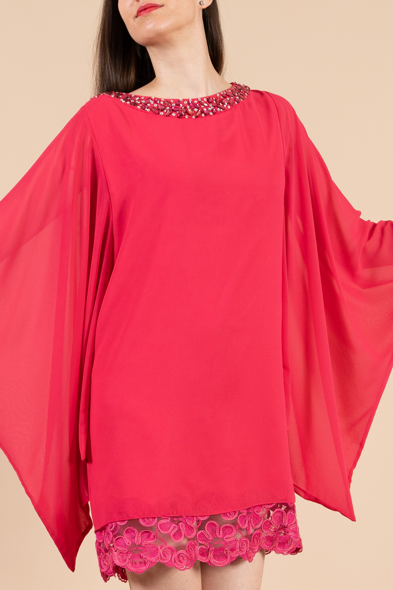 Particolare abito da cerimonia donna con maniche ampie a pipistello, realizzato in tessuto chiffon color fuxia impreziosito da ricamo sulla scollatura e pizzo.