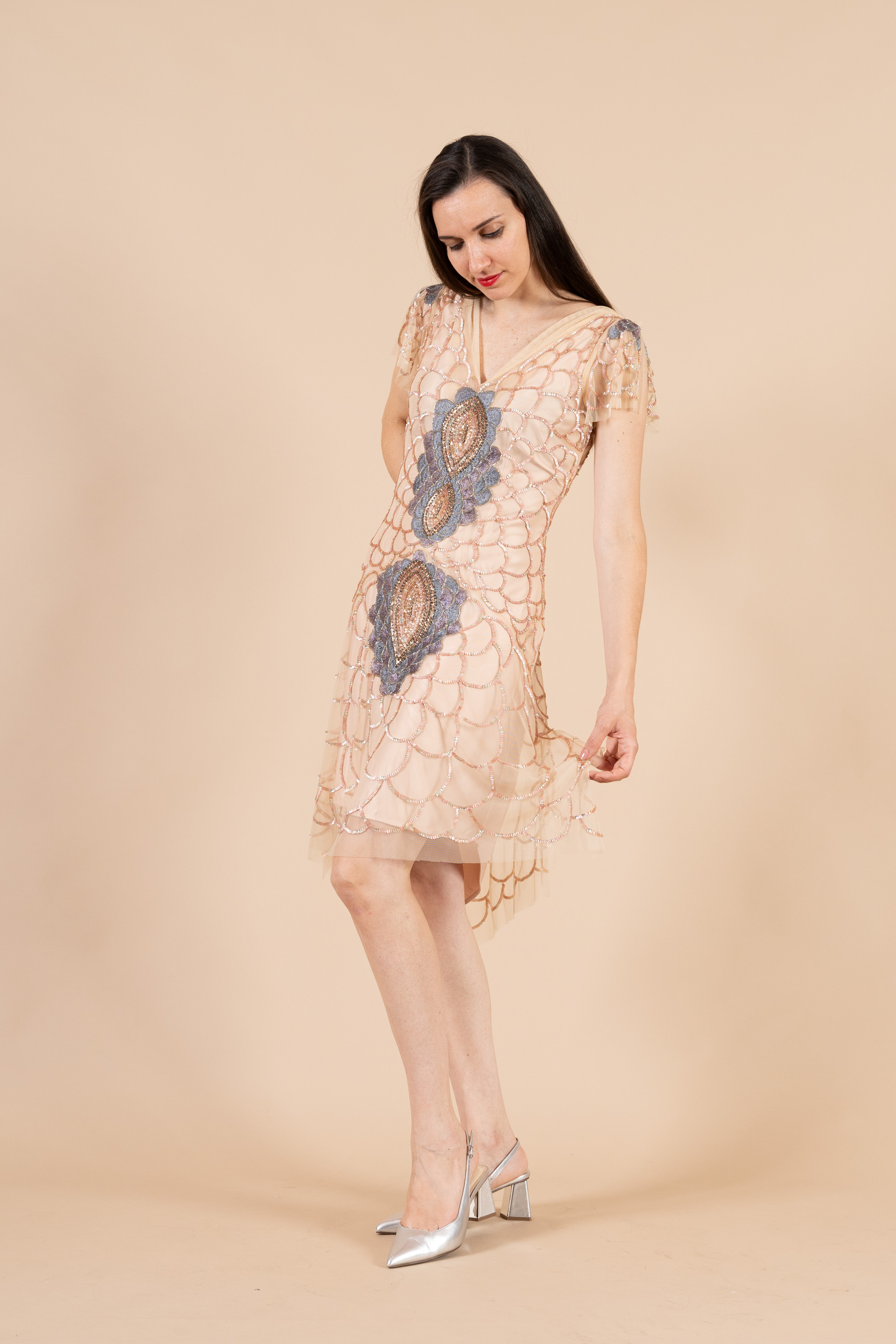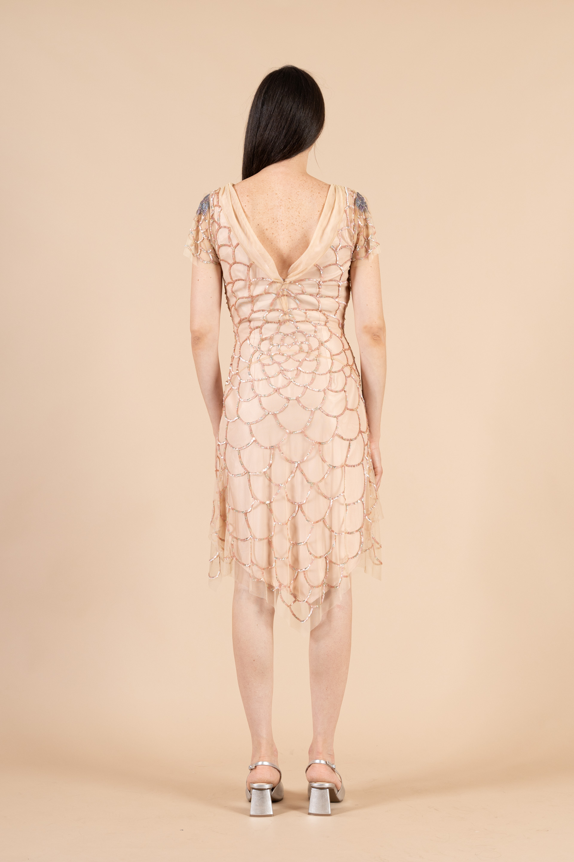 Raffinato abito cerimonia donna corto in color rosa cipria, realizzato in raso e tulle elegantemente ricamato con pailettes multicolore.