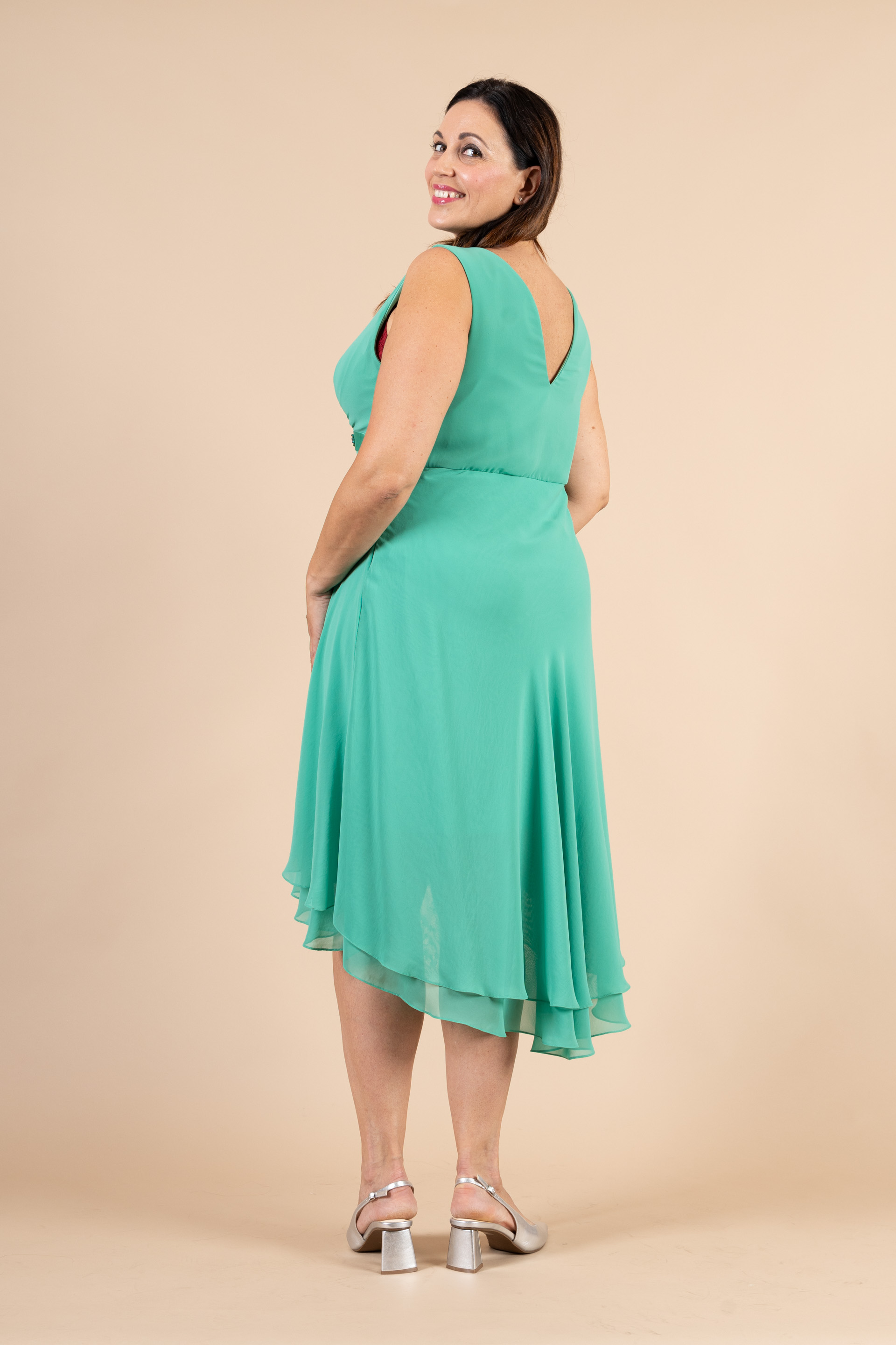 Abito smanicato cerimonia donna curvy asimmetrico realizzato in tessuto di chiffon verde con ricamo sotto seno realizzato in cristalli e strass.
