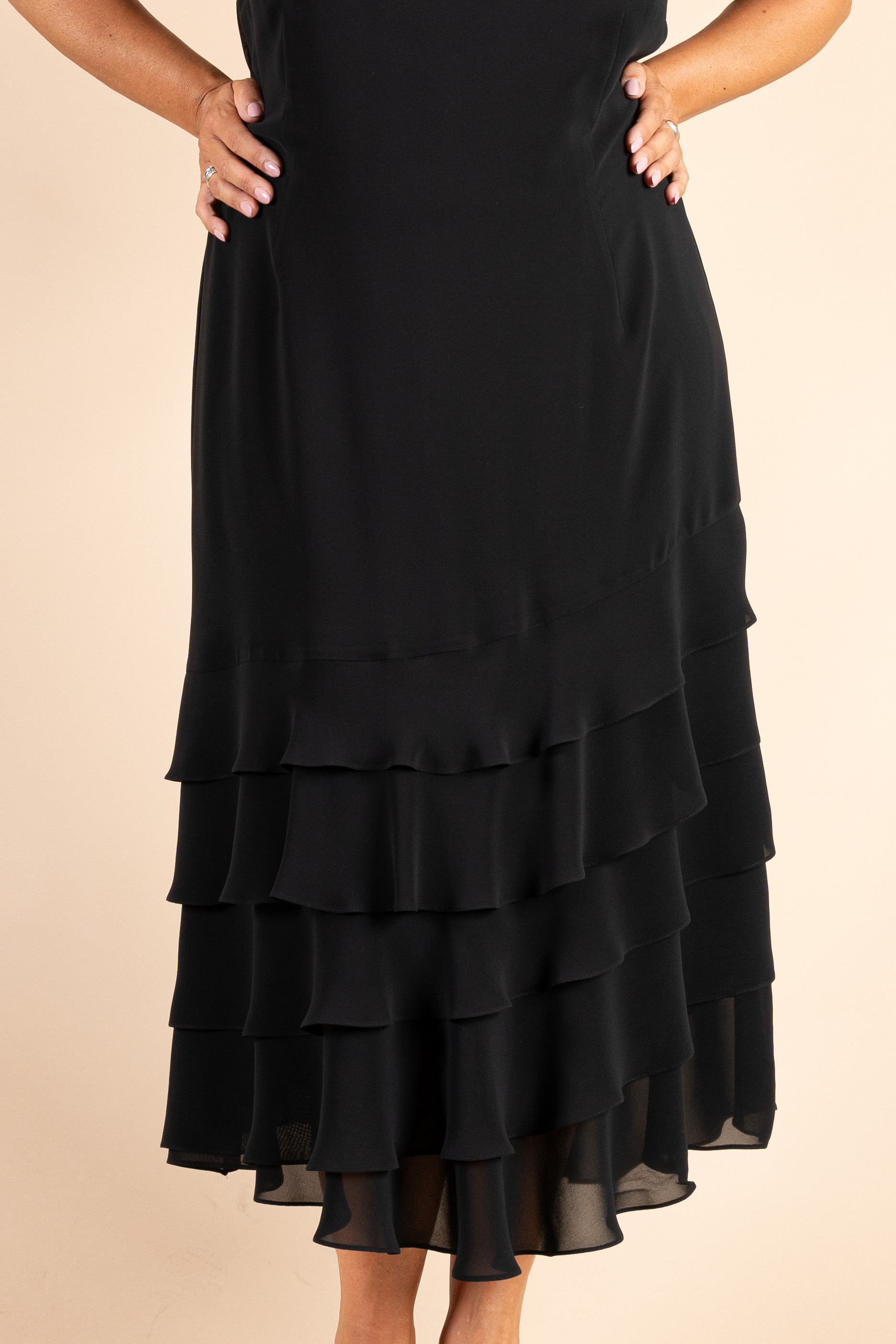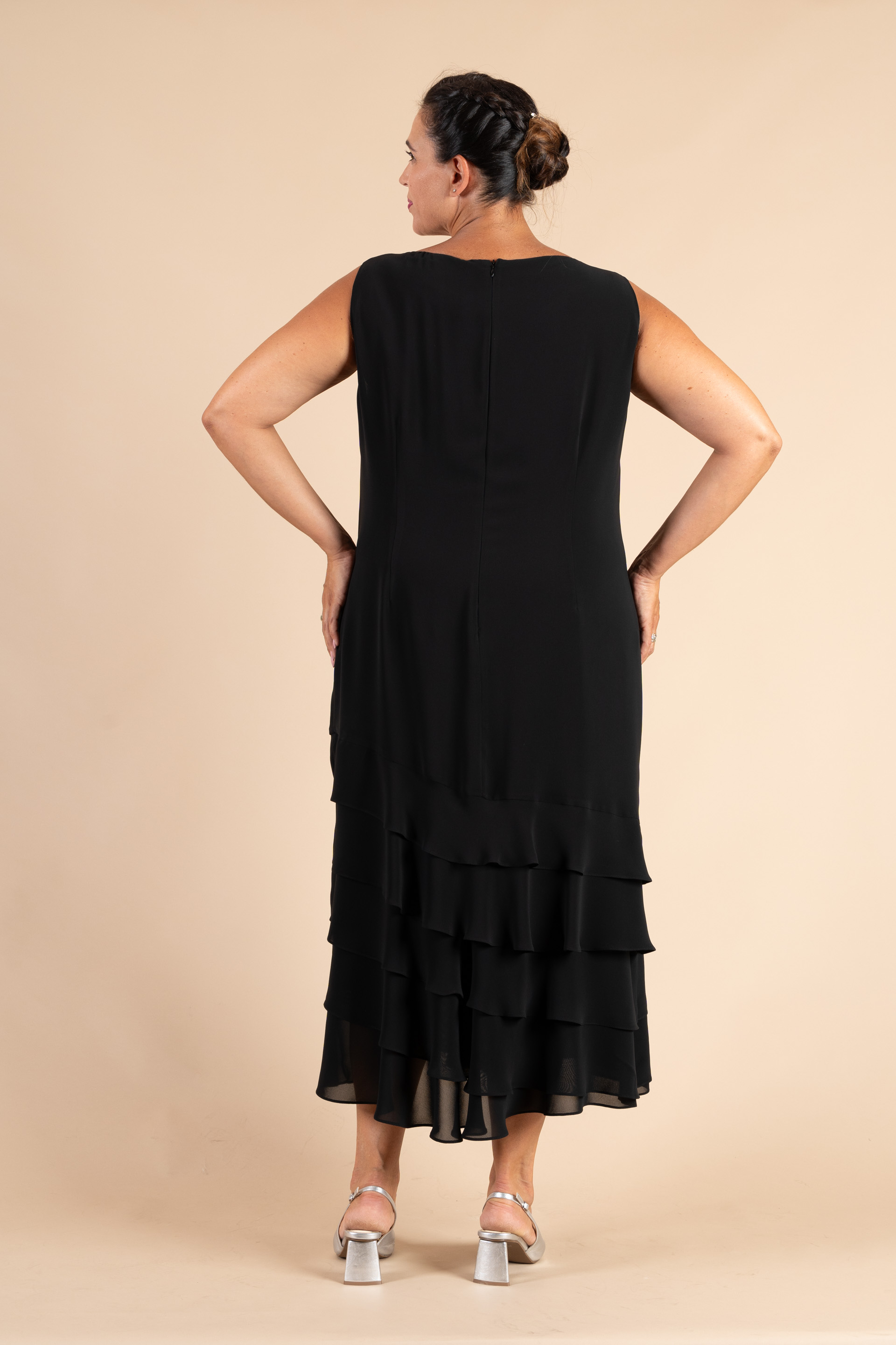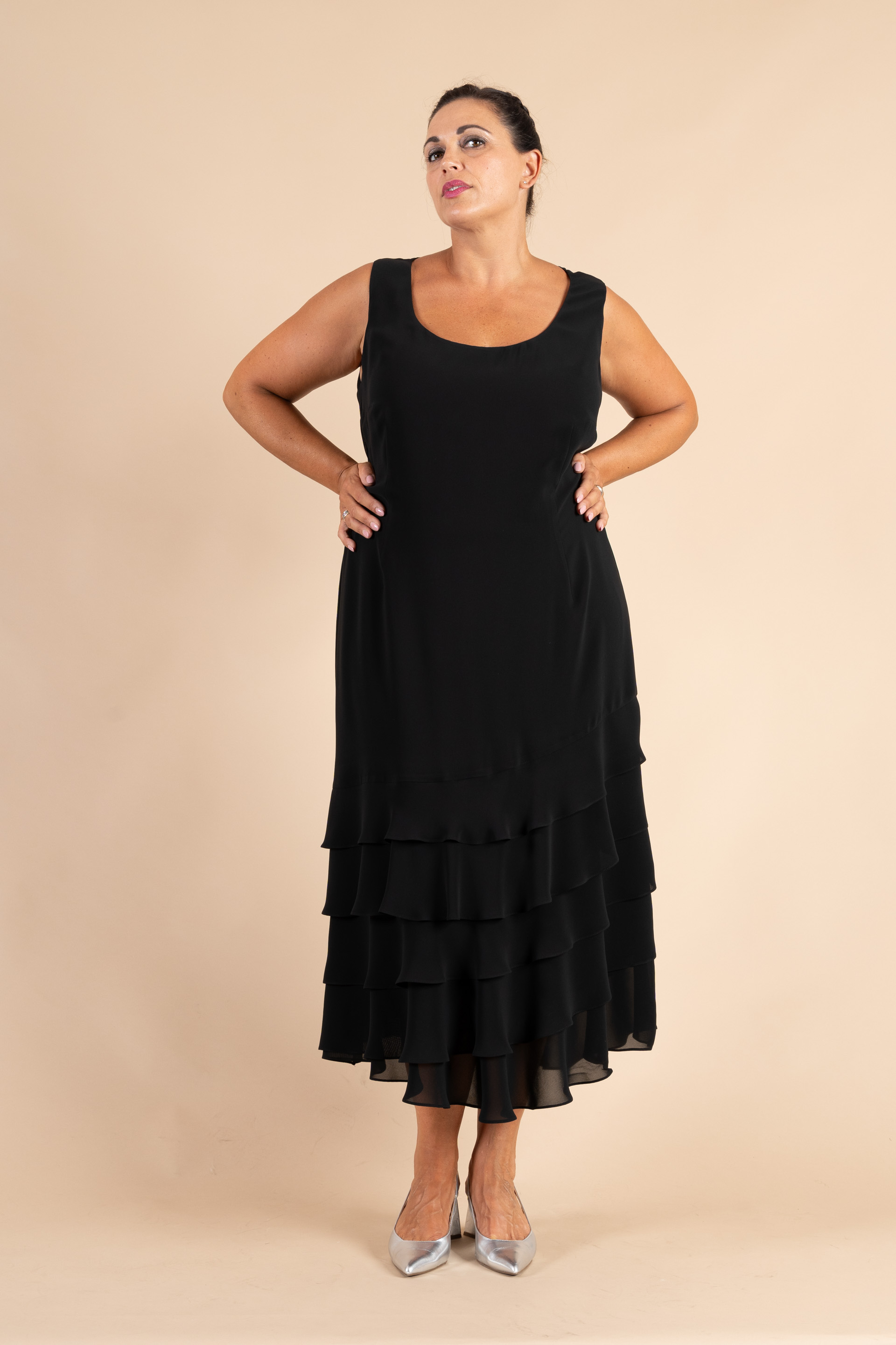 Abito cerimonia donna curvy smanicato realizzato in morbido tessuto chiffon di colore nero, con balze.