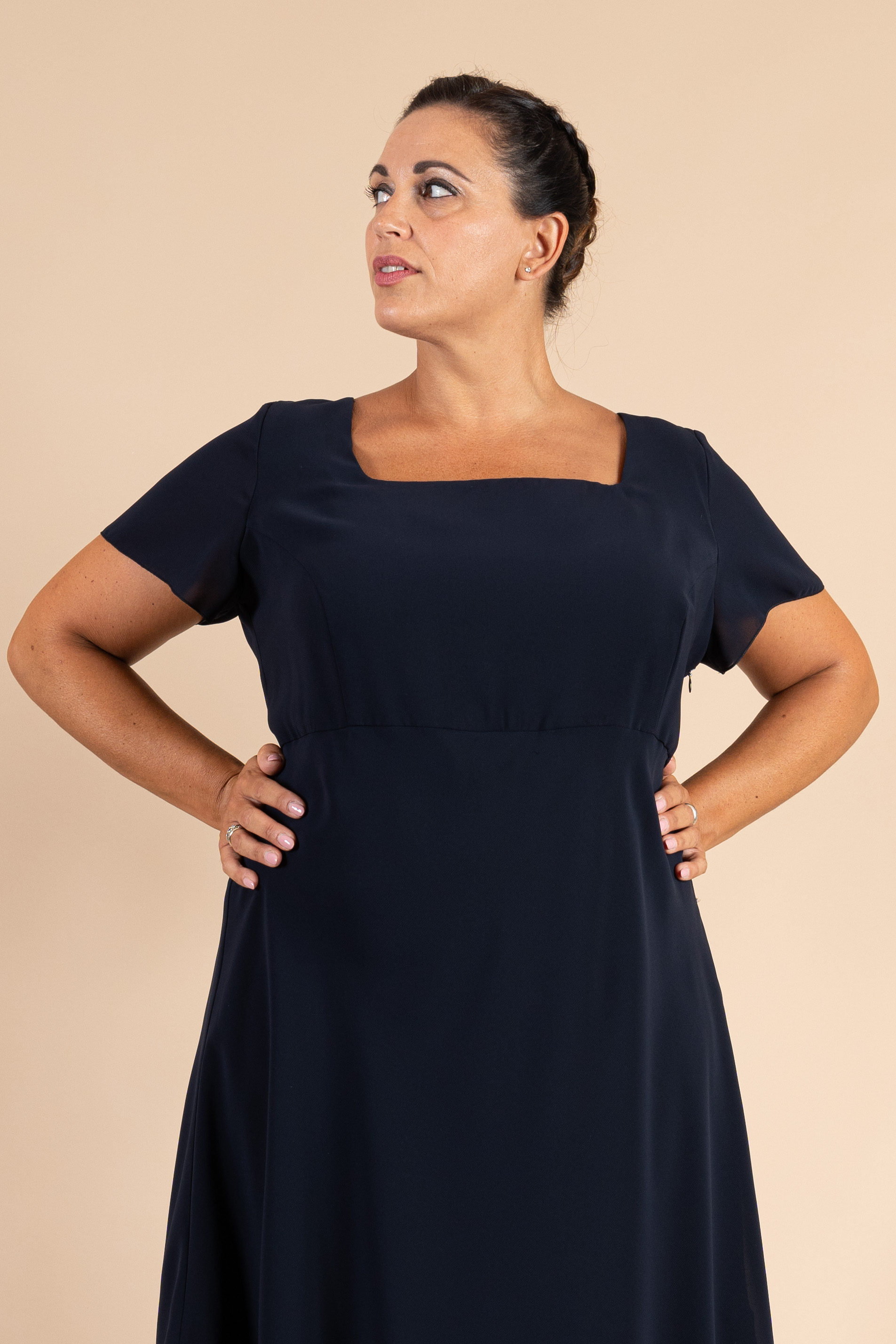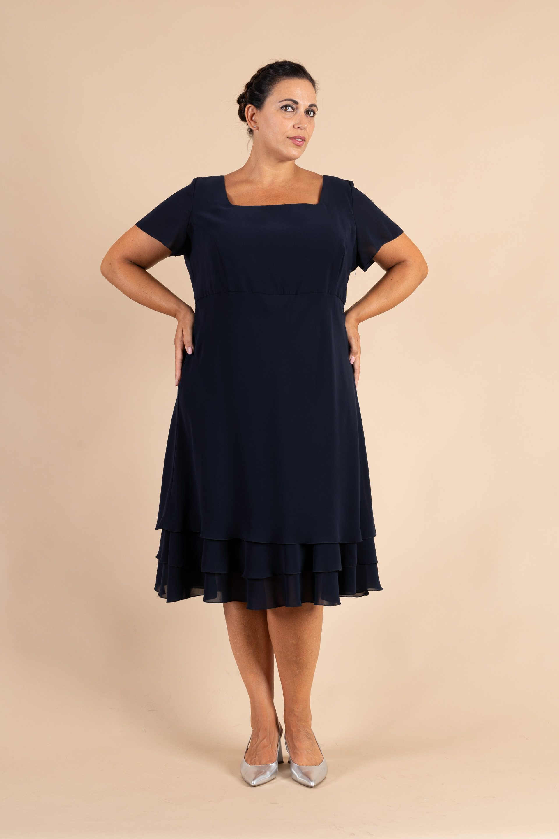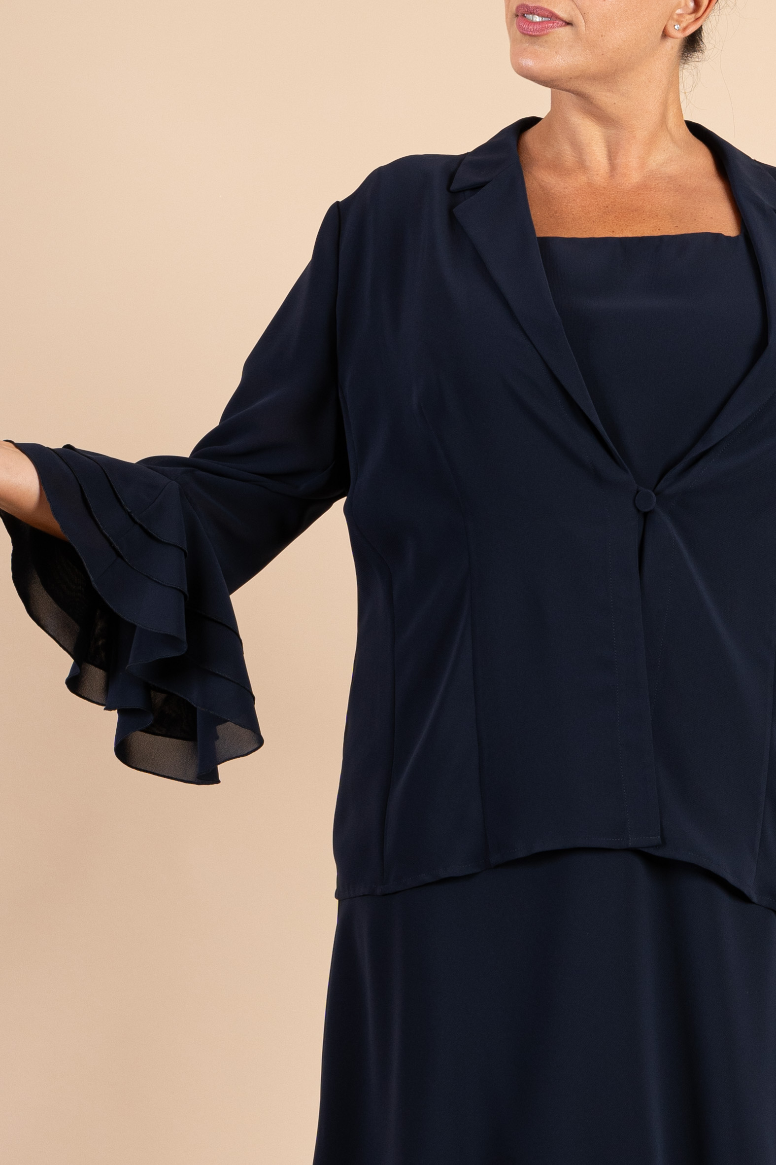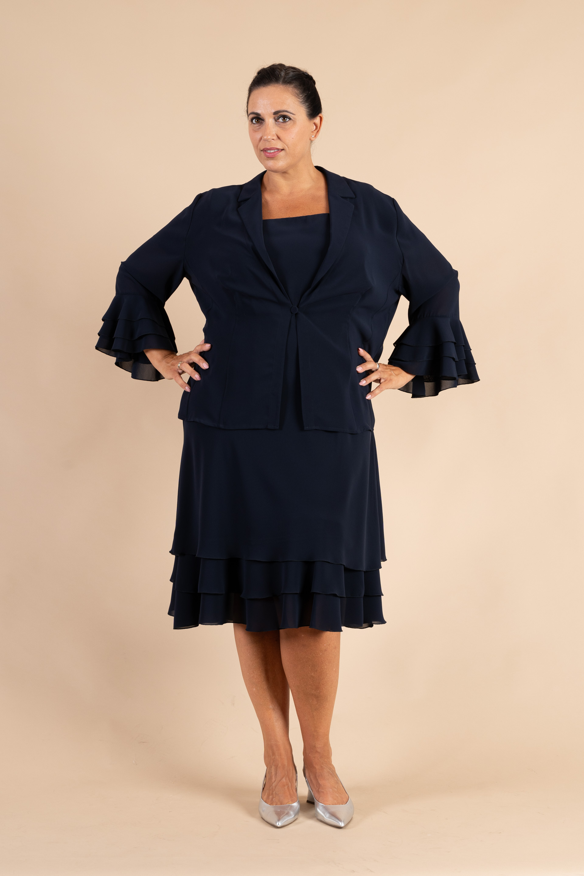 Completo cerimonia donna curvy composto da abito e giacchina, realizzato in tessuto chiffon in colore blu notte impreziosito da balze sulle maniche giacca e fondo abito.