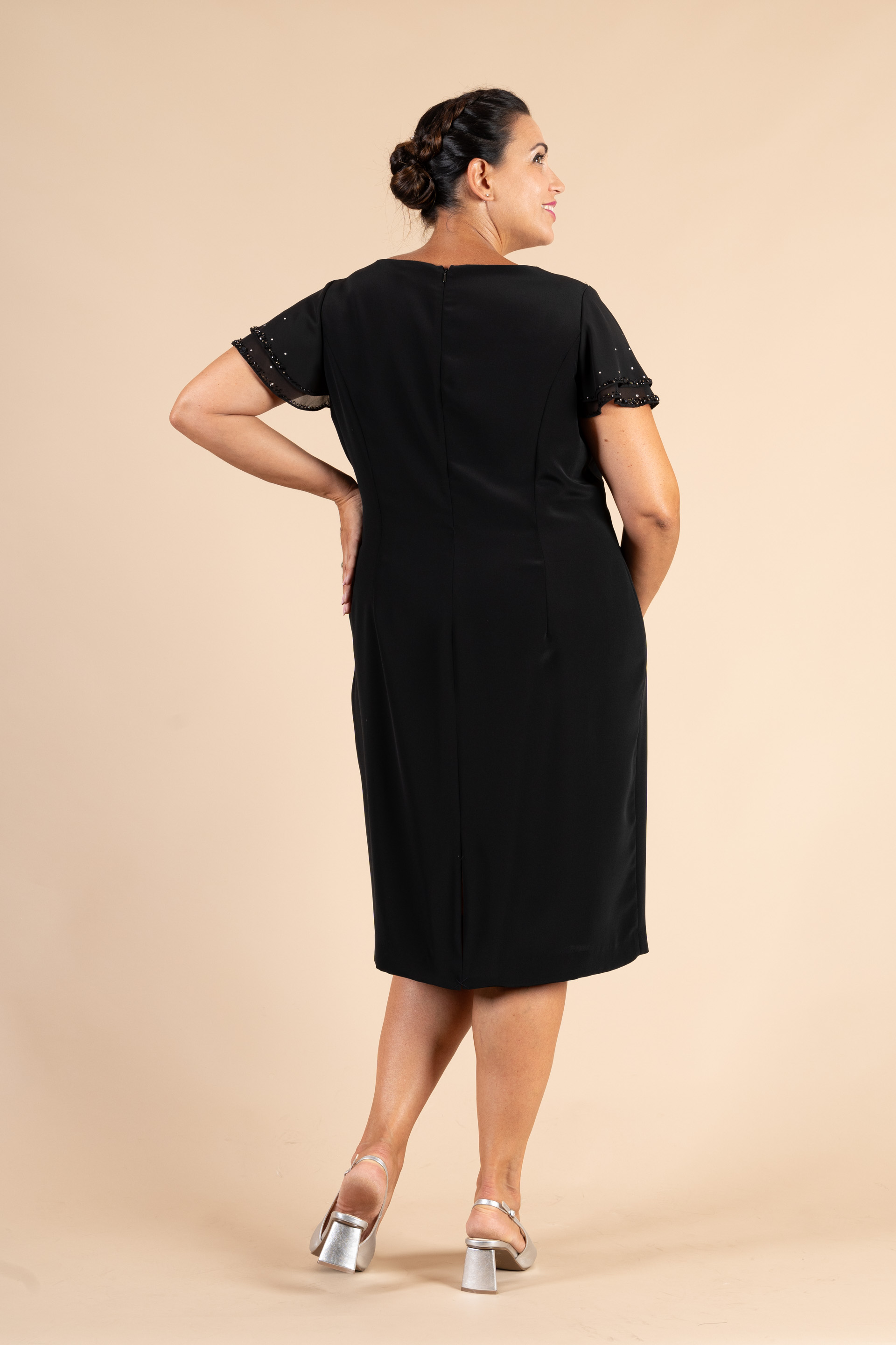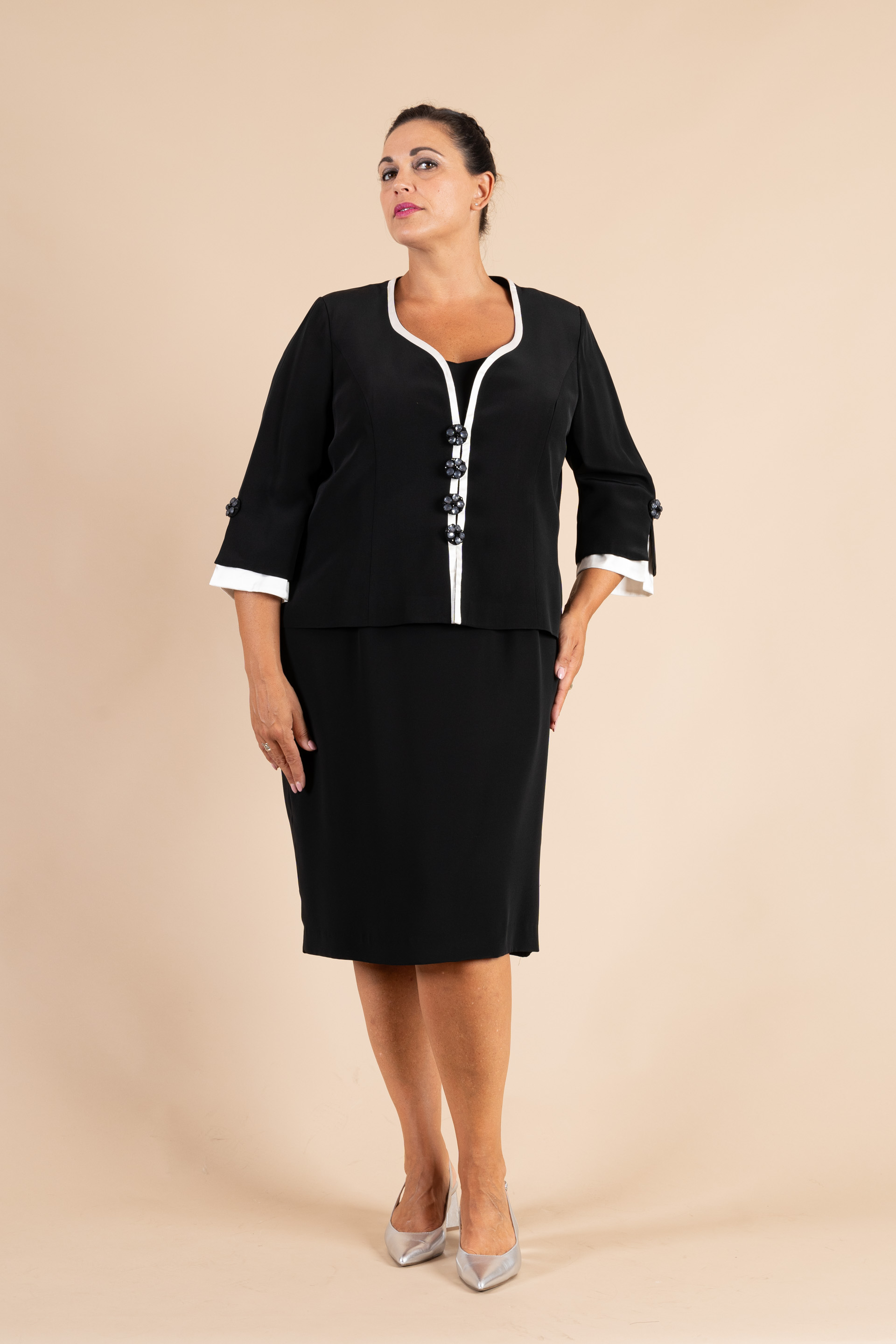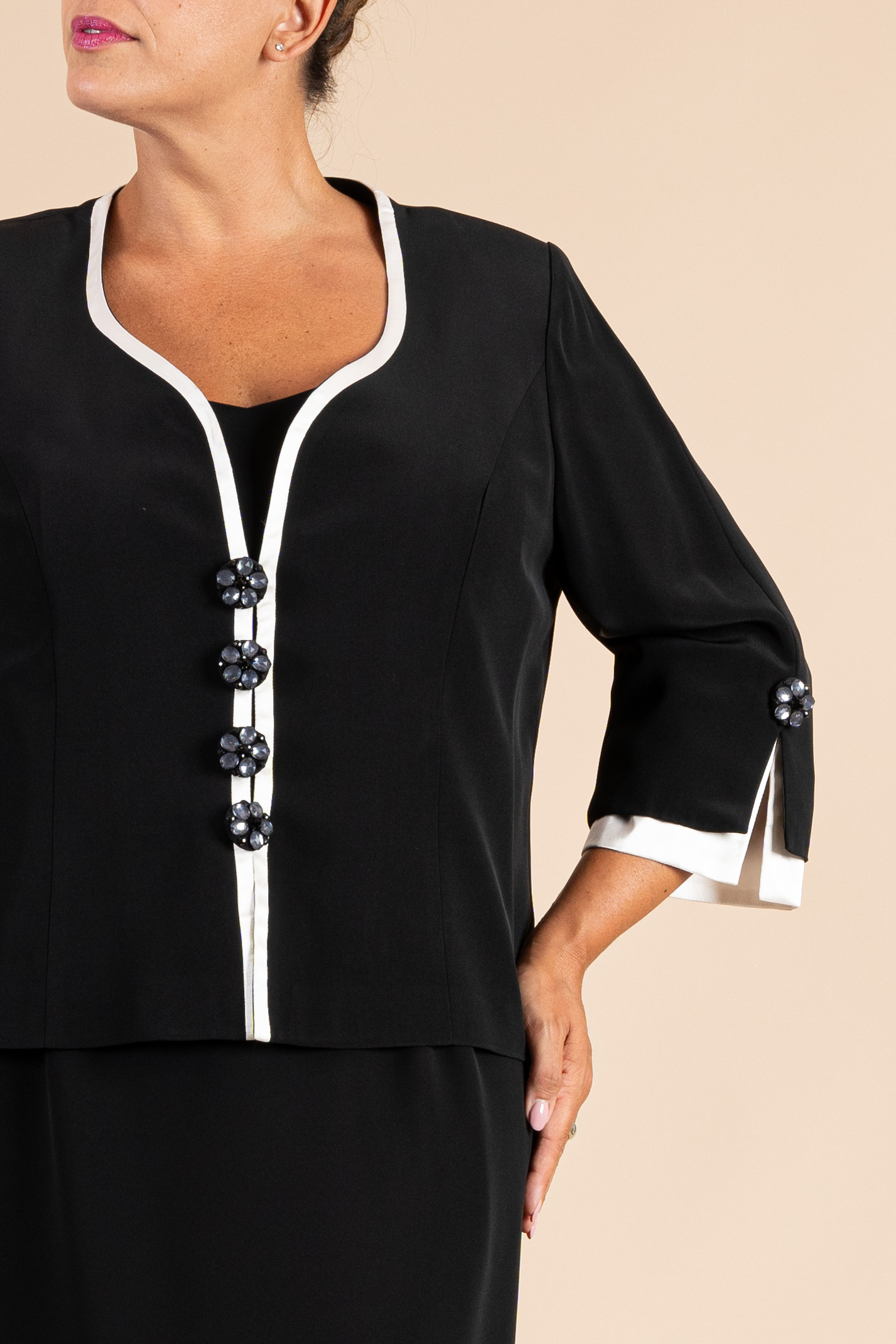Completo cerimonia donna color nero con profili avorio impreziosito da bottoni gioiello, composto da giacca e abito in tessuto cady e con dettaglio maniche morbide realizzate in tessuto chiffon ricamate