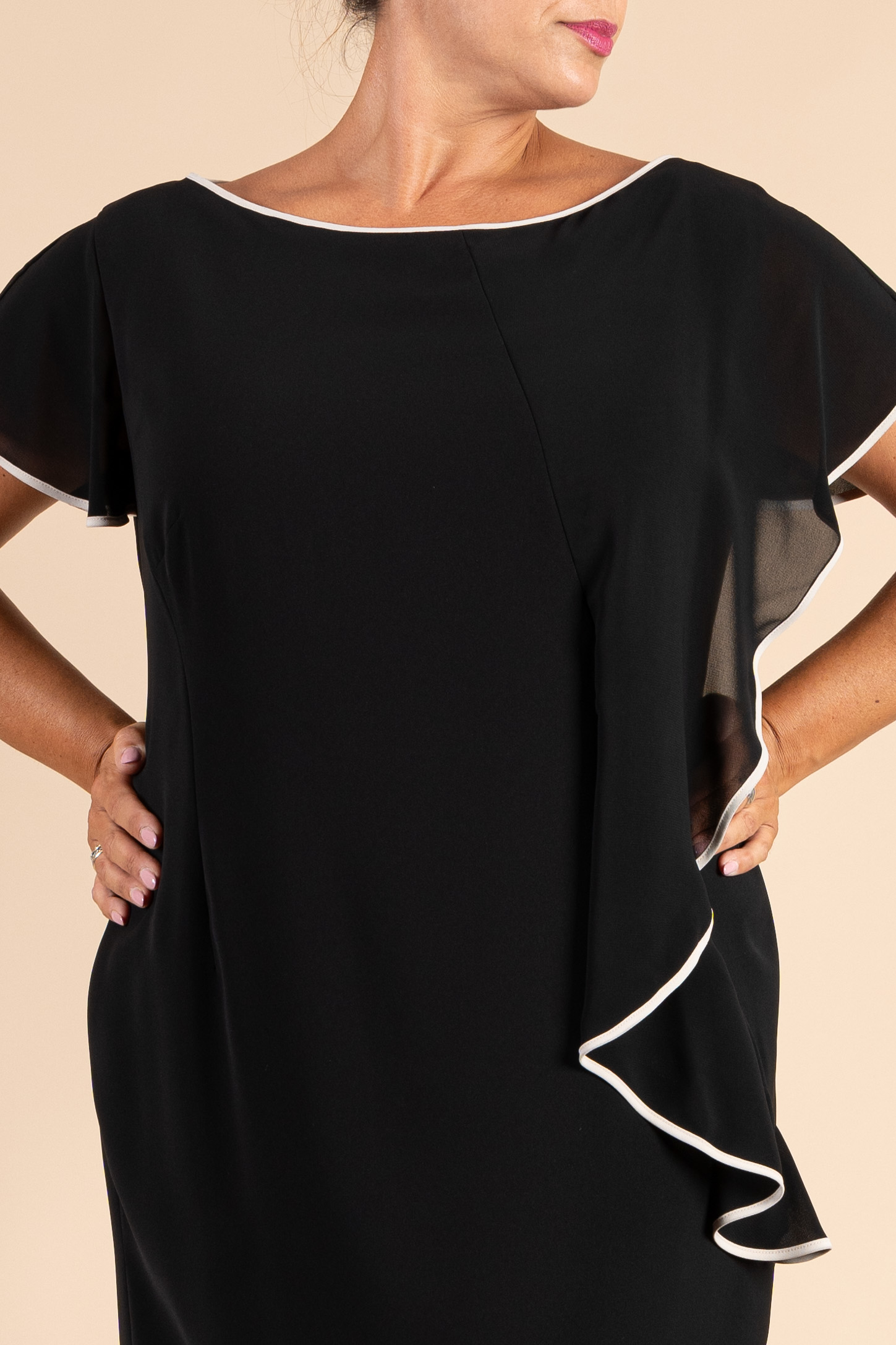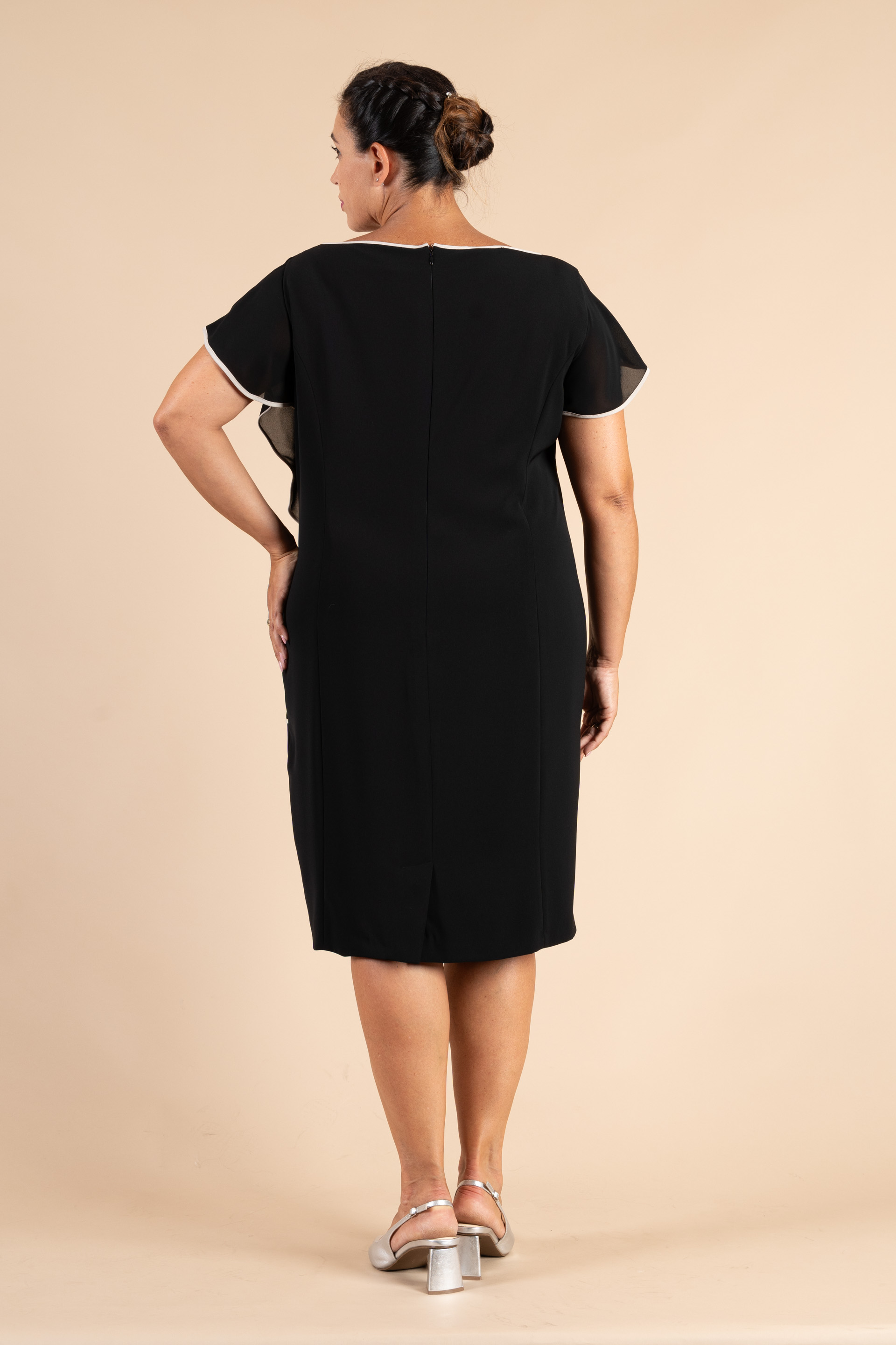 Abito cerimonia donna curvy realizzato in morbido tessuto cady di colore nero, con scollatura a barchetta e particolari rifiniture in colore avorio