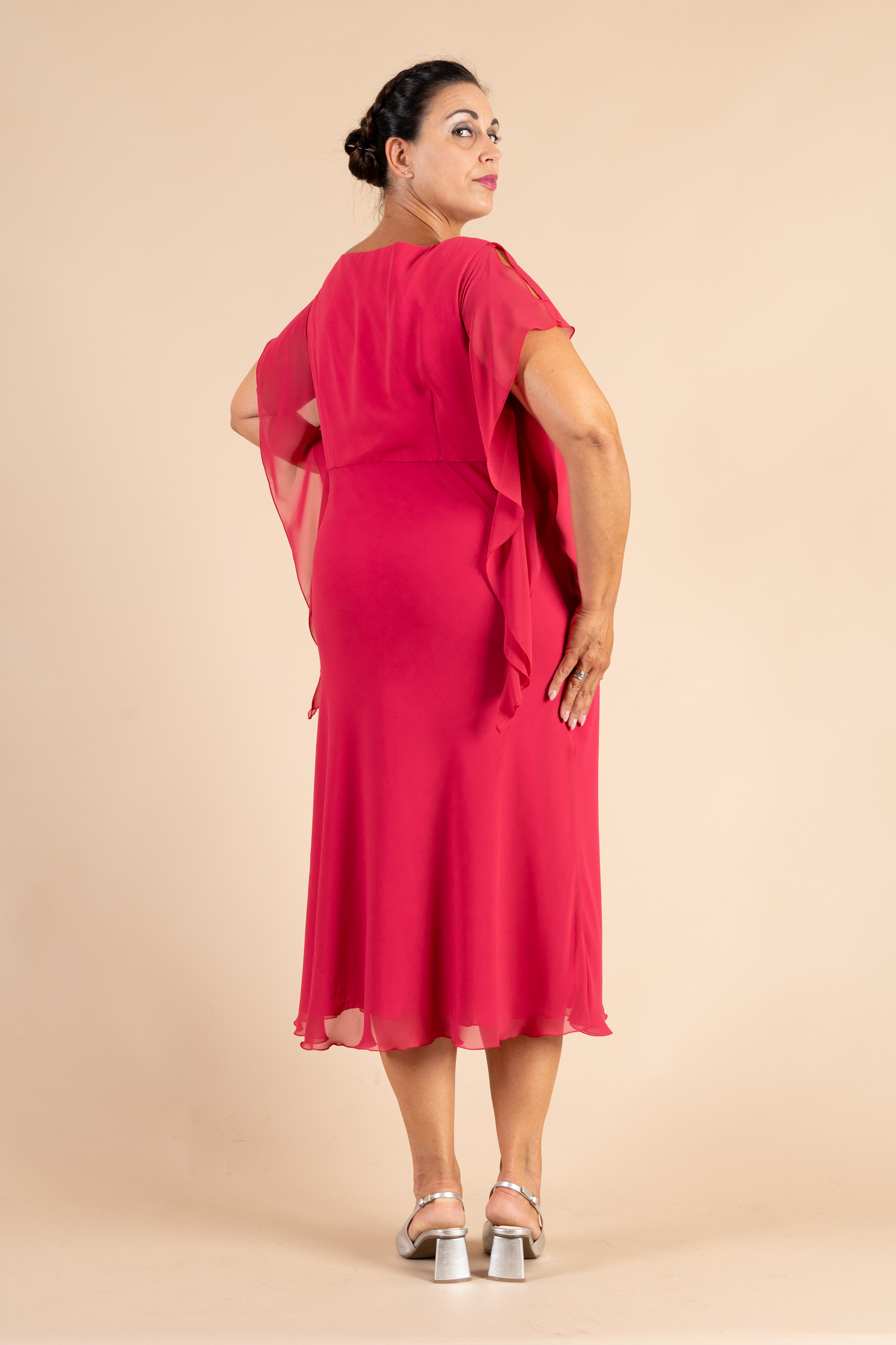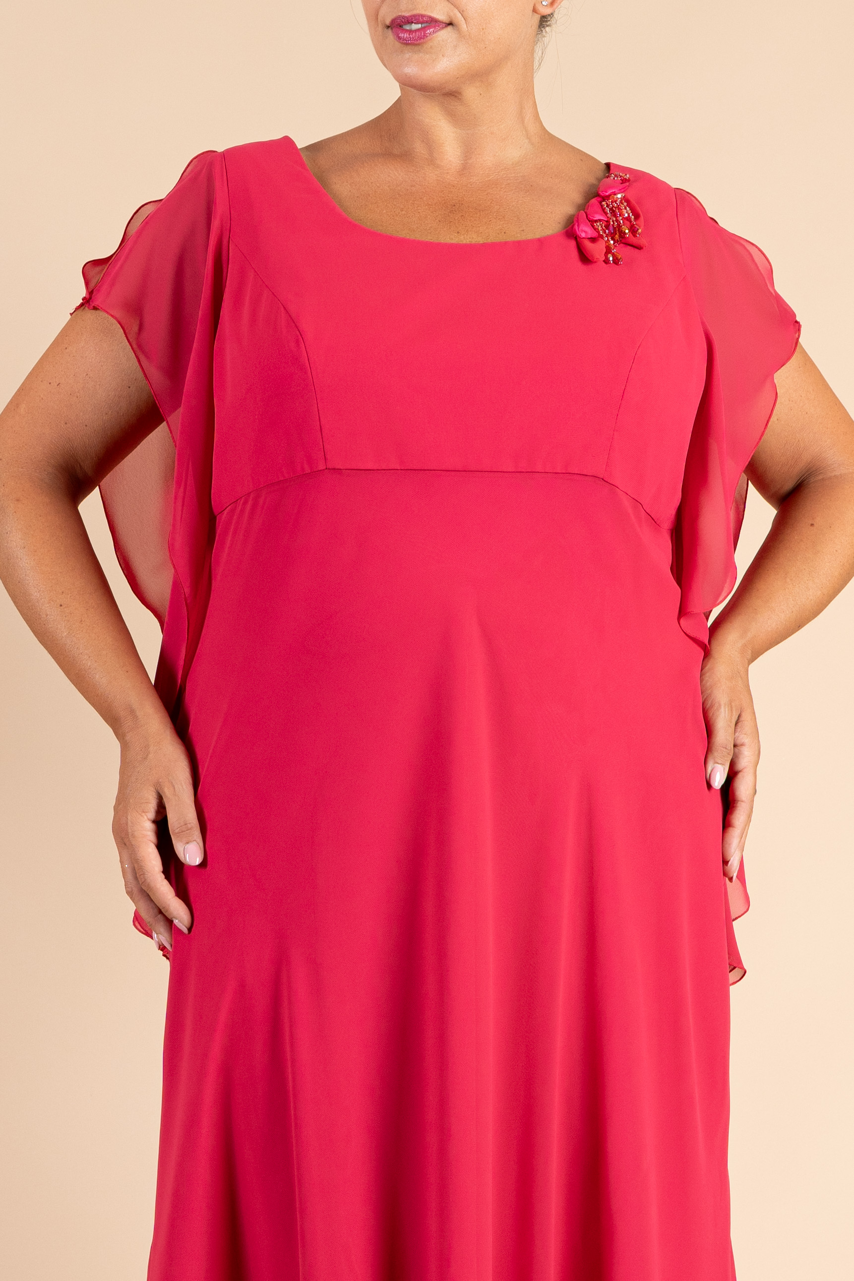 Abito cerimonia donna curvy con maniche morbide realizzato in morbido tessuto chiffon di colore fuxia, impreziosito da applicazione floreale ricamata.