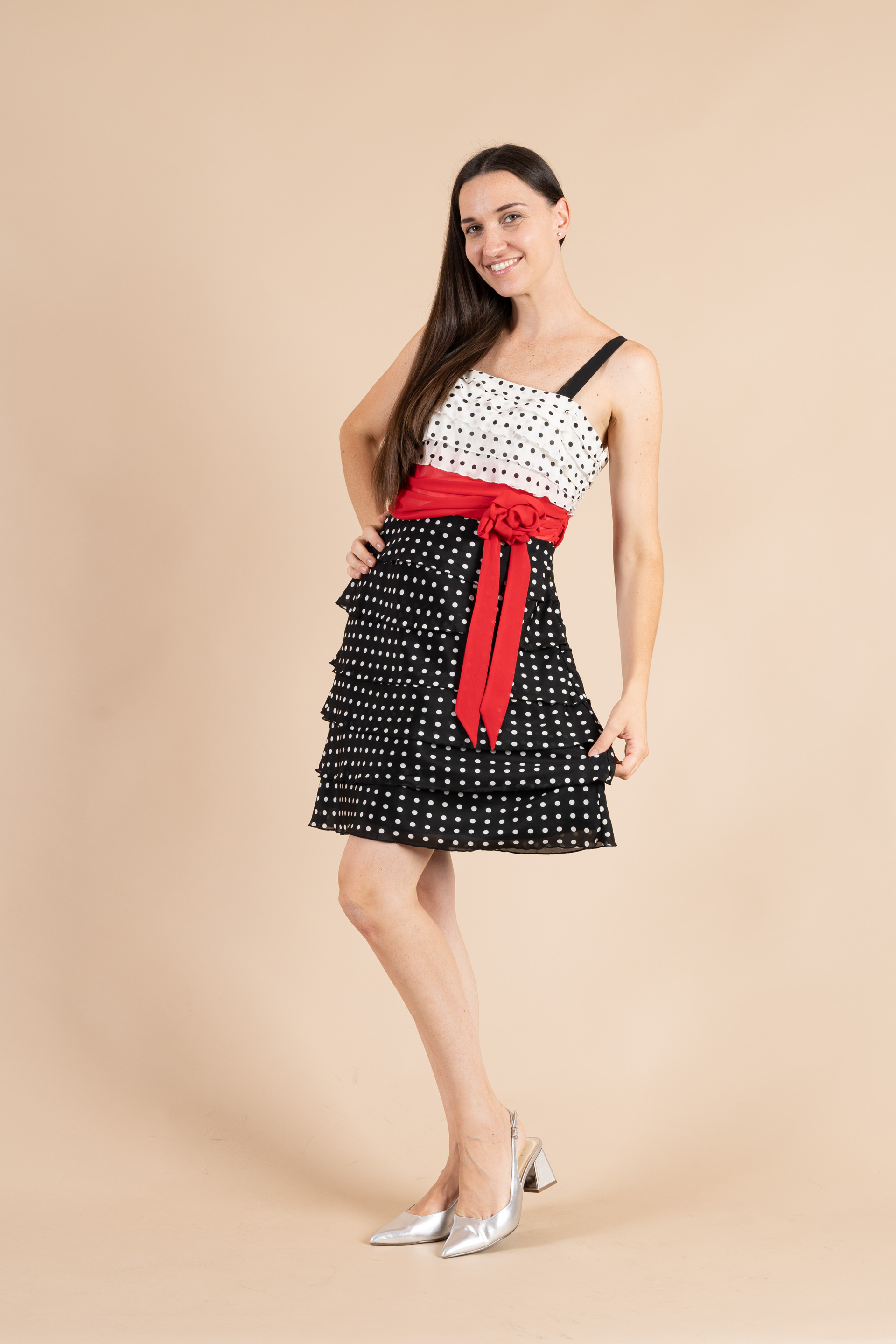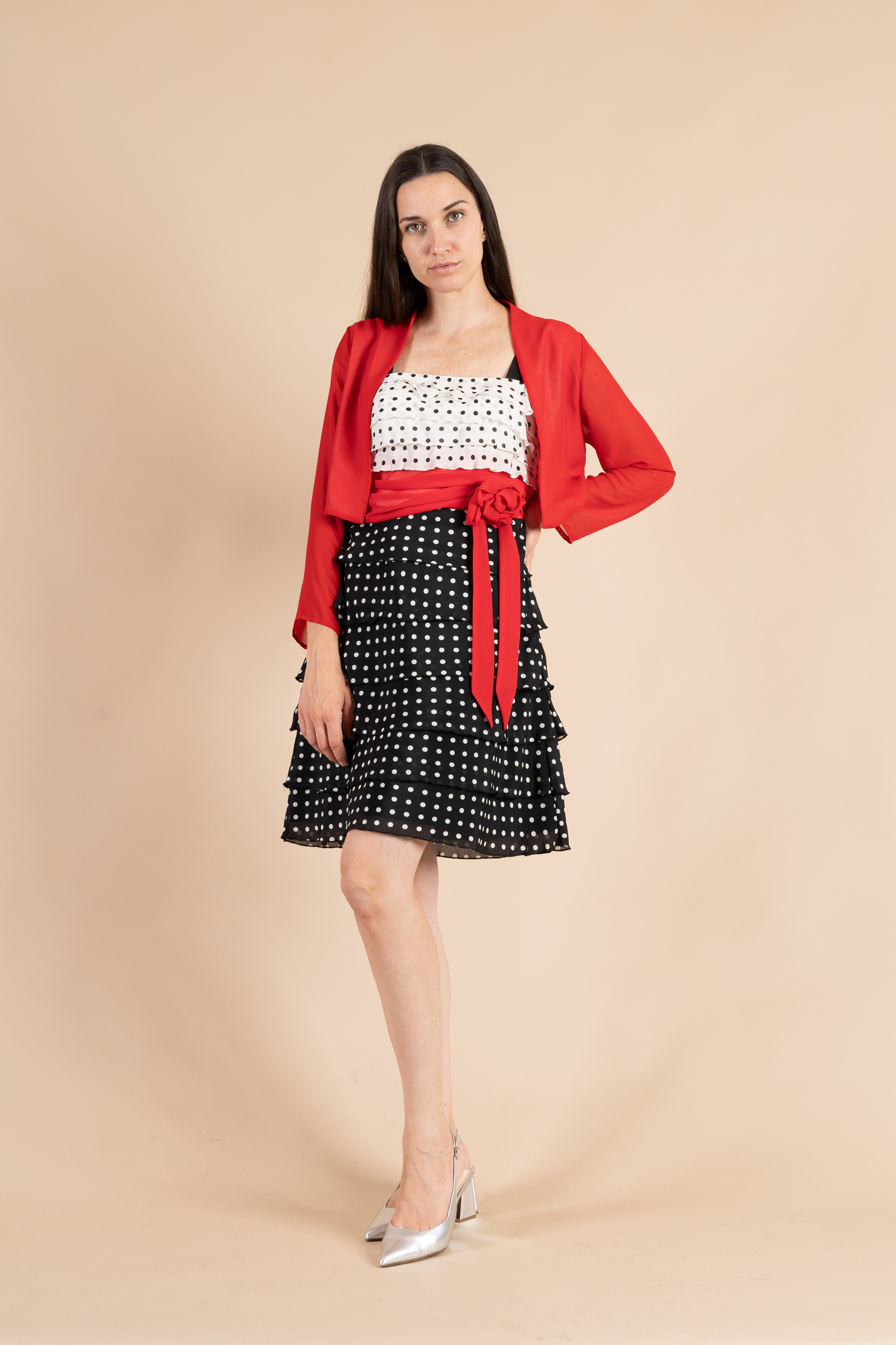Particolare abito corto tutto realizzato in tessuto di chiffon nei colori rosso/nero/avorio a pois con gonna a balzine.