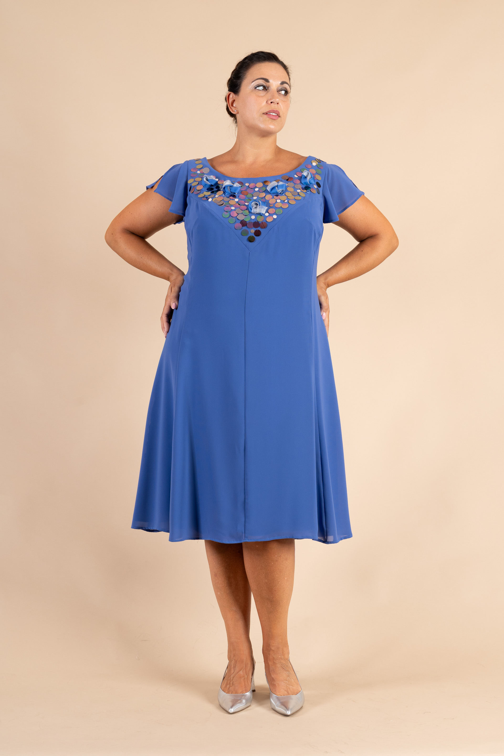 Abito cerimonia donna curvy realizzato in morbido tessuto di chiffon di colore bluette con ricamo a di pailettes e applicazioni floreali.