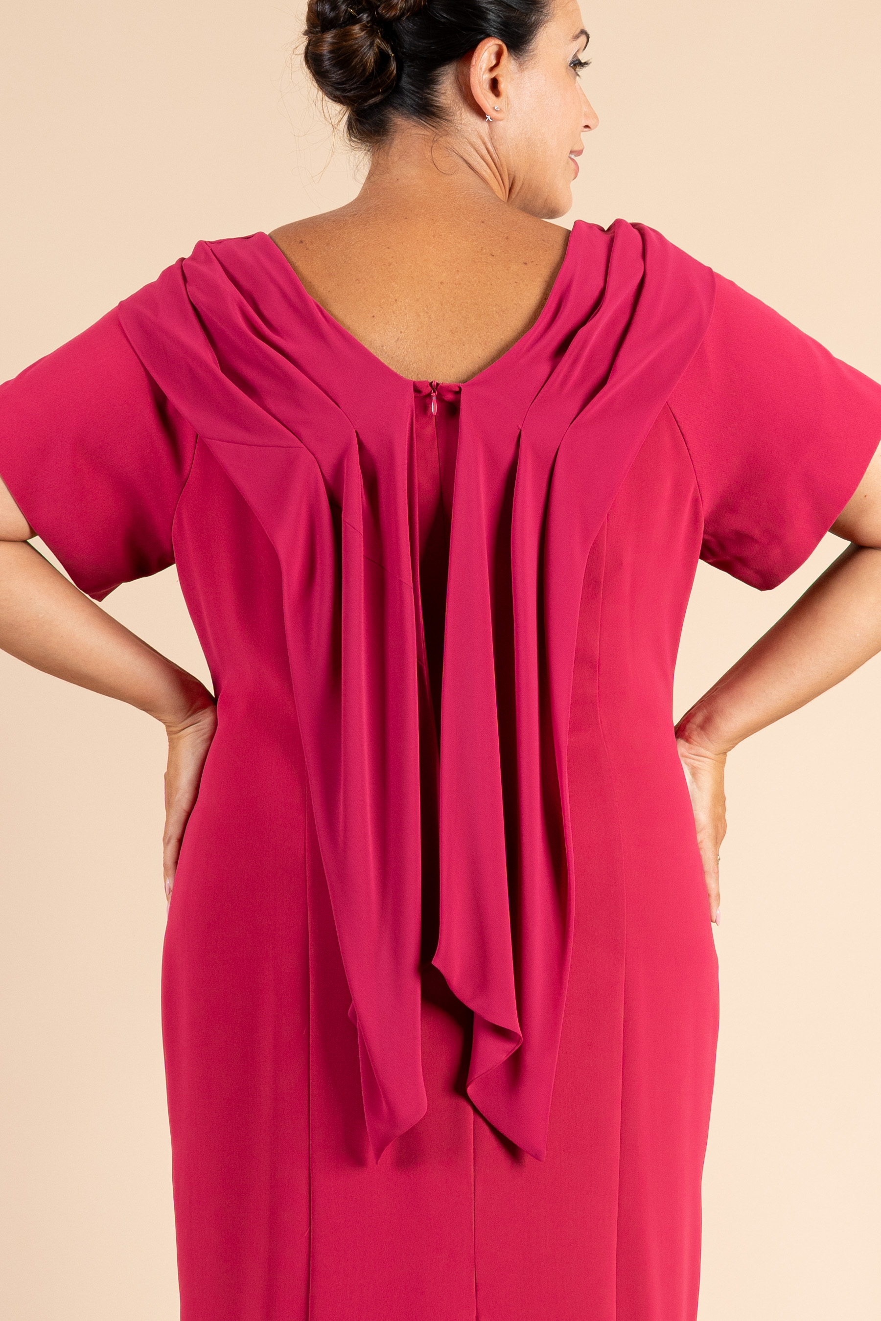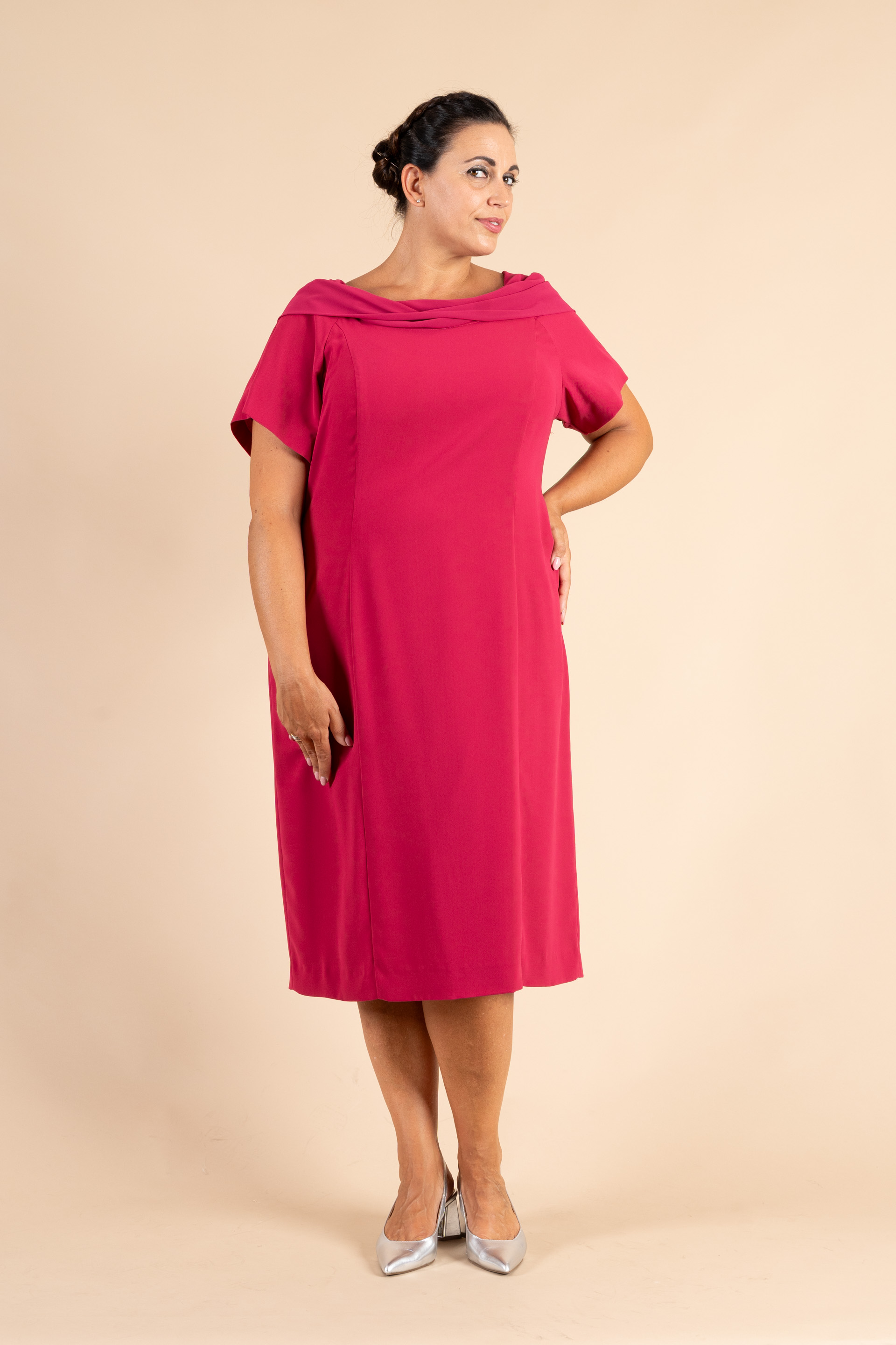 Abito cerimonia donna curvy con scollo a barchetta arricciato realizzato in tessuti cady di colore fuxia.