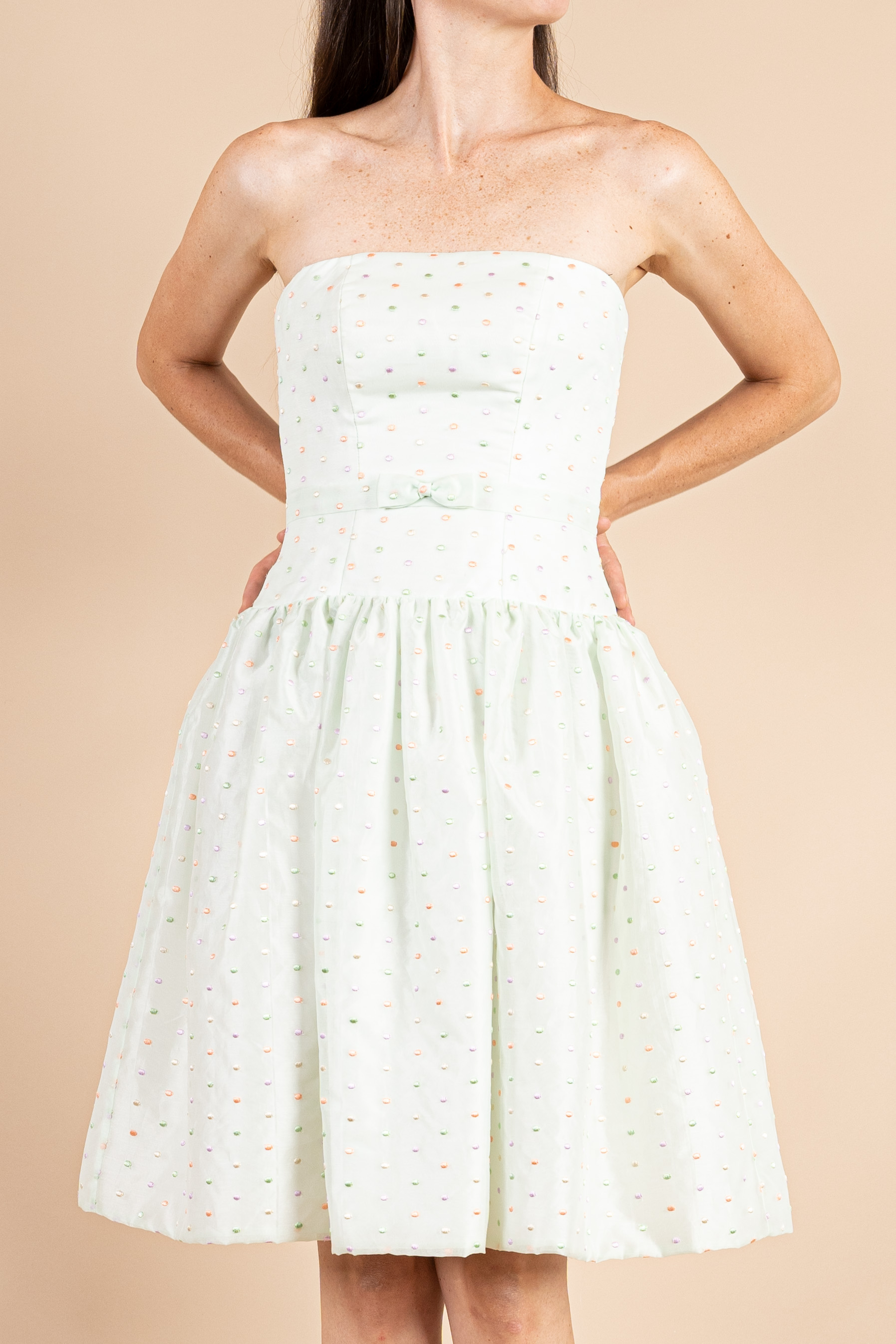Abito cerimonia donna sartoriale realizzato interamente in organza ricamata color verde chiaro a pois multicolore con scollo décolleté e chiusura a corsetto, impreziosito da fascetta con fiocco.