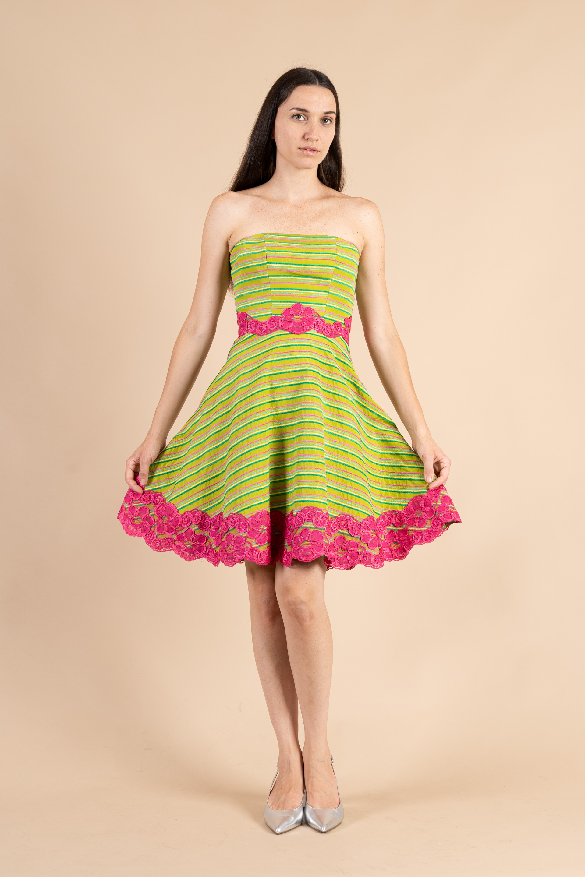 Abito cerimonia donna sartoriale realizzato interamente in tessuto di taffetà a base verde con righe multicolor, con scollo décolleté e chiusura a corsetto, impreziosito da fascetta fuxia in pizzo.