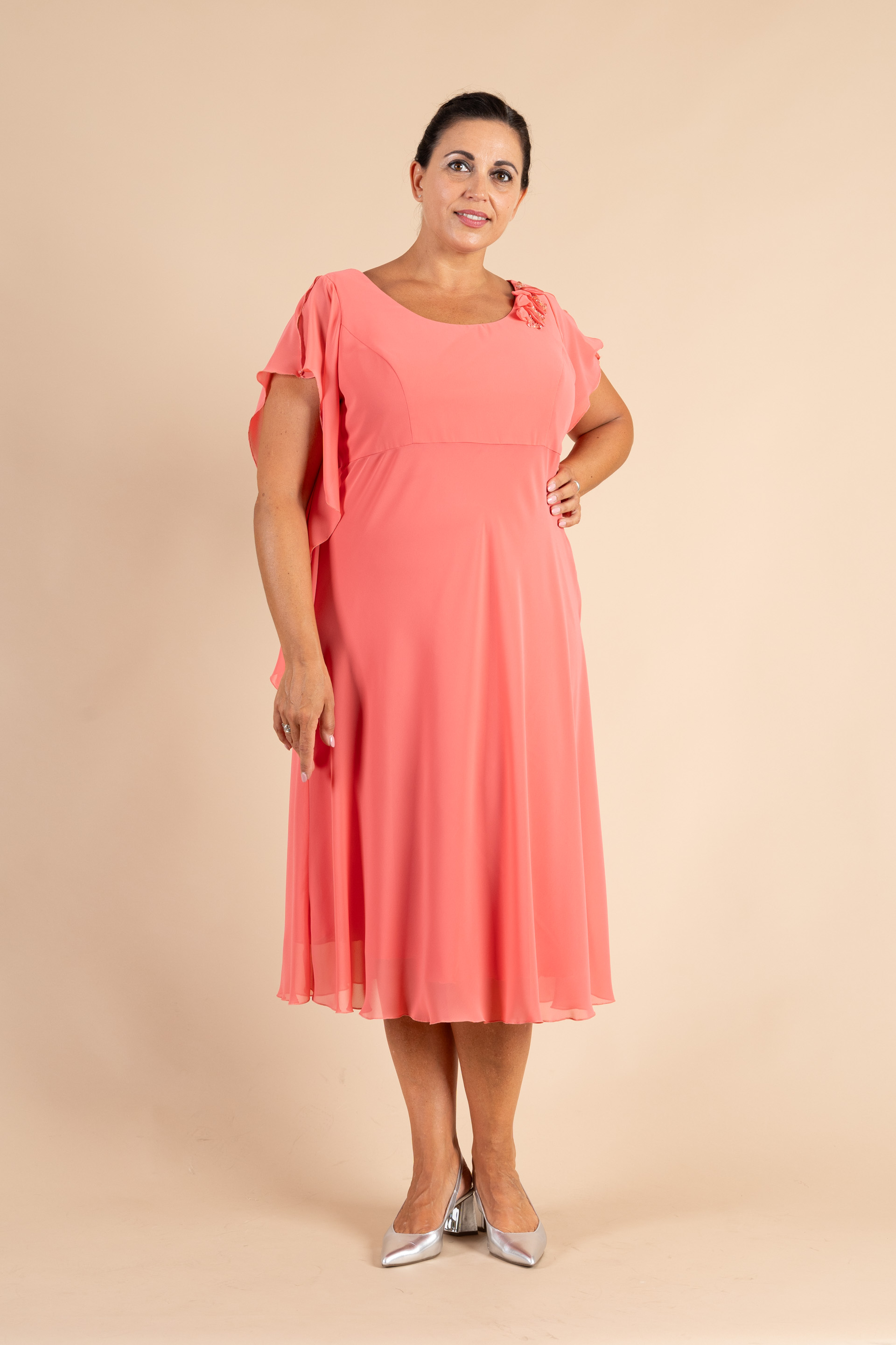 Abito cerimonia donna curvy con maniche morbide realizzato in morbido tessuto chiffon di colore pesca, impreziosito da applicazione floreale ricamata.