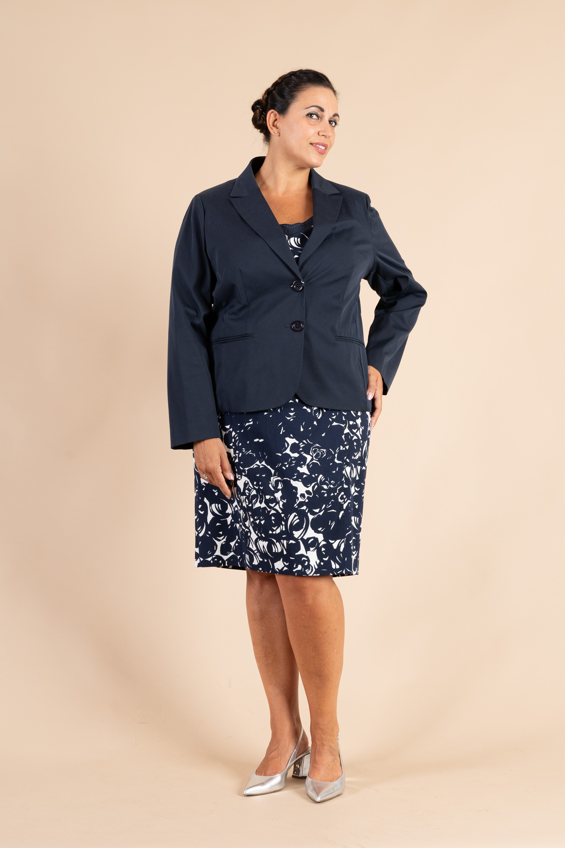 Completo 2 pz. cerimonia donna composto da giacca tinta unita blu e abito a fantasia floreale blu/bianco il tutto realizzato in tessuto di viscosa.
