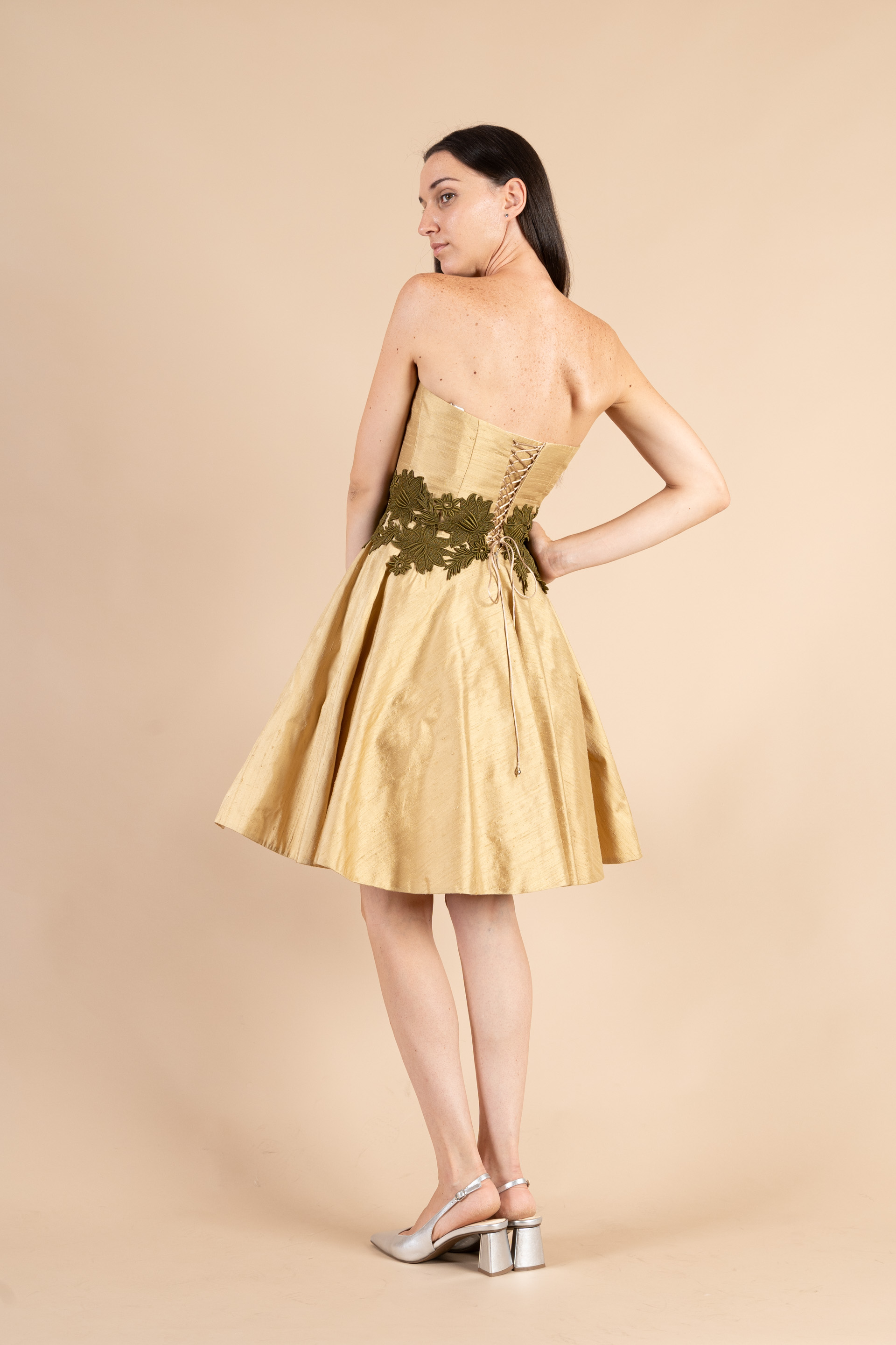Abito cerimonia donna sartoriale con scollatura a décolleté, realizzato interamente in tesuto shantung dorato con decoro in pizzo macramè verde con chisura a corsetto.