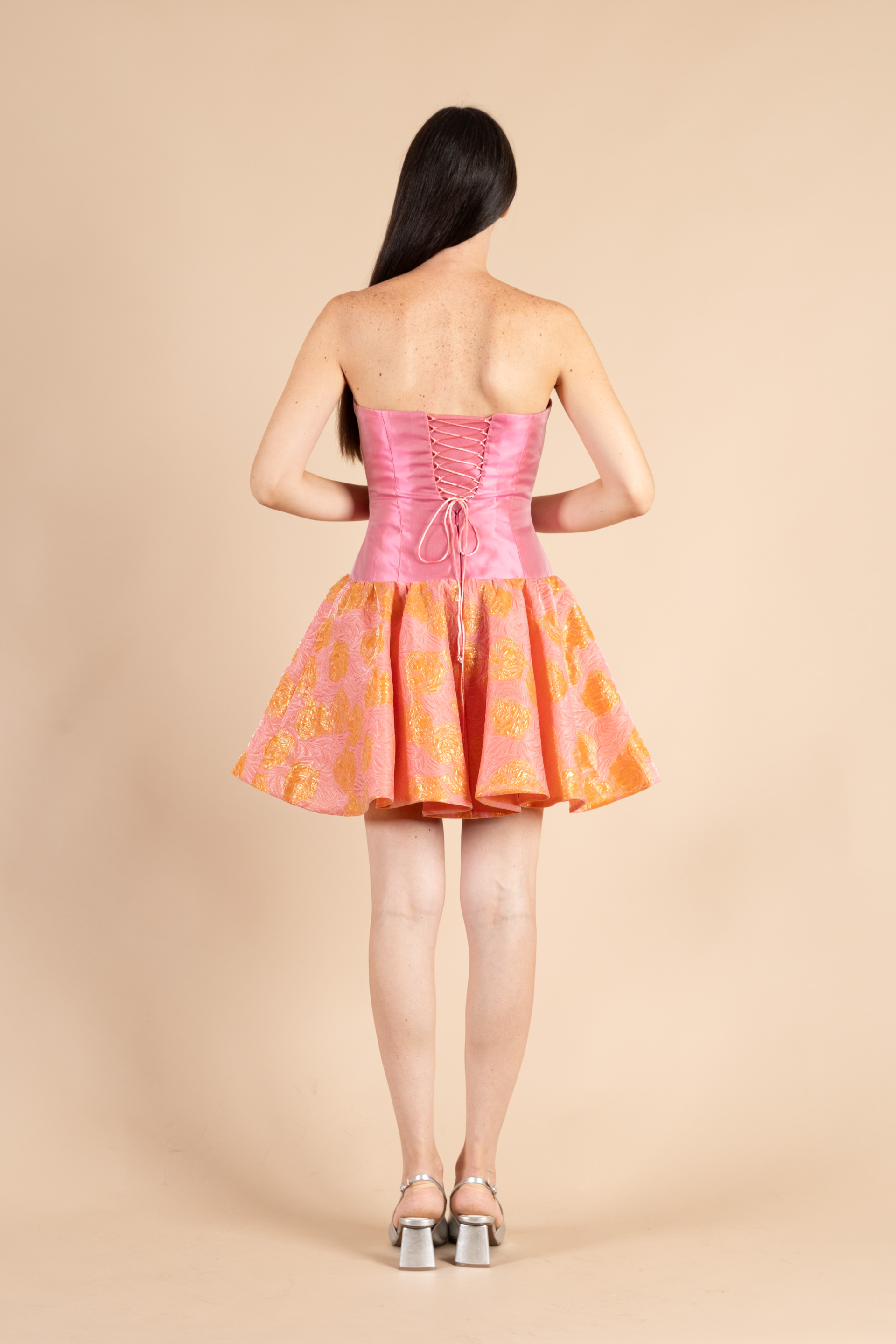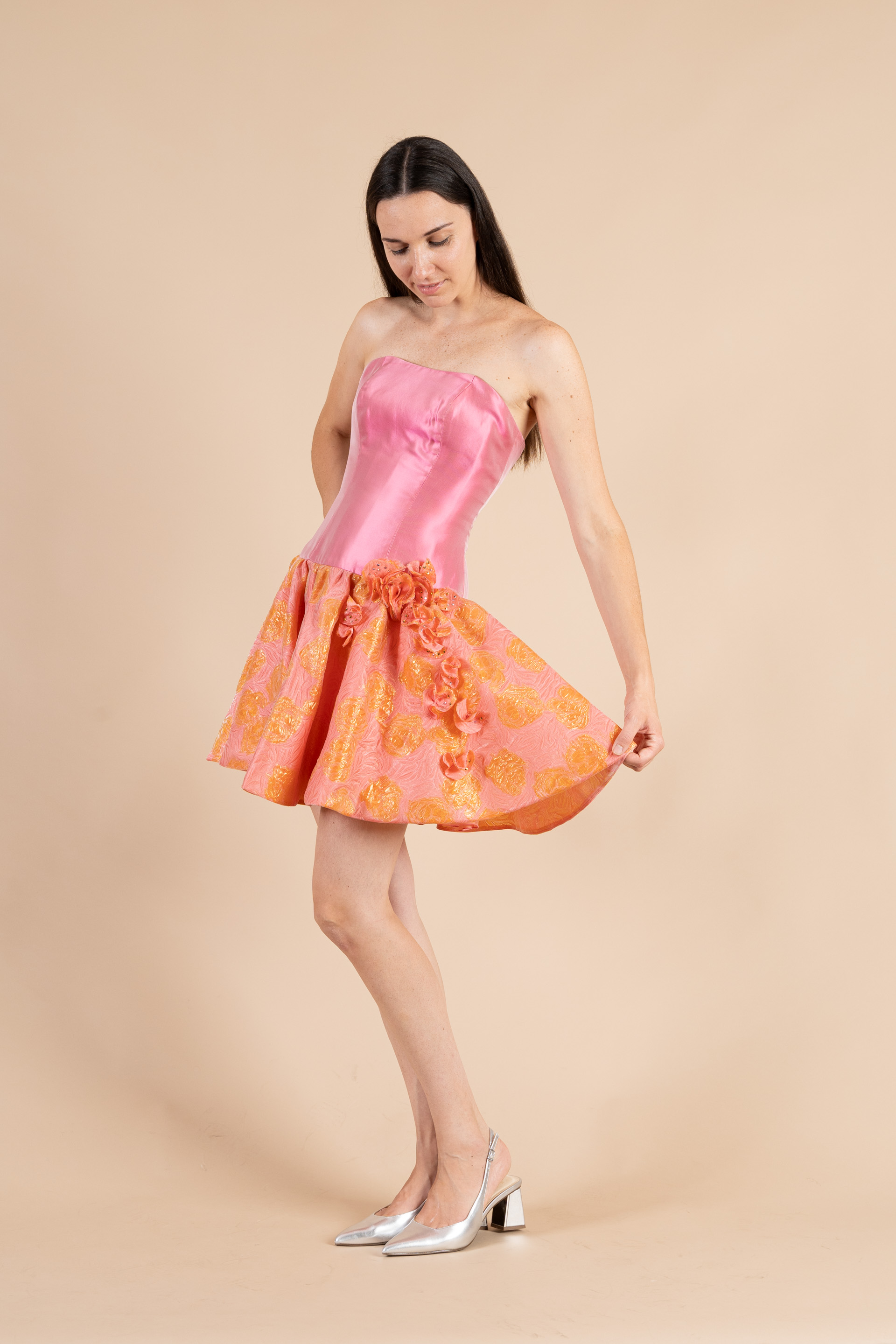Abito cerimonia donna sartoriale color arancio/fuxia con scollatura a décolleté, realizzato in tessuto taffetà e broccato con applicazione floreale realizzata a mano, la chiusura corsetto garantisce un confort perfetto in ogni momento.