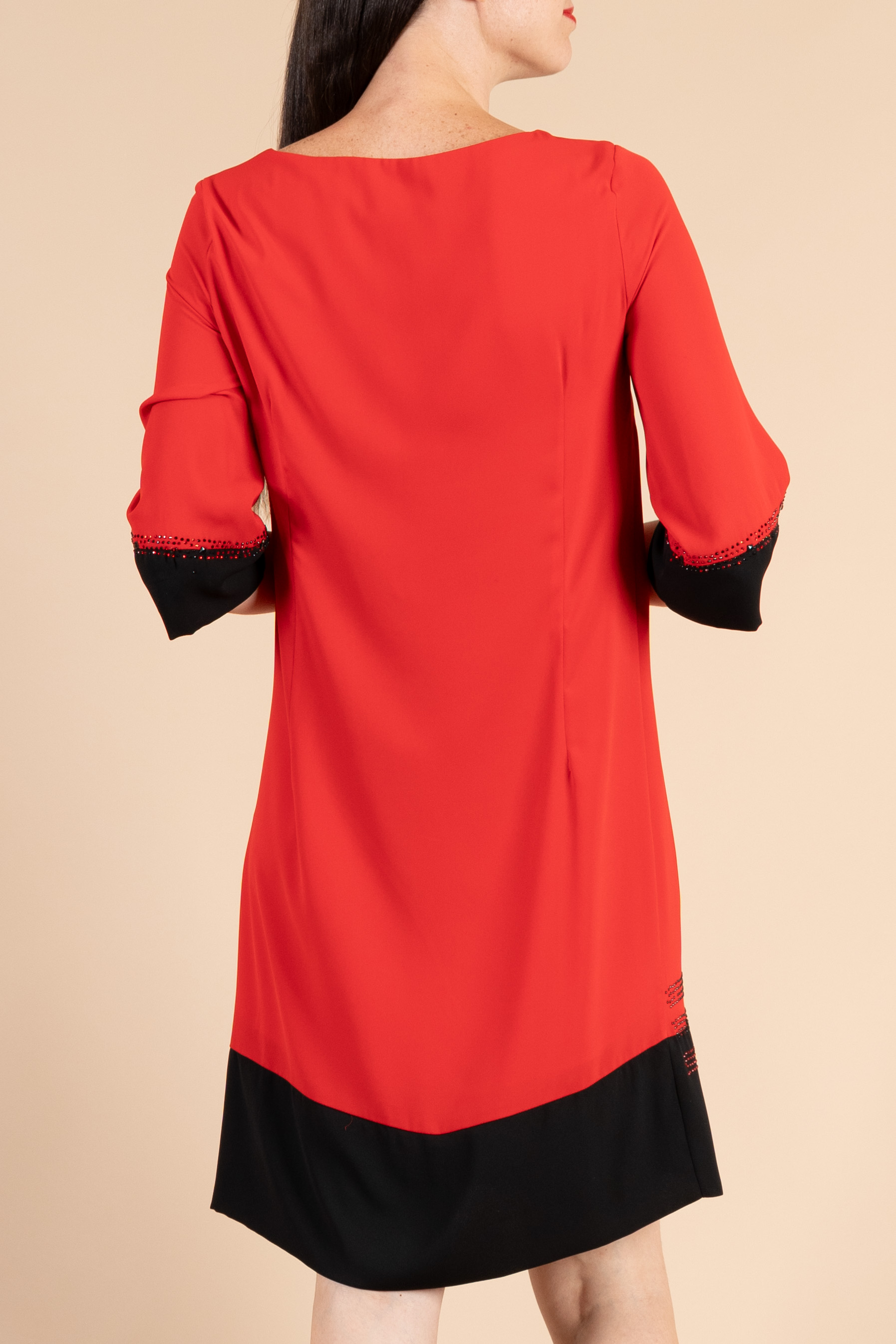Abito cerimonia donna corto con maniche 3/4 realizzato in tessuto chiffon rosso e nero, impreziosito da ricami in cristalli.