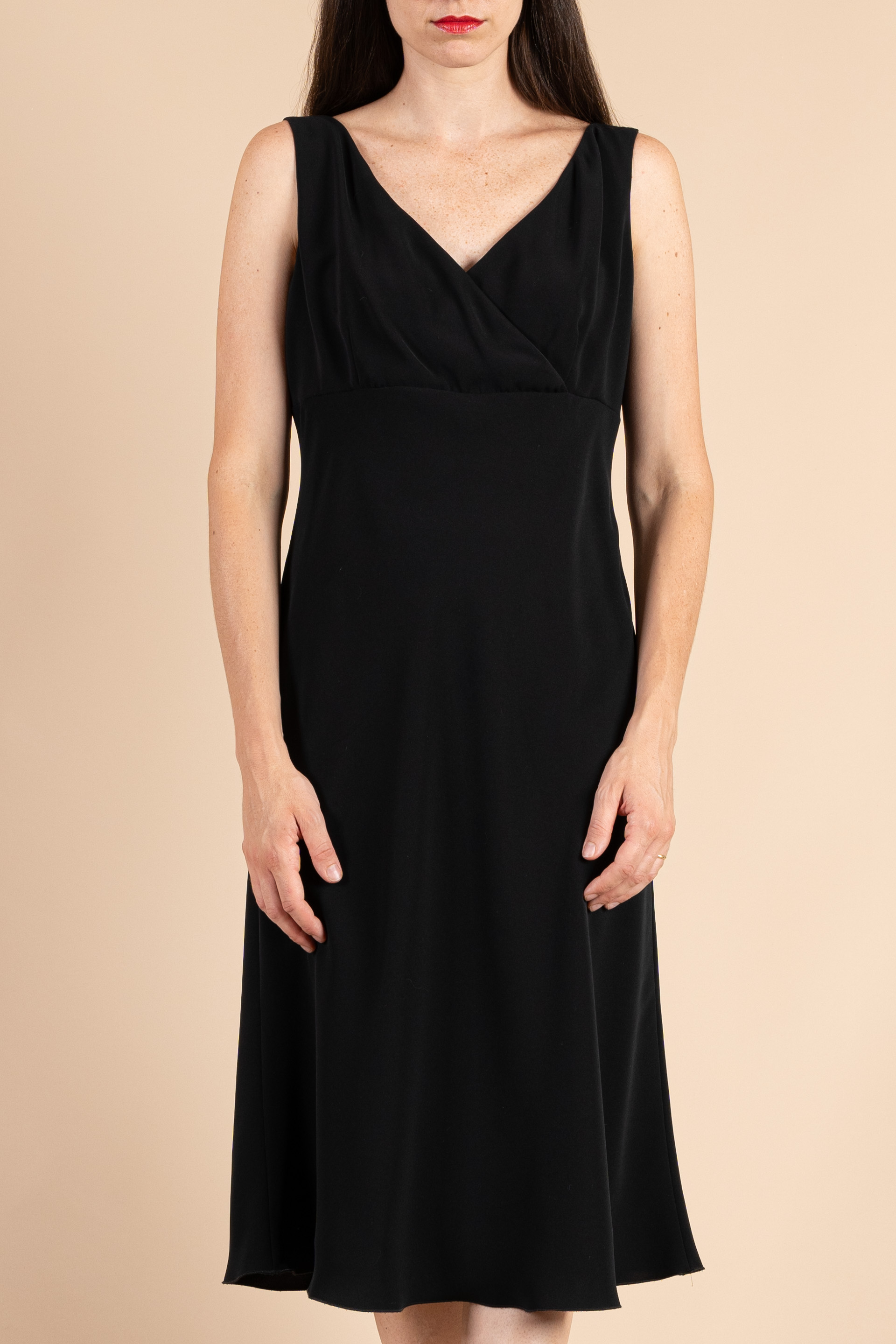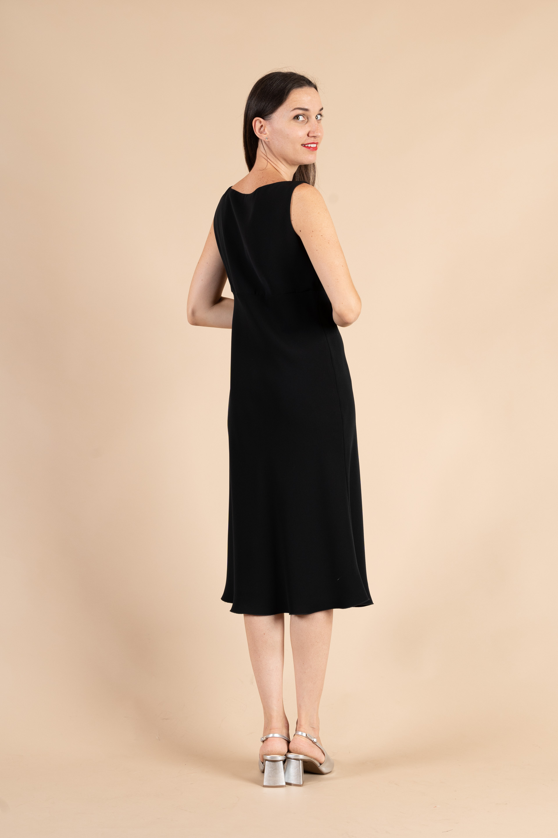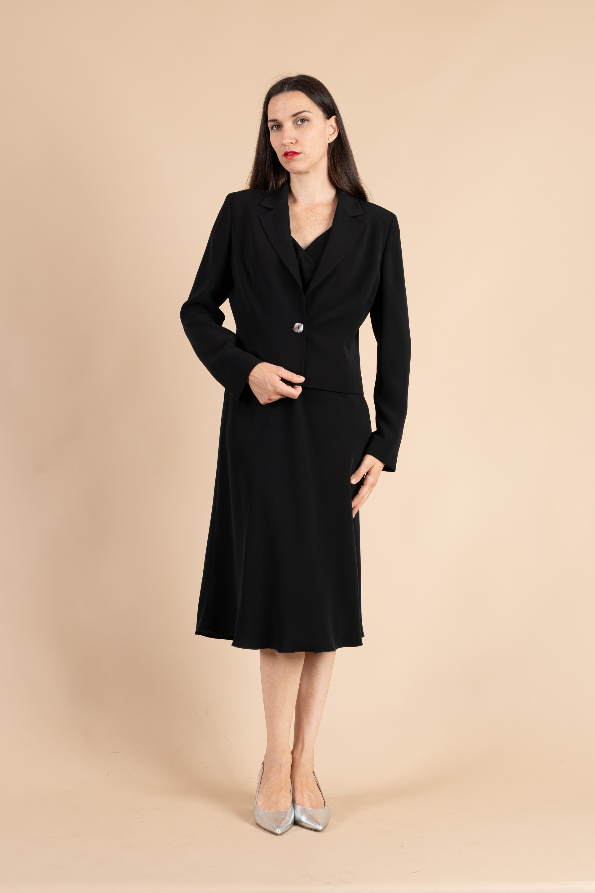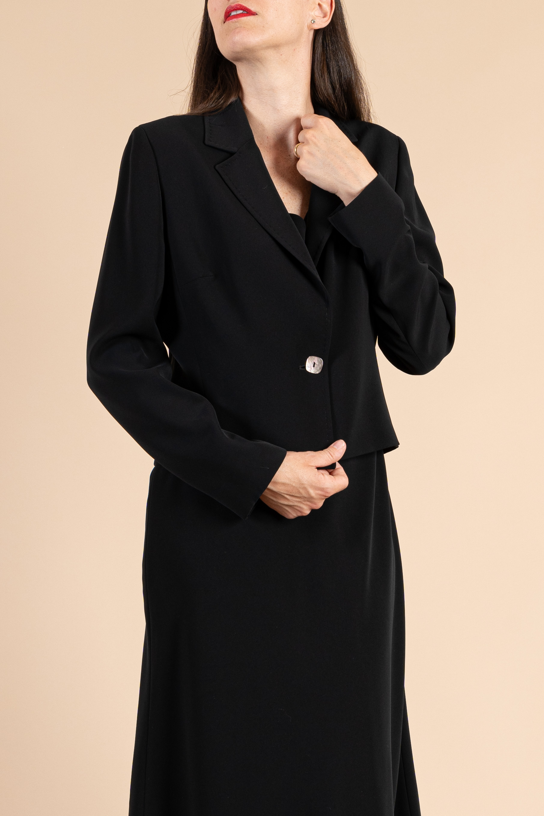 Completo cerimonia donna color nero realizzato in tessuto cady, composto da giacca un bottone e abito liscio incrosciato sul seno.