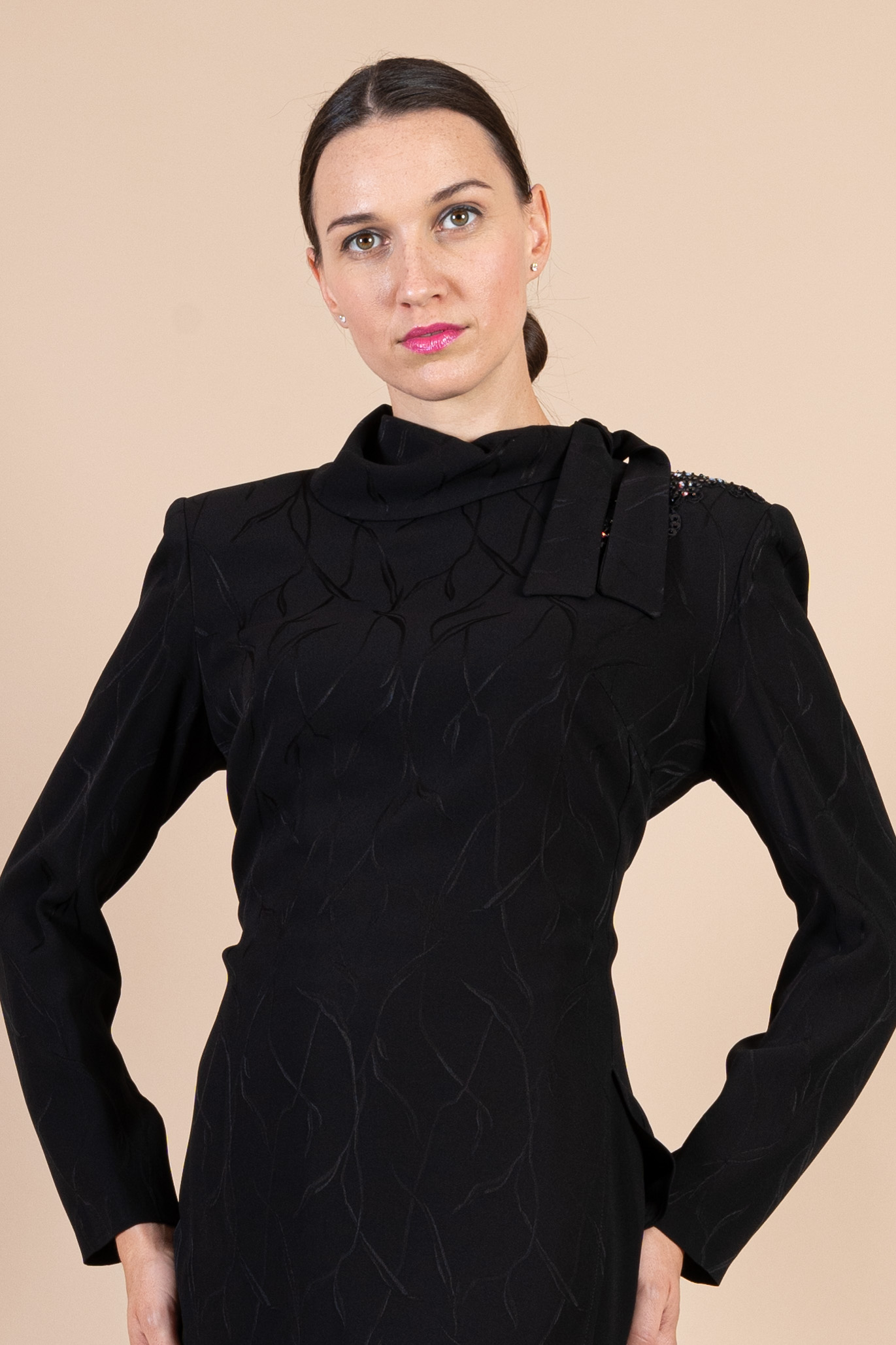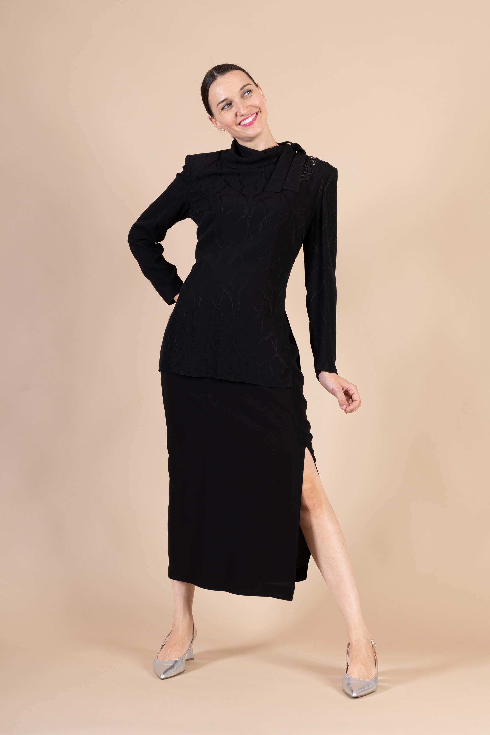 Completo cerimonia donna color nero, composto da giacca con tessuto cady operato e impreziosita da applicazione in pizzo sulla spalla e fiocco, con gonna liscia con spacco.