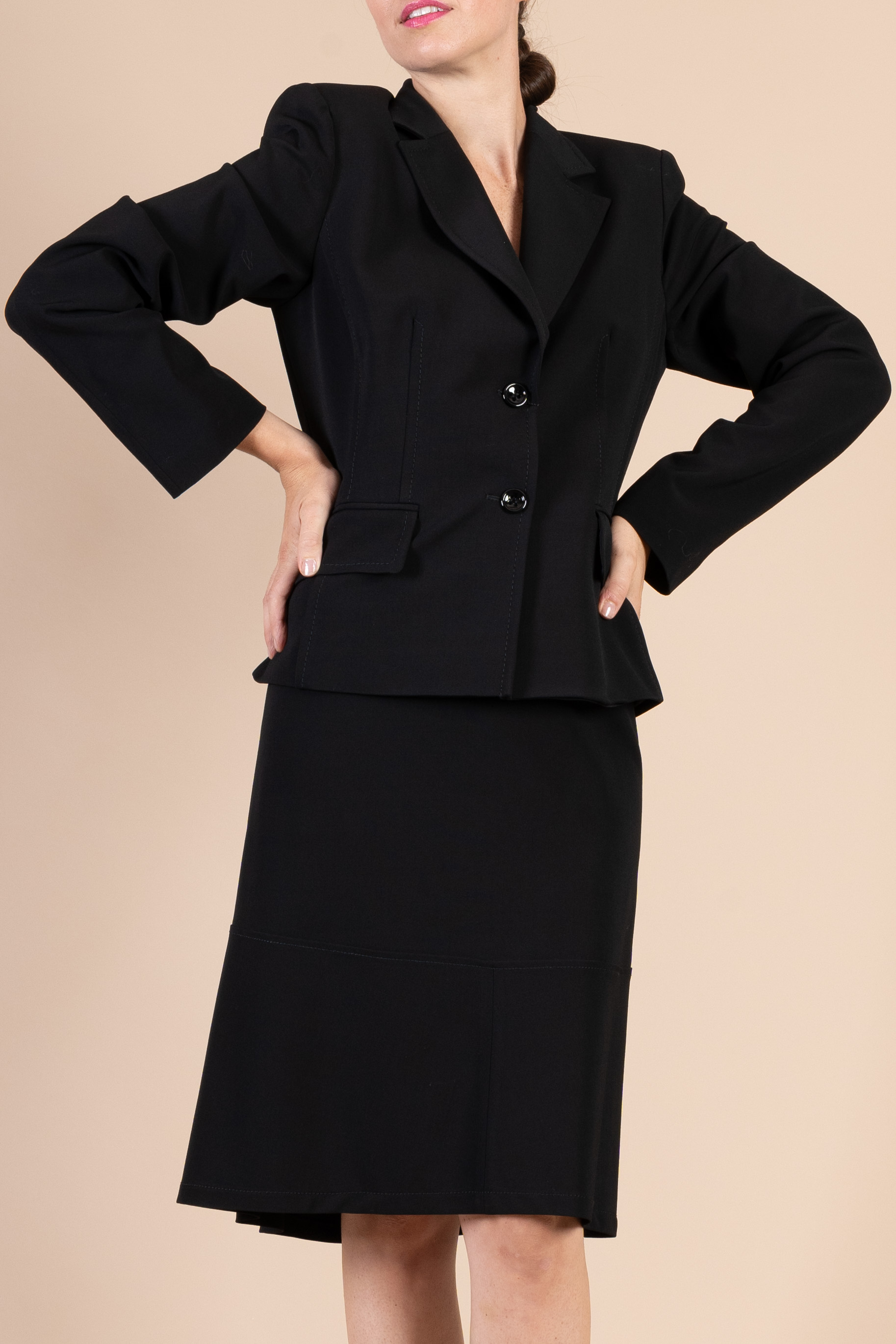 Completo cerimonia donna color nero realizzato in tessuto jersey, composto da giacca e gonna.