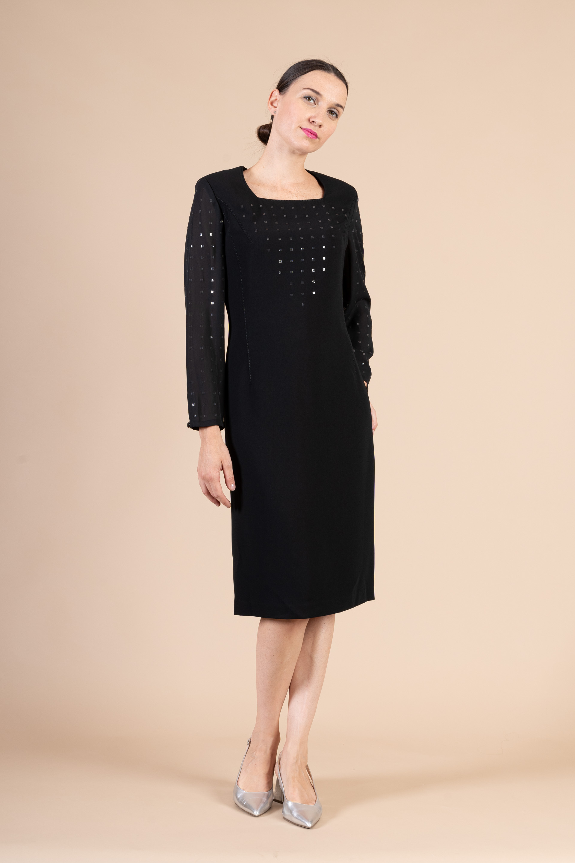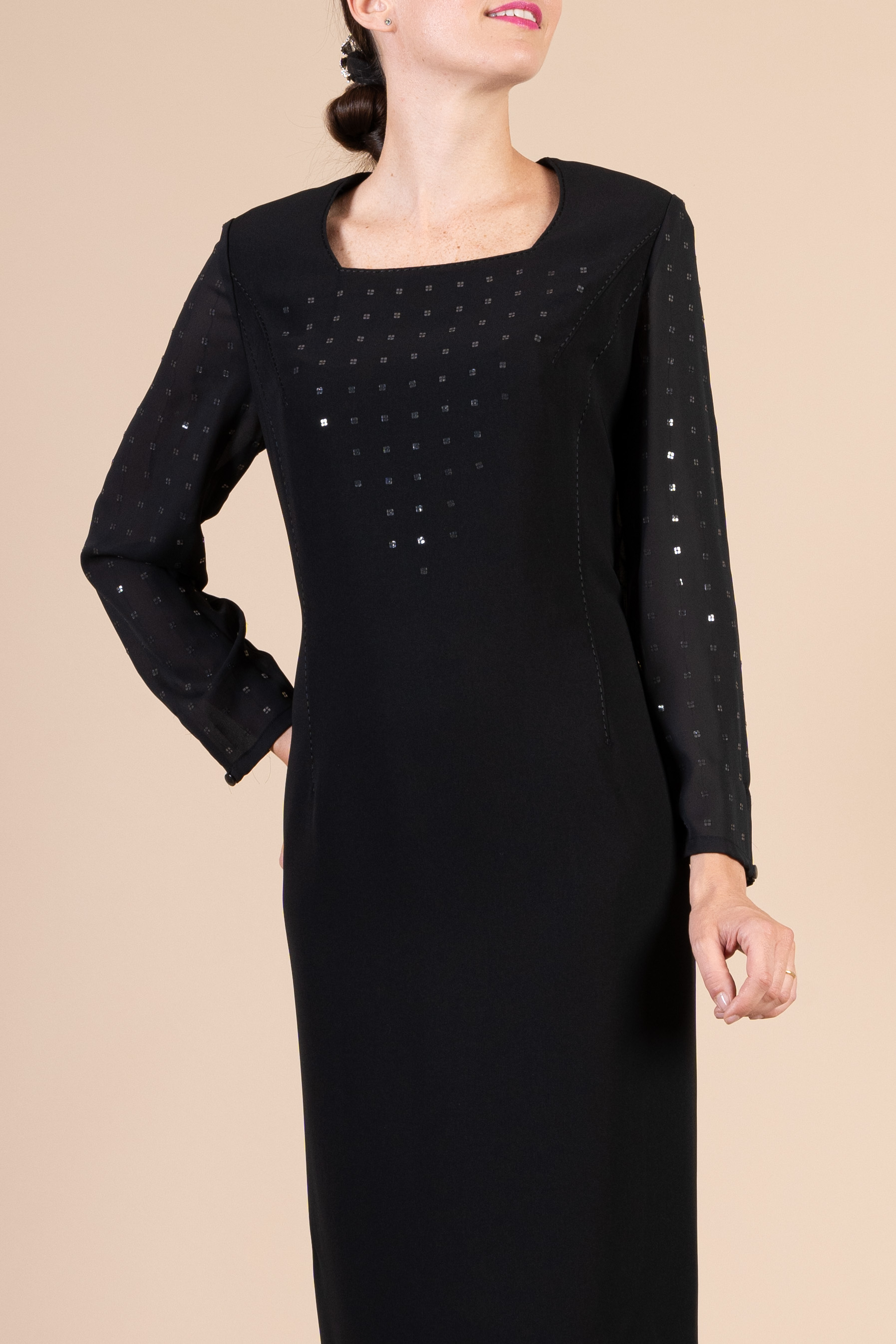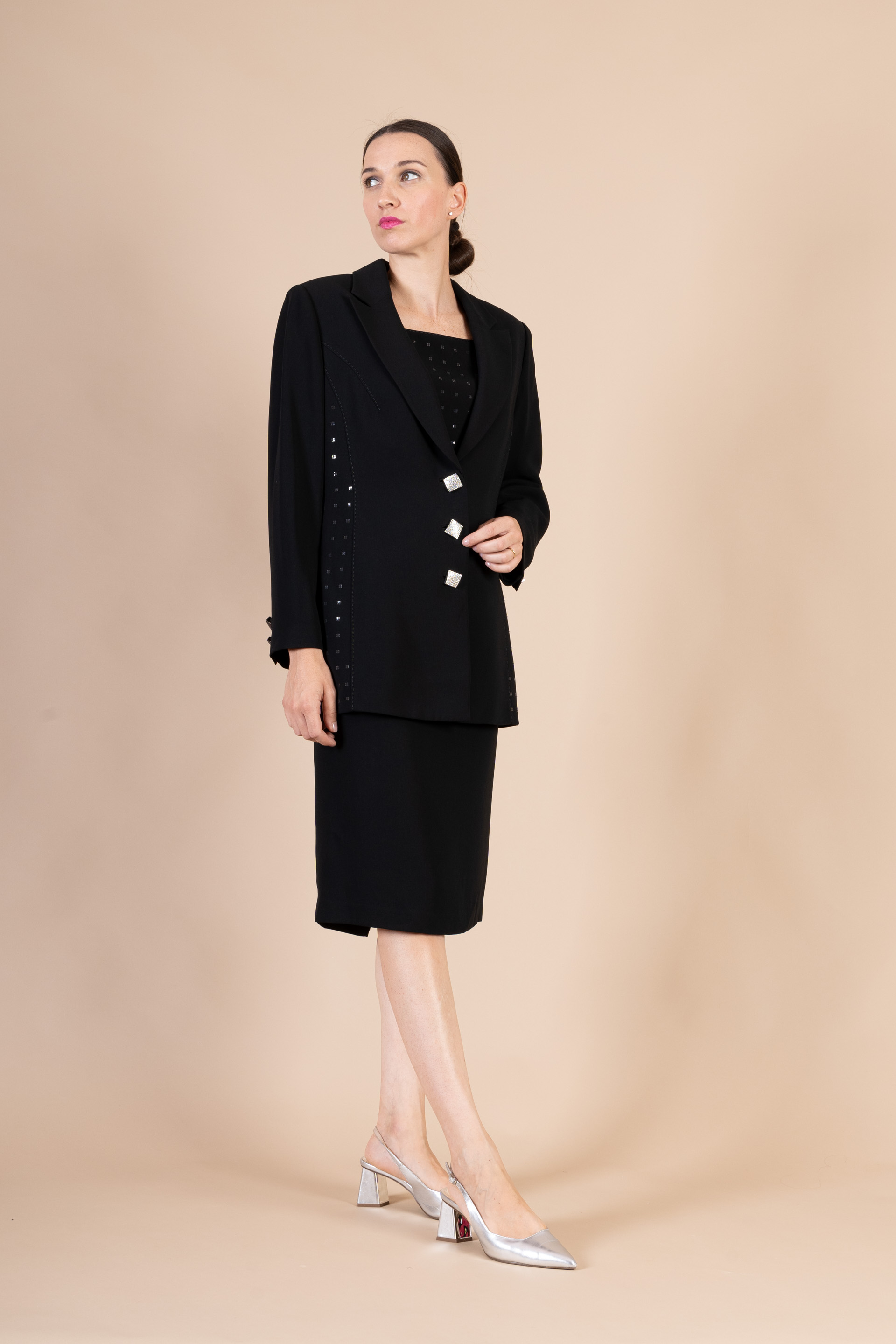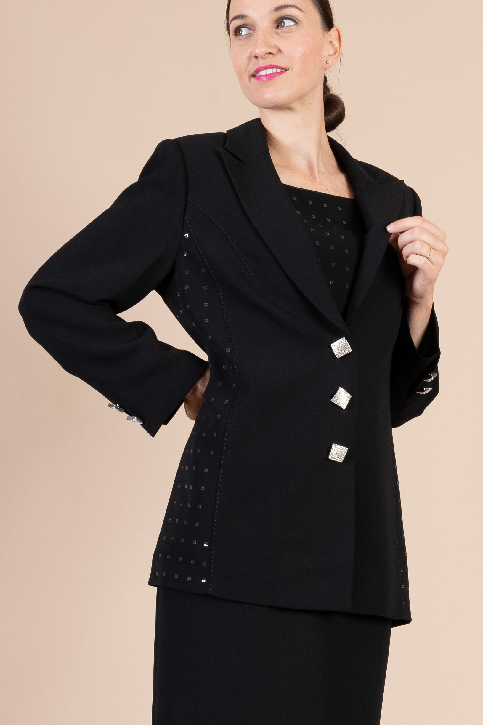 Completo cerimonia donna color nero realizzato in tessuto di cady e chiffon, composto da giacca e abito impreziosito da bottoni gioiello.