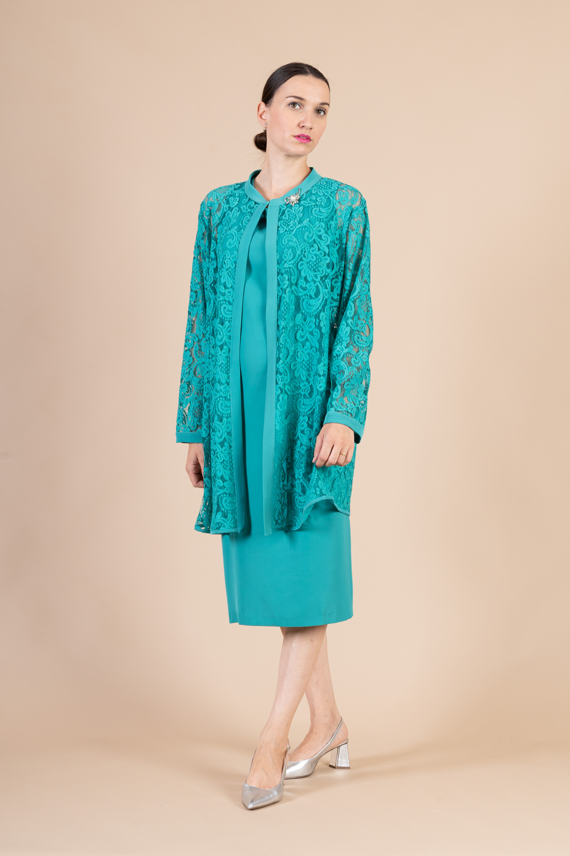 Elegantissimo completo cerimonia donna composto da tubino dal taglio classico lunghezza midi realizzato in maglina e soprabito realizzato in raffinato pizzo rebrodè nel color verde ottanio chiaro.
