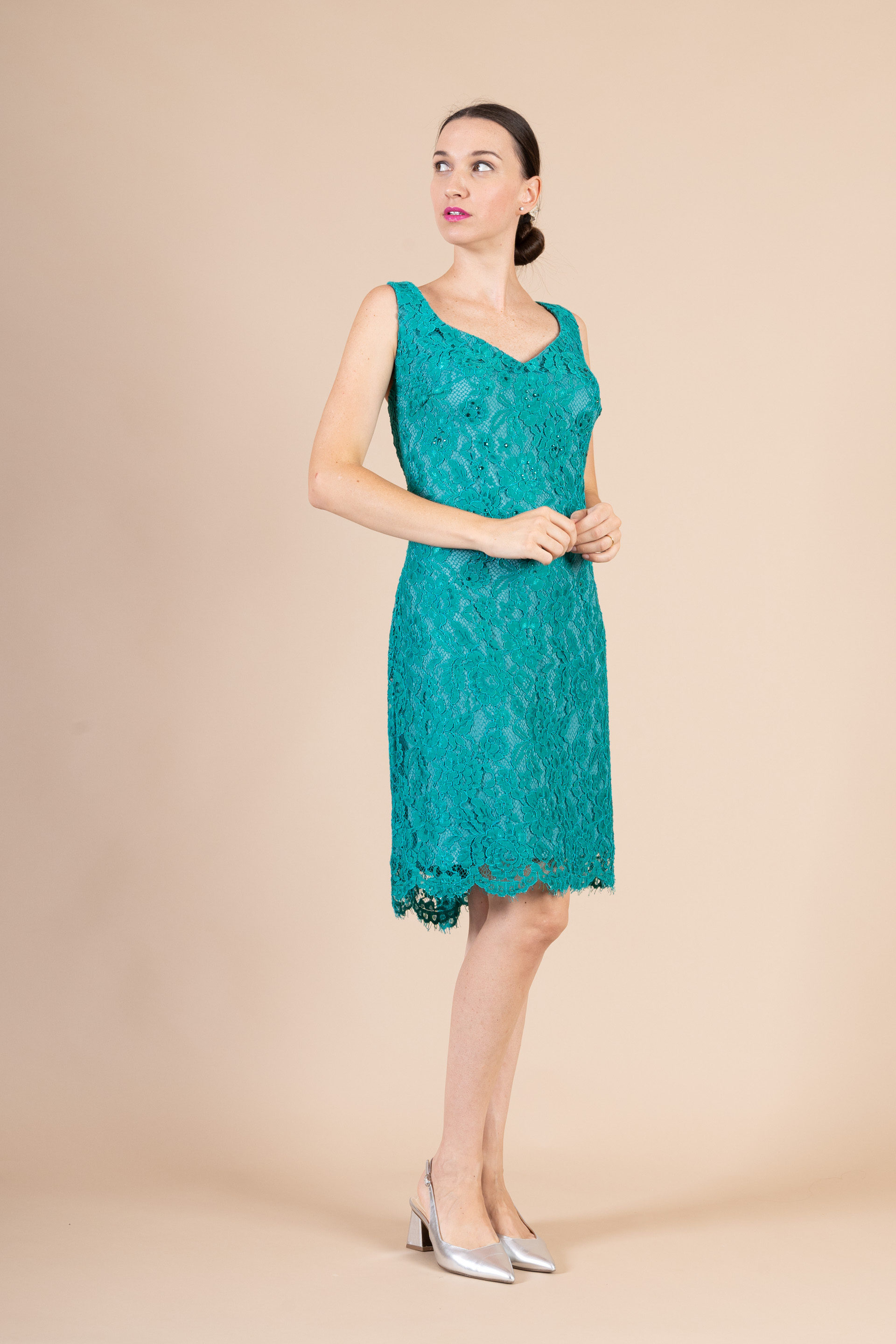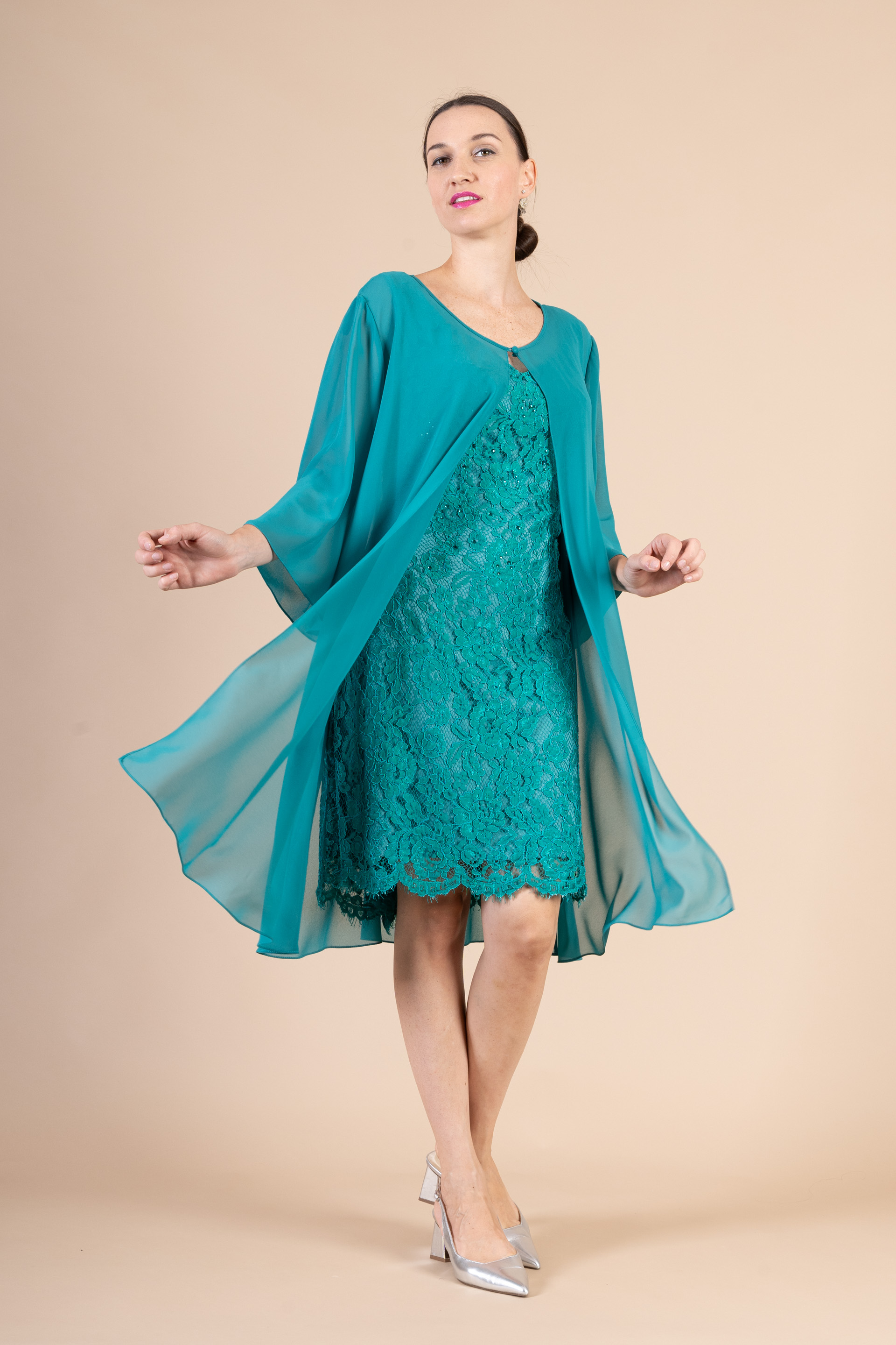 Elegantissimo completo cerimonia donna composto da tubino corto dal taglio classico, smanicato, realizzato in pizzo rebrodè e soprabito realizzato in morbidissimo tessuto chiffon, in color ottanio.