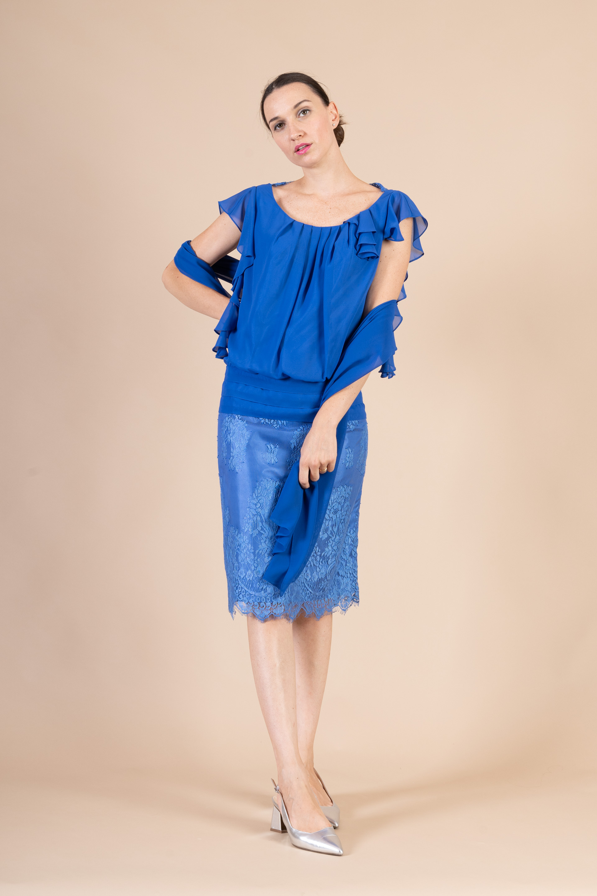 Originale abito cerimonia donna corto bluette realizzato in pizzo e chiffon, un abito adatto a non passare inosservate con seducenti trasparenze.