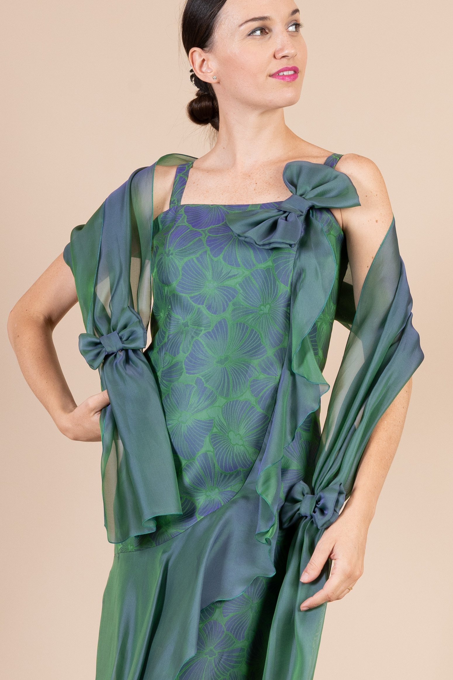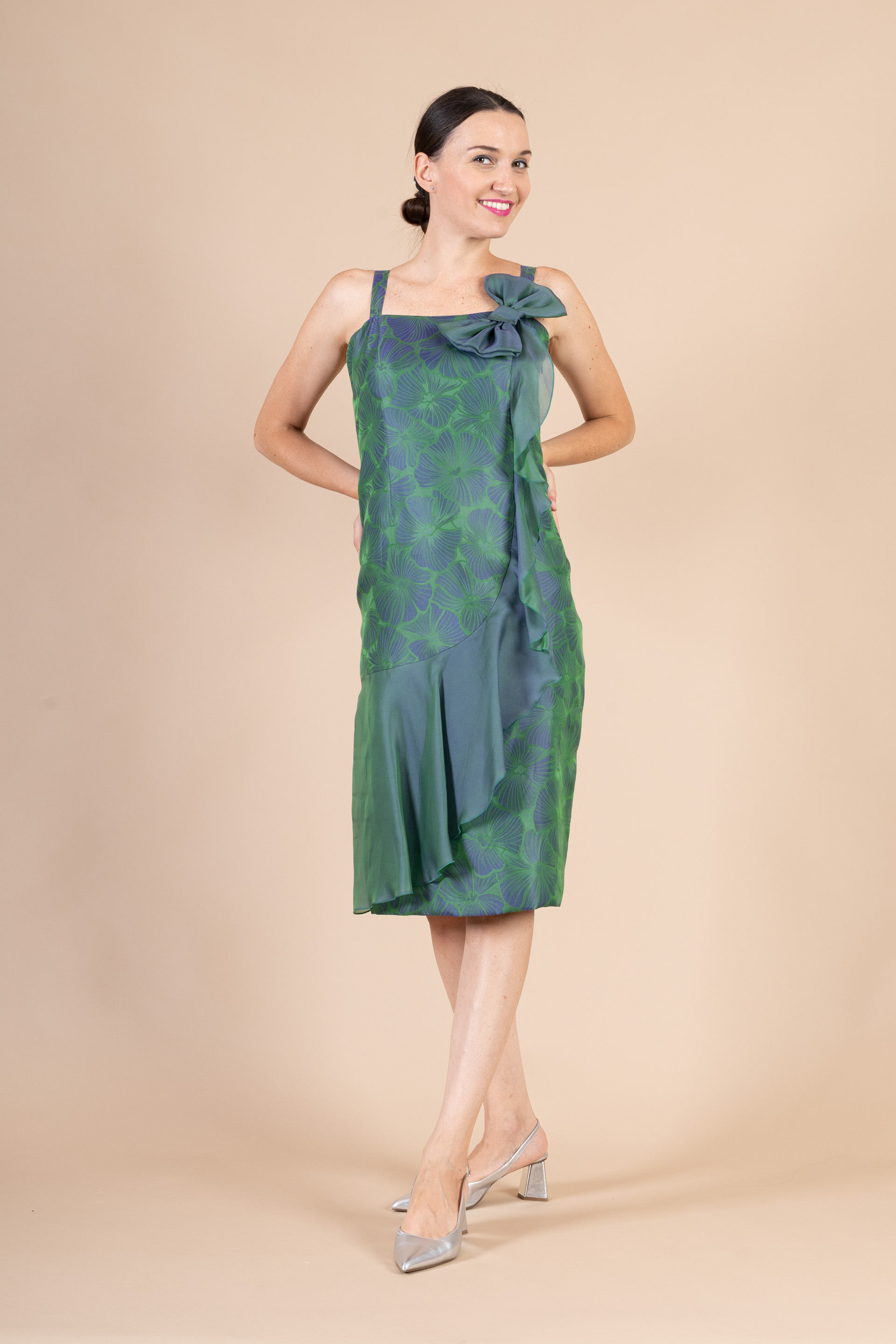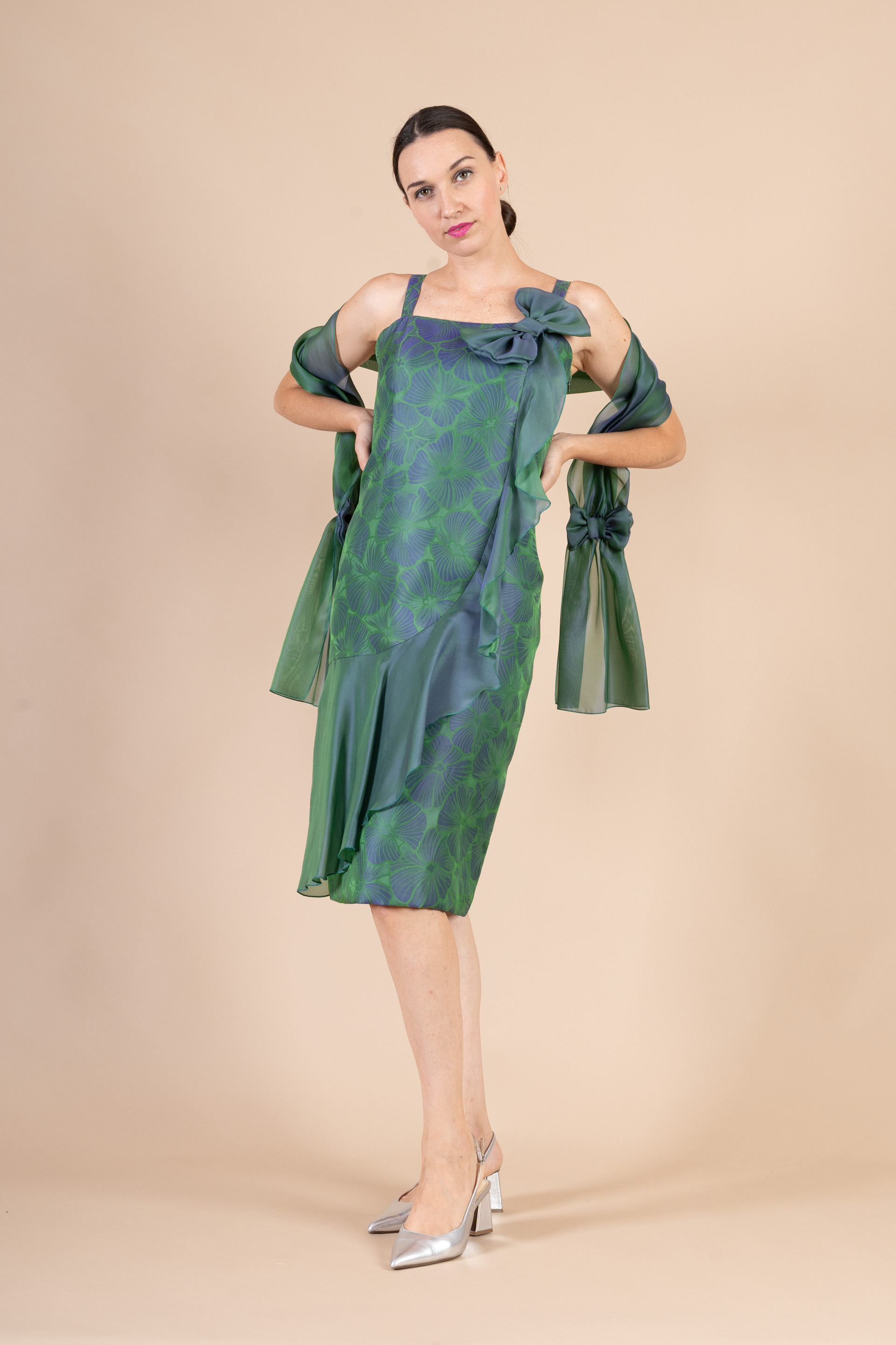 Particolare abito corto da cerimonia donna, dalla linea a tubino con spallina impreziosito da rouge e fiocco (removibile) realizzato in tessuto di organza fantasia nei toni del verde scuro e blu.
