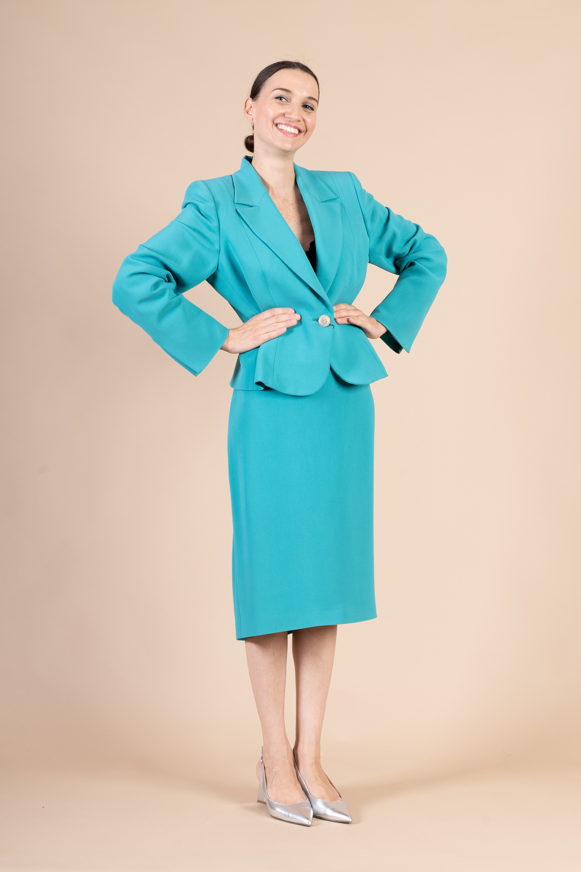 Completo cerimonia donna realizzato in tessuto di cady color verde Tiffany composto da giacca e gonna ed impreziosito da bottone gioiello.