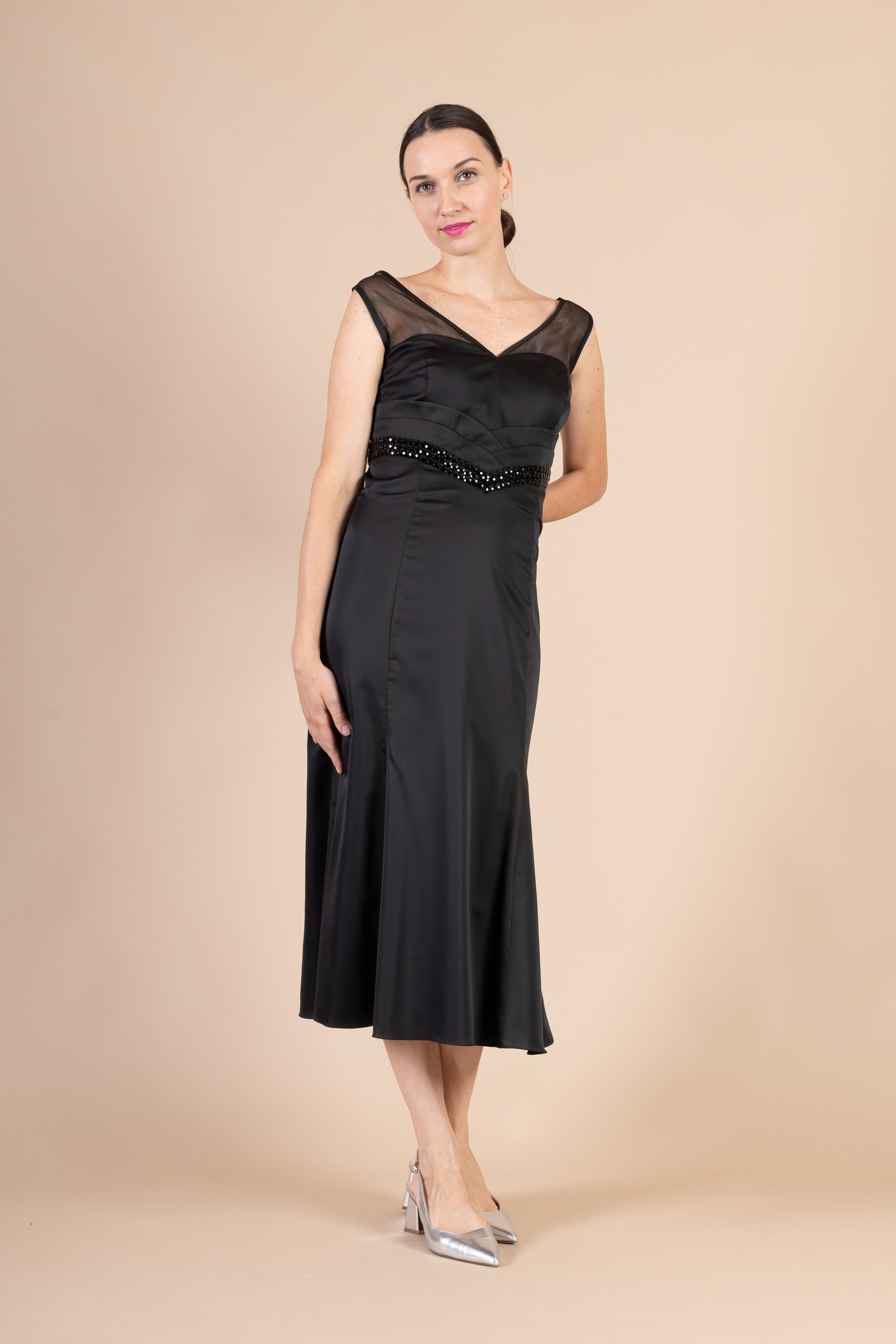Abito cerimonia donna lunghezza midi dalla linea svasata realizzato in tessuto di raso con scollatura in traspareenza di tulle ed impreziosito da ricamo cristalli tono su tono.