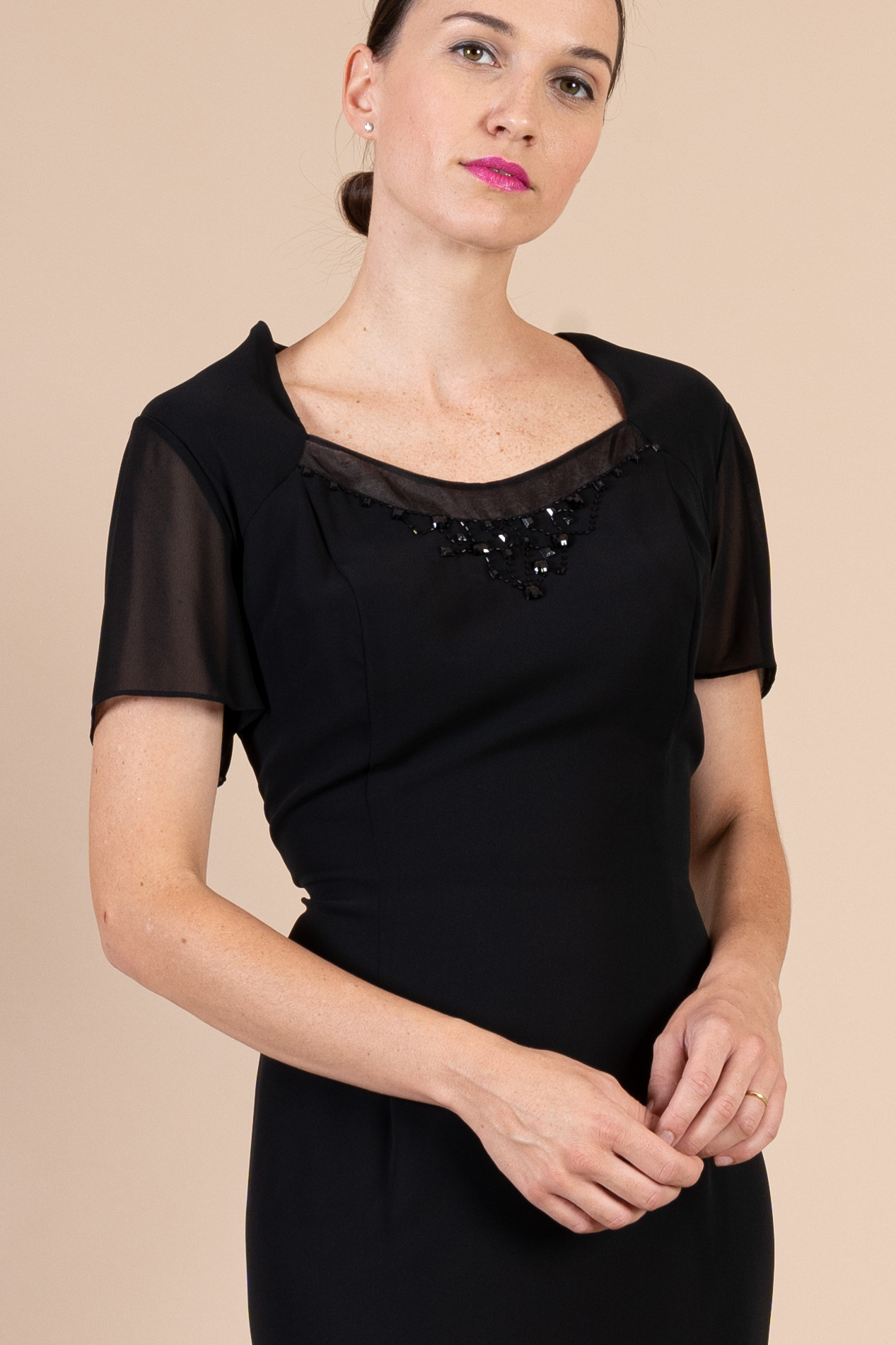 Abito cerimonia donna corto alla linea a tubino con manichetta realizzato in tessuto di voile impreziosito da ricamo sul décolleté tono su tono nero.