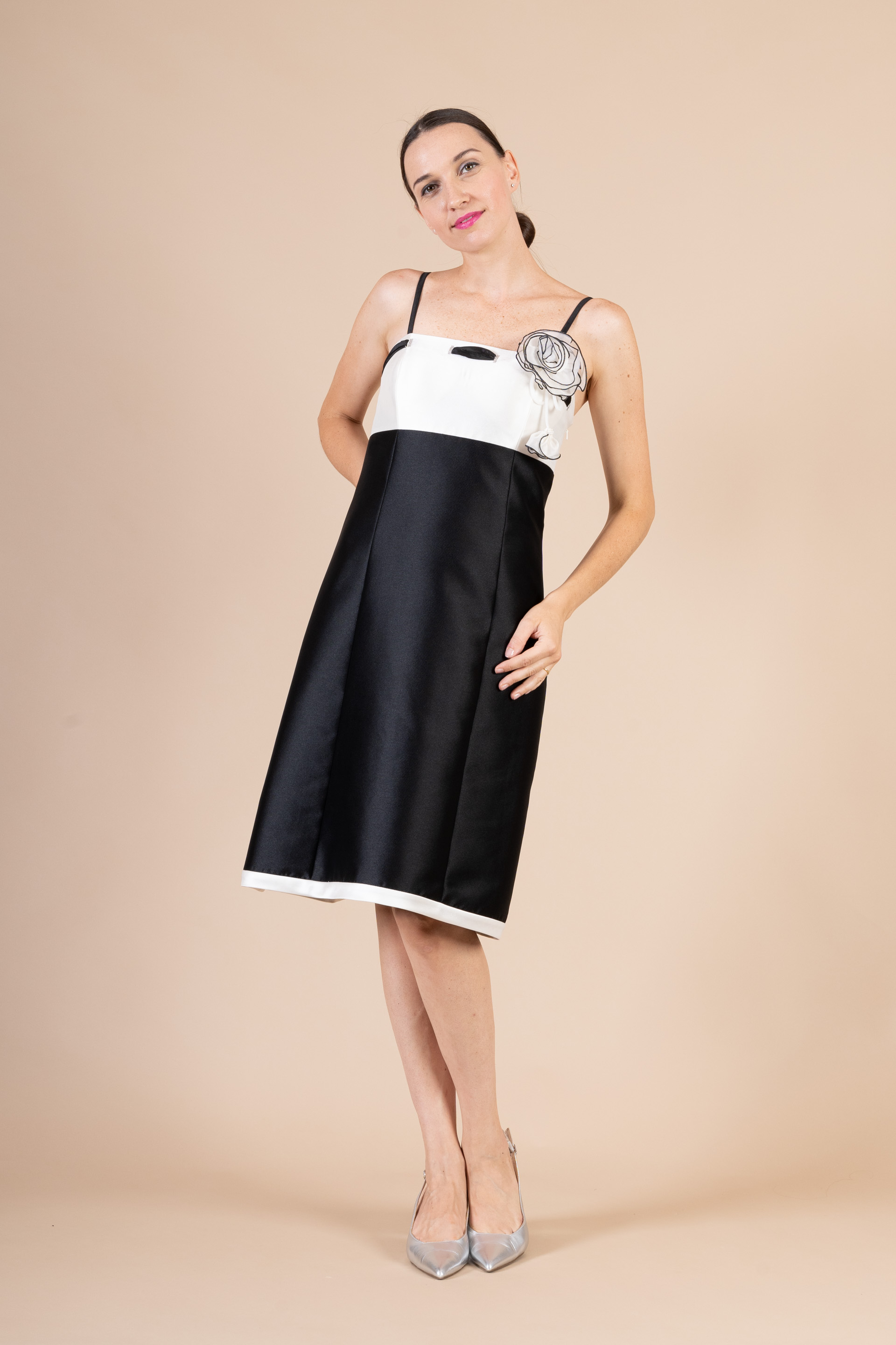 Abito corto cerimonia donna con spallina sottile realizzato in tessuto di mikado bicolore nero/avorio impreziosito da applicazione floreale.