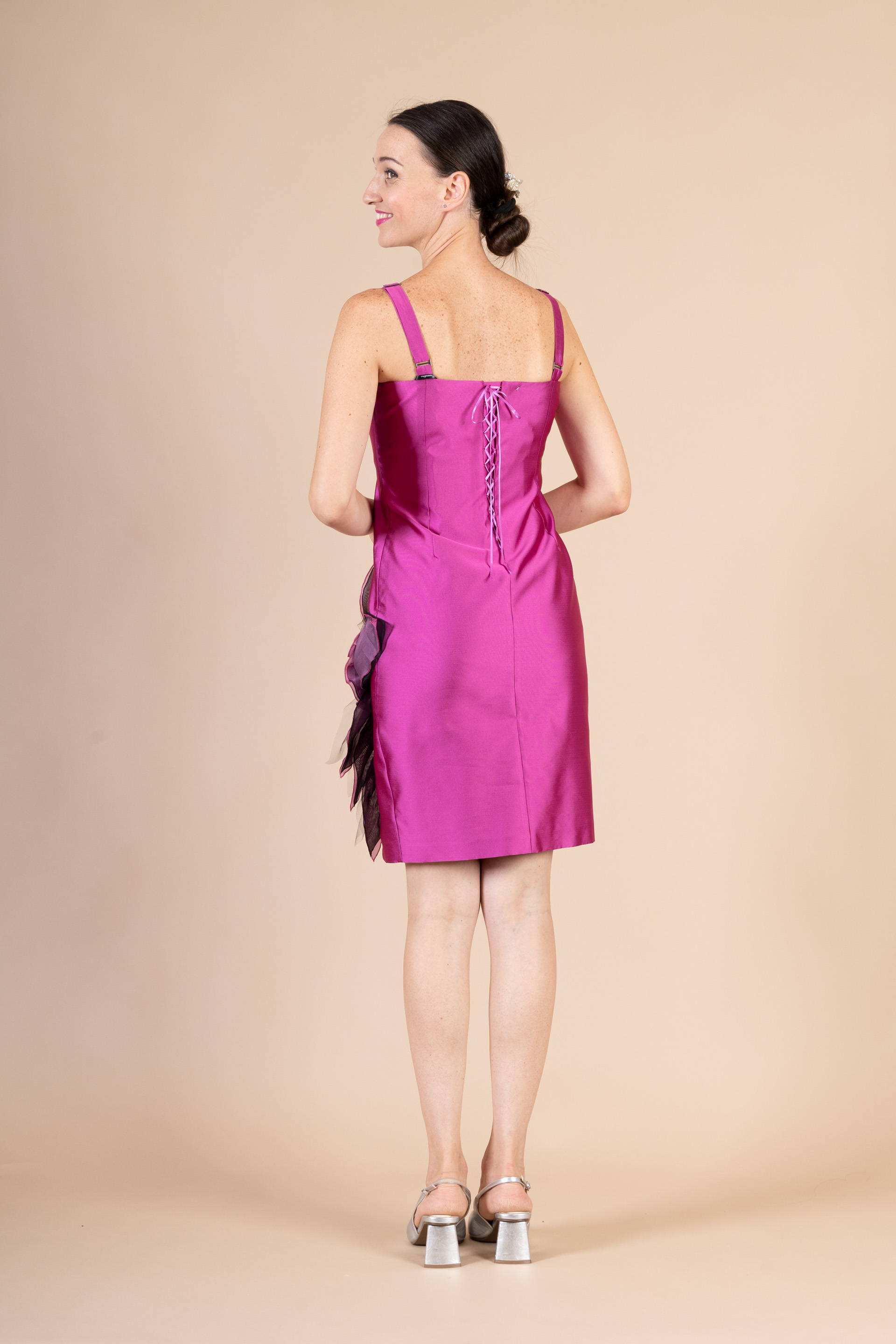 Particolare abito corto da cerimonia donna realizzato in tessuto di mikado, dalla linea a tubino con spallina impreziosito da applicazione in organza floreale sopra lo spacco in color rosa ciclamino.