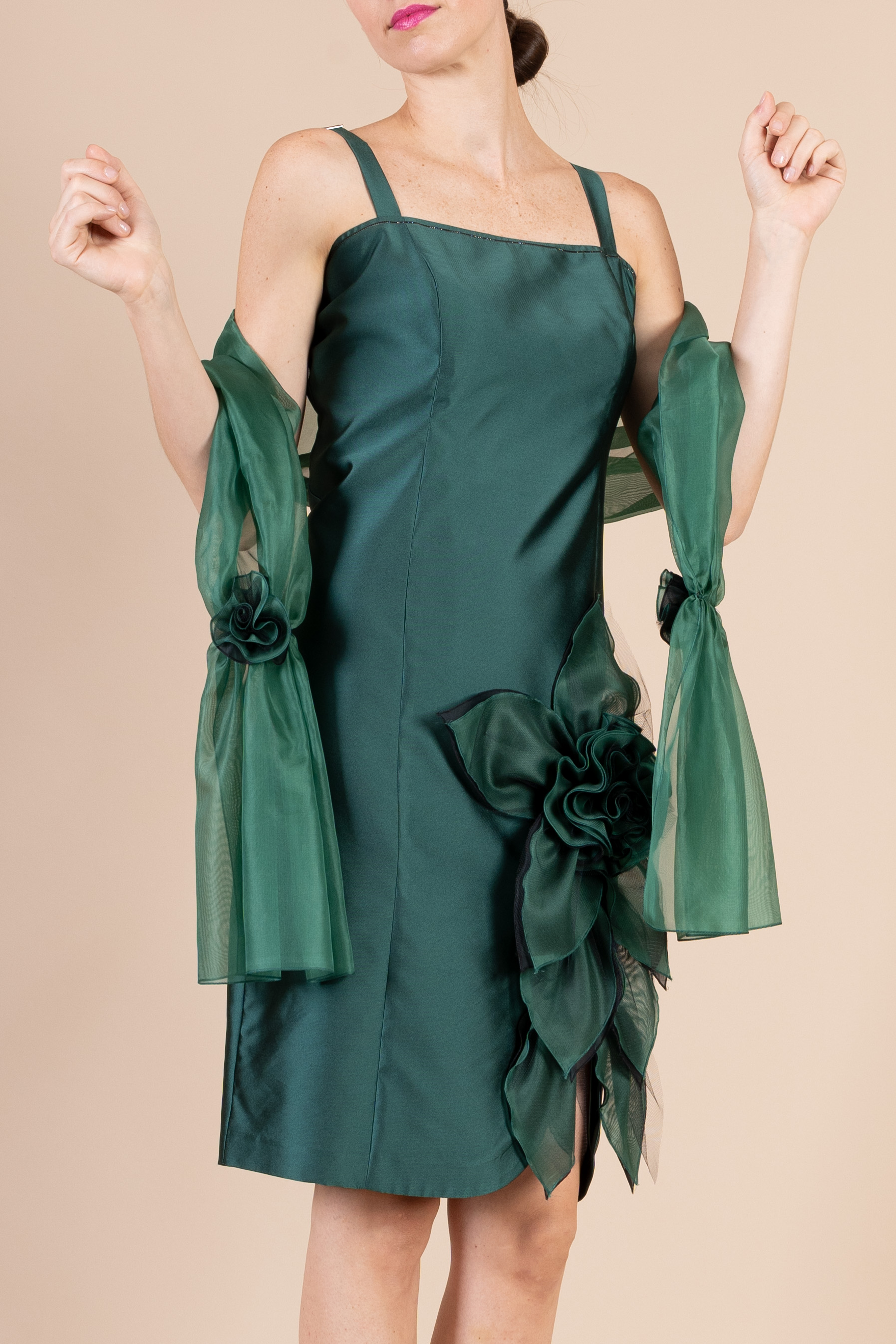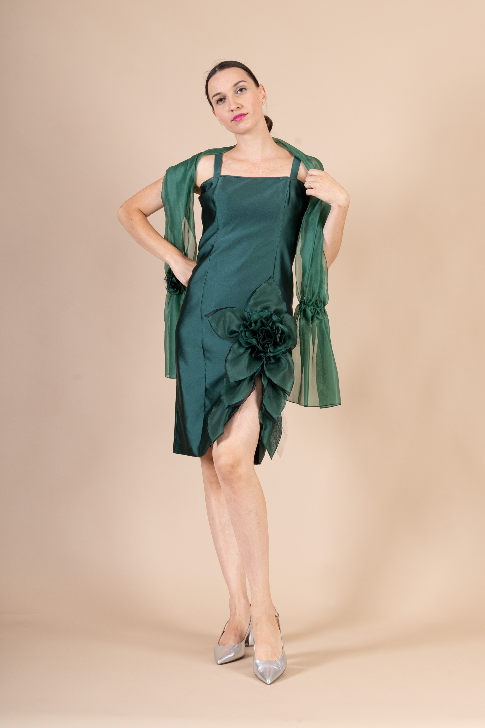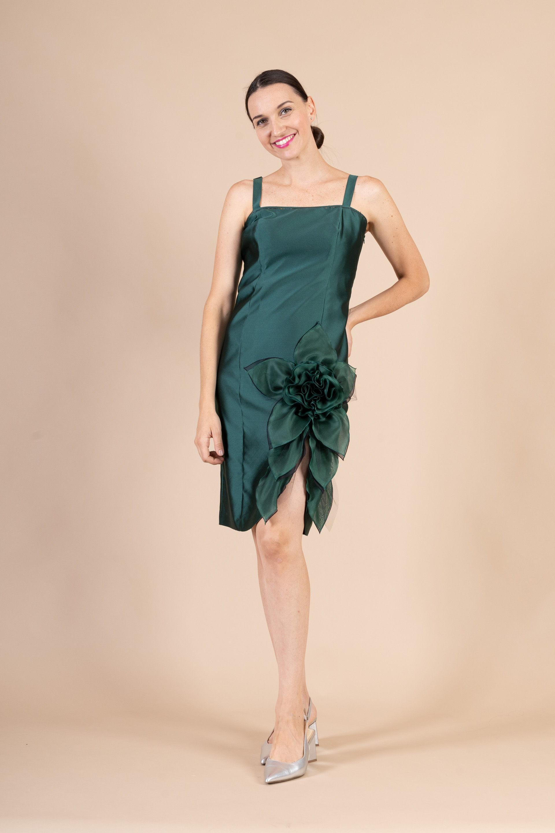 Particolare abito corto da cerimonia donna realizzato in tessuto di mikado, dalla linea a tubino con spallina impreziosito da applicazione in organza floreale sopra lo spacco in color verde bottiglia.