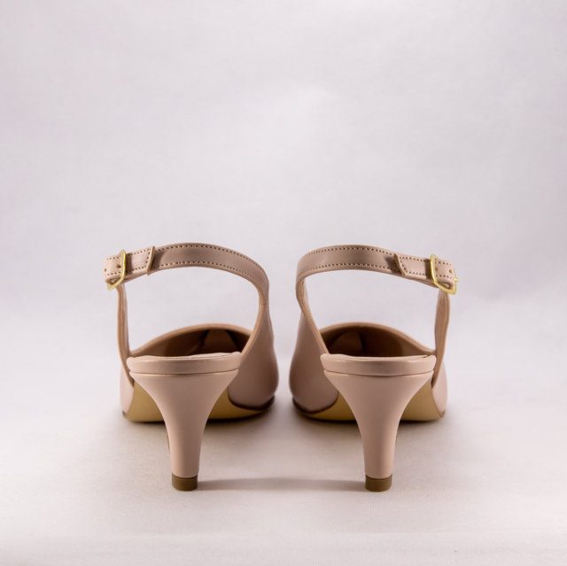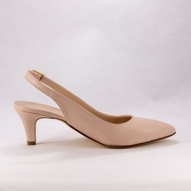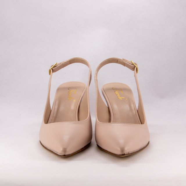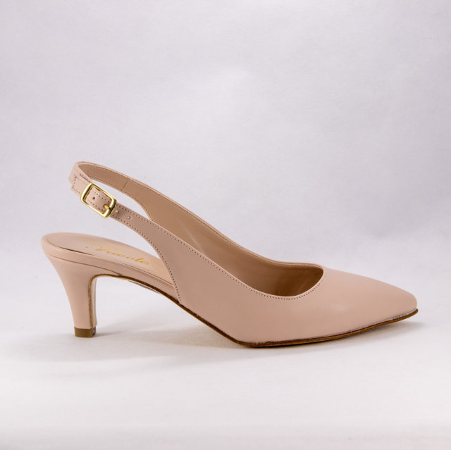 Scarpa dal colore neutro di facile abbinamento ai vari outfit, con il suo tacco d'altezza media è molto confortevole, la punta sfilata la rende molto elegante.