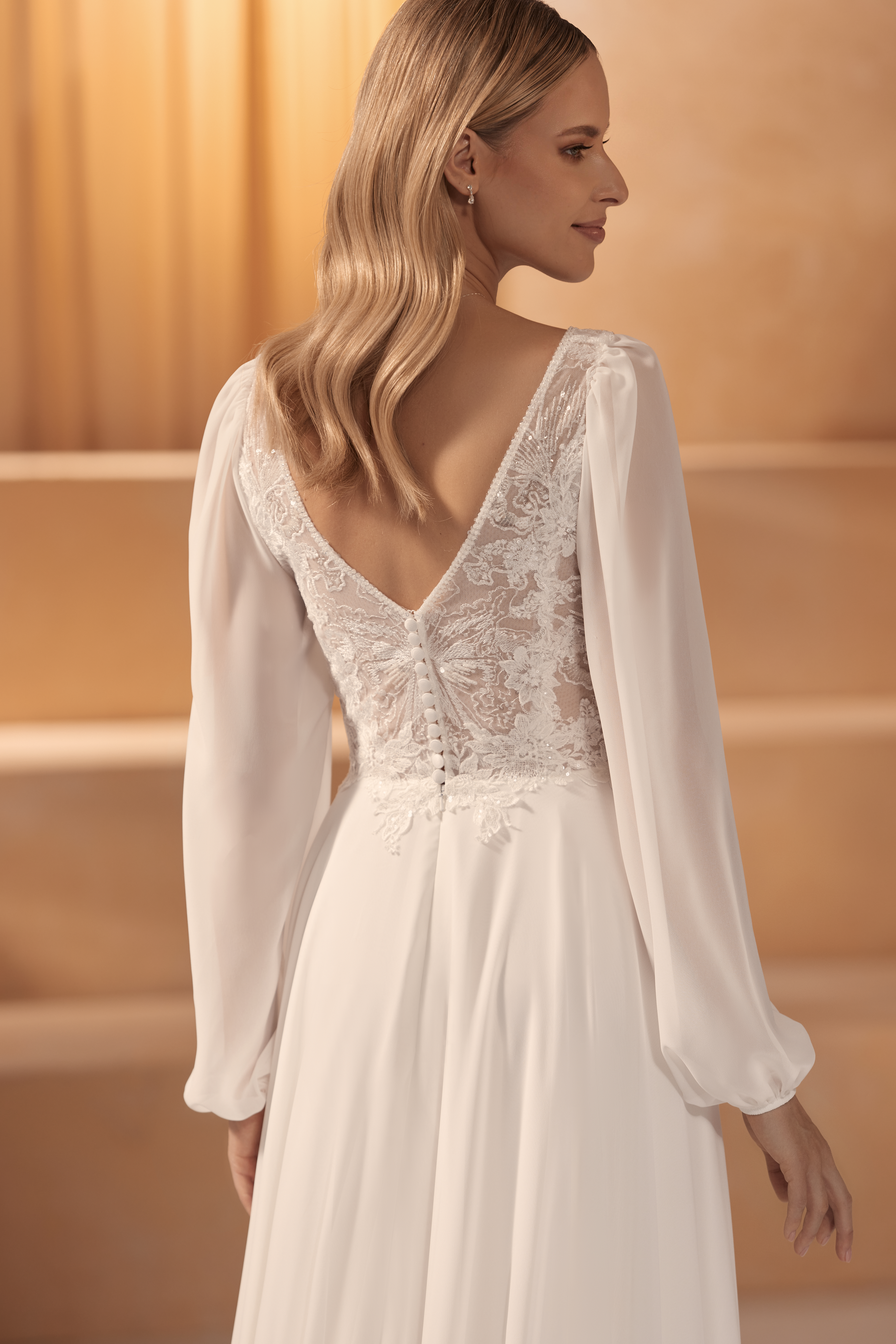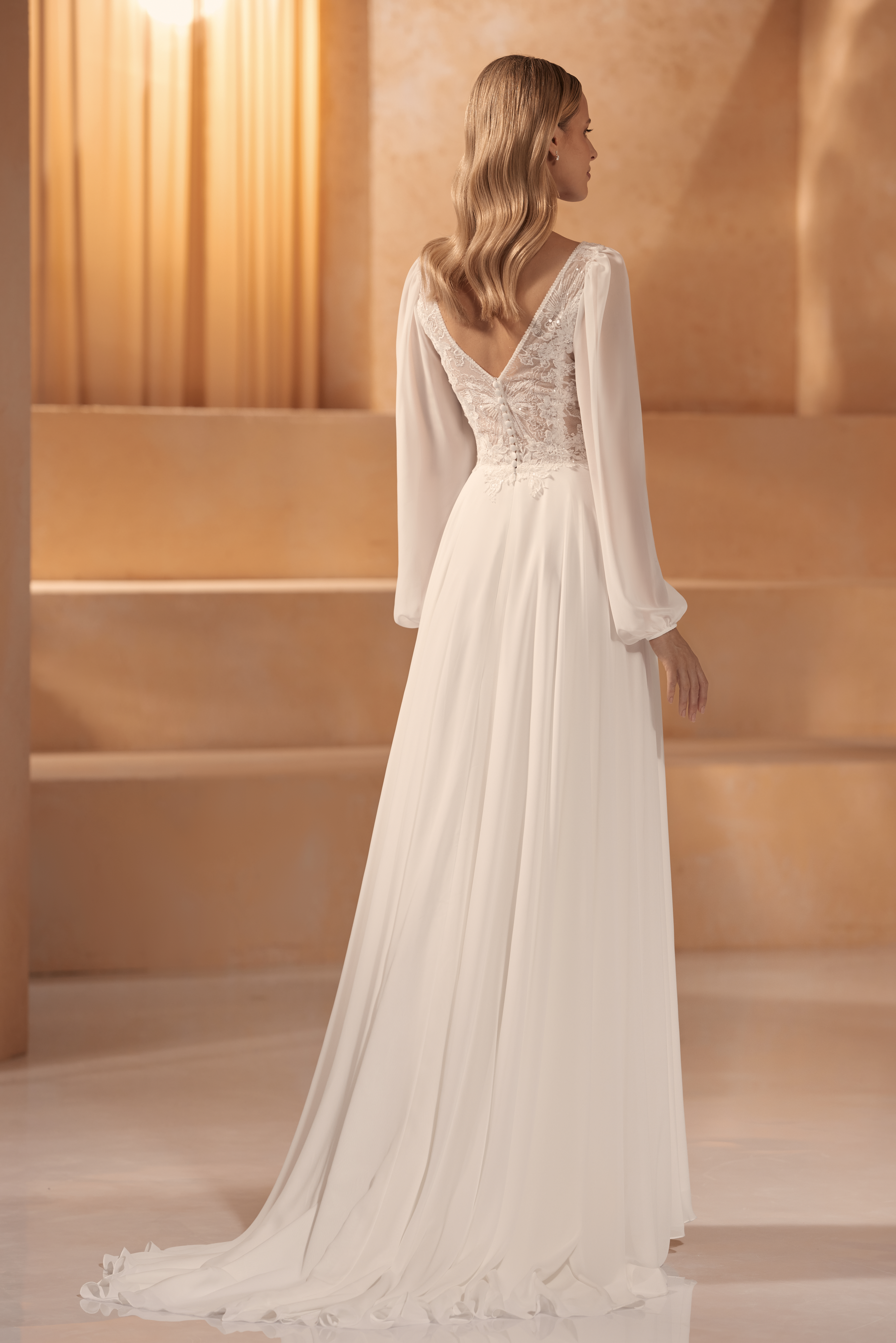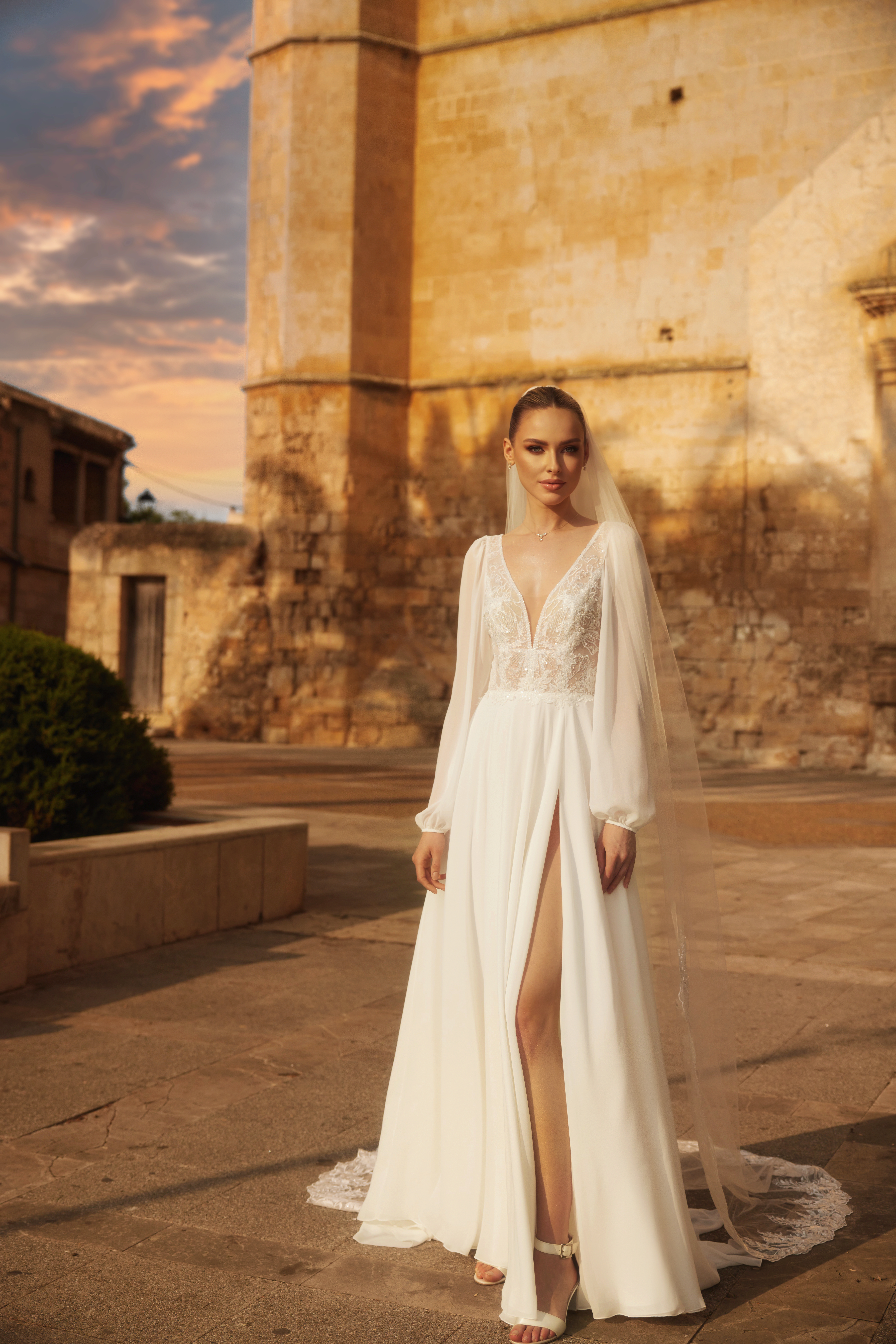 Particolare abito da sposa scivolato realizzato in tessuto chiffon con corpetto pizzo con scollo a V e morbide maniche a sbuffo, a rendere ancor più originale il modello un profondo spacco.