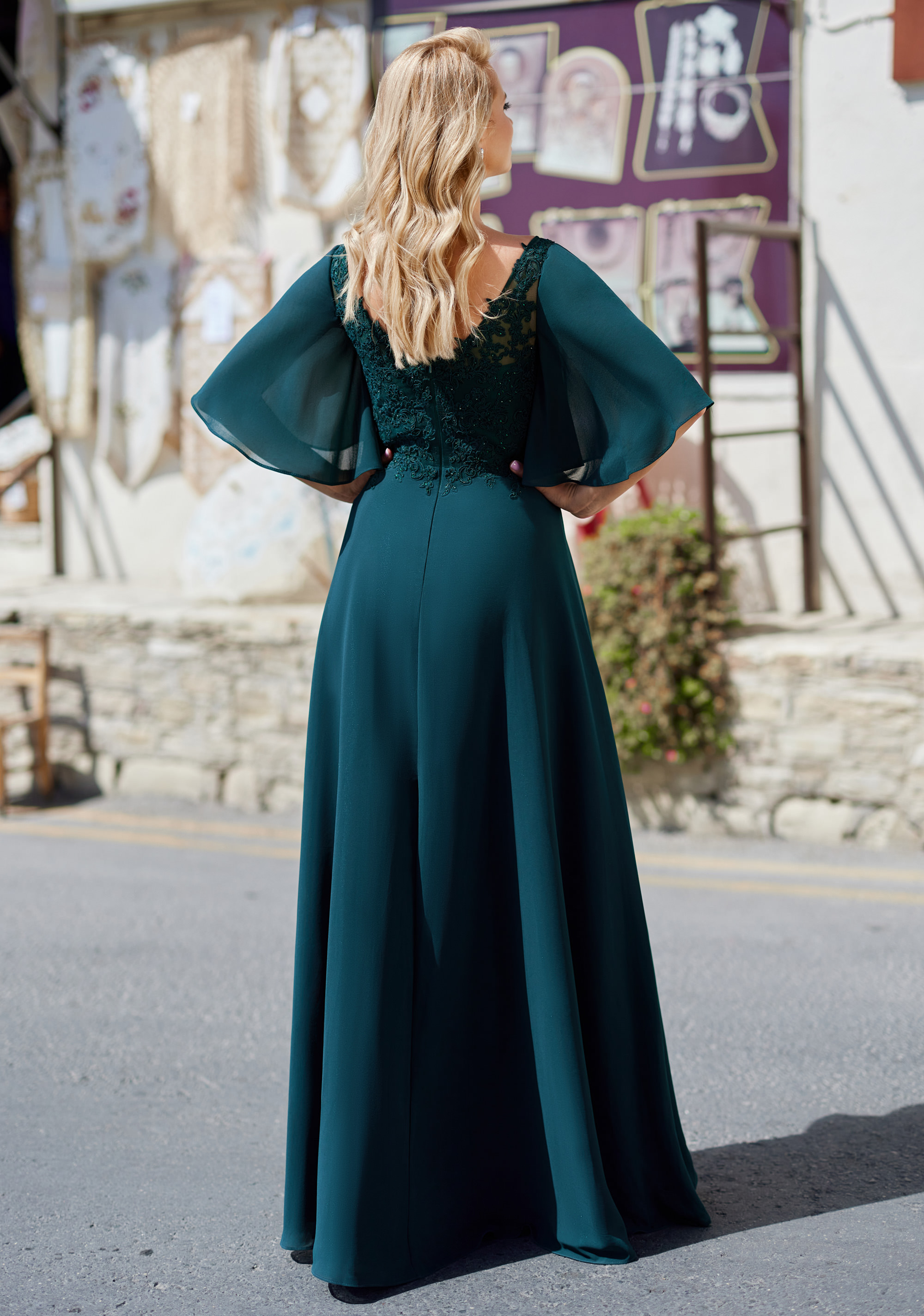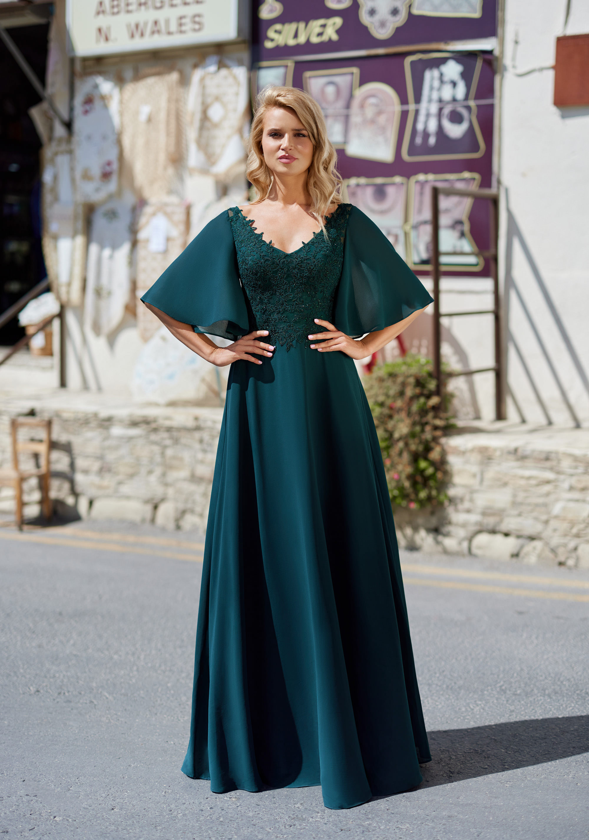 Abito cerimonia donna curvy lungo realizzato in tessuto di chiffon color verde bottiglia con corpetto pizzo ricamato e maniche ampie e fluide.